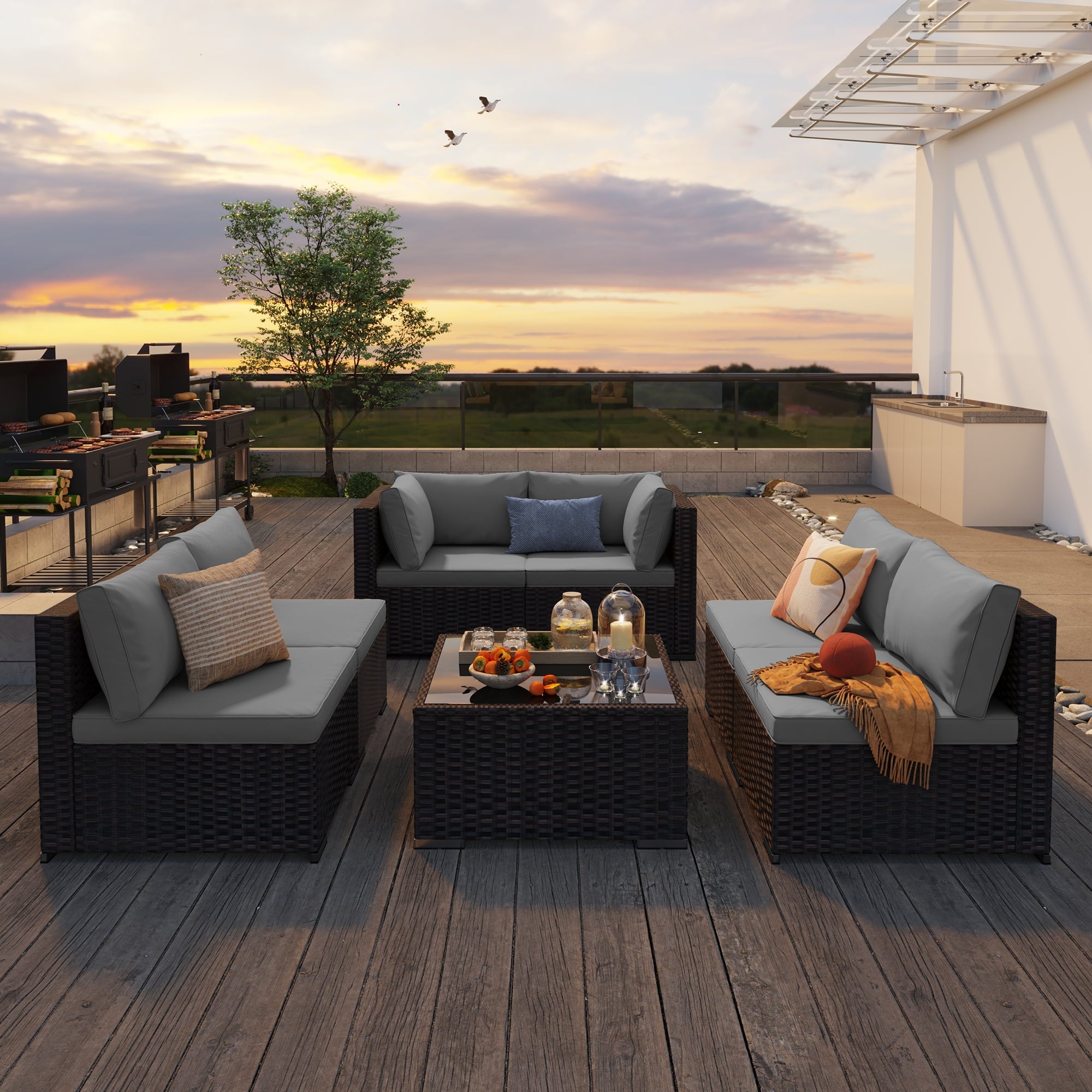 The sleek black wicker and neutral gray cushions complement modern outdoor decor. The tempered glass coffee table provides a durable surface for drinks and snacks while adding elegant sophistication.