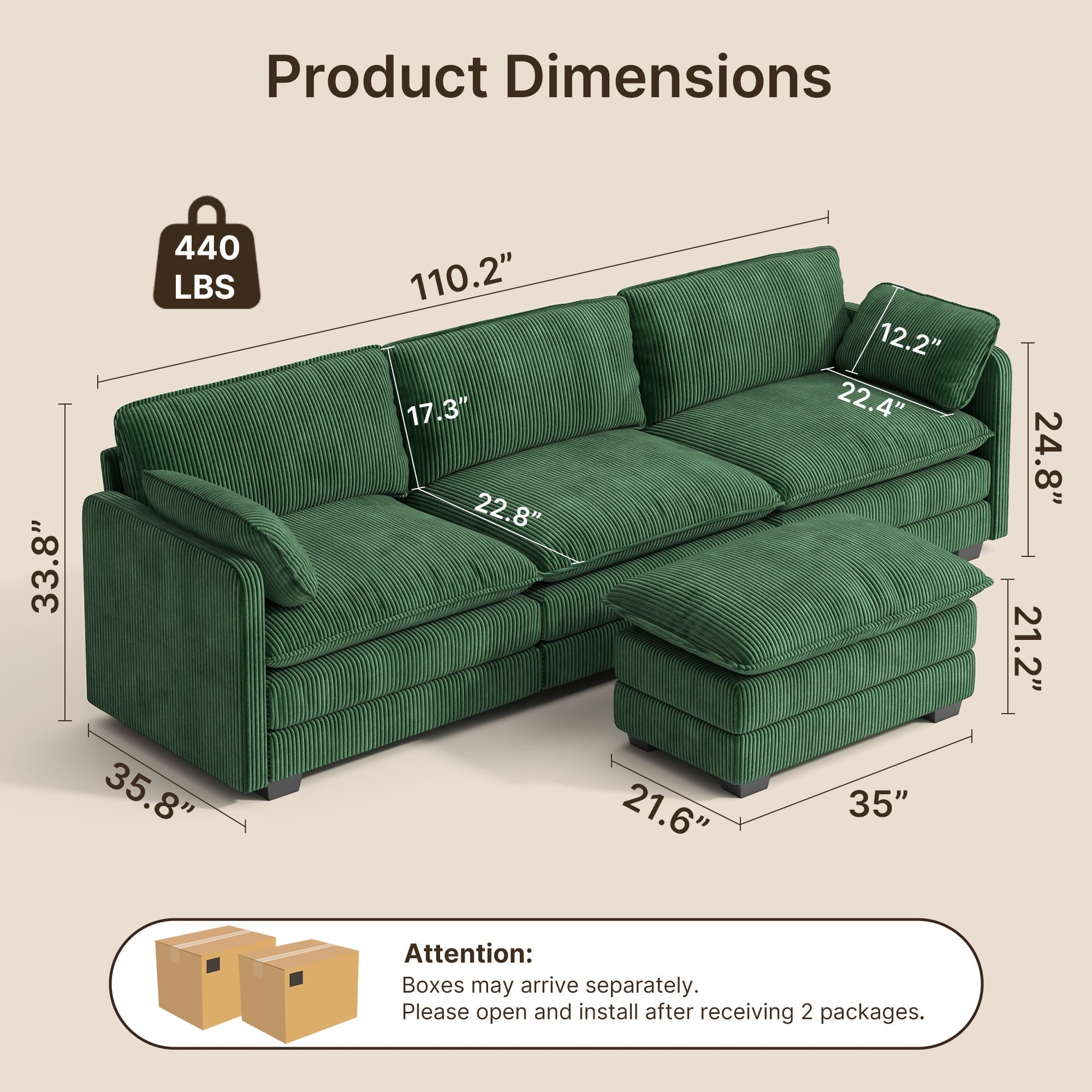 - Sofa size: 35.8 × 33.8 × 110.2in (D× H× W)