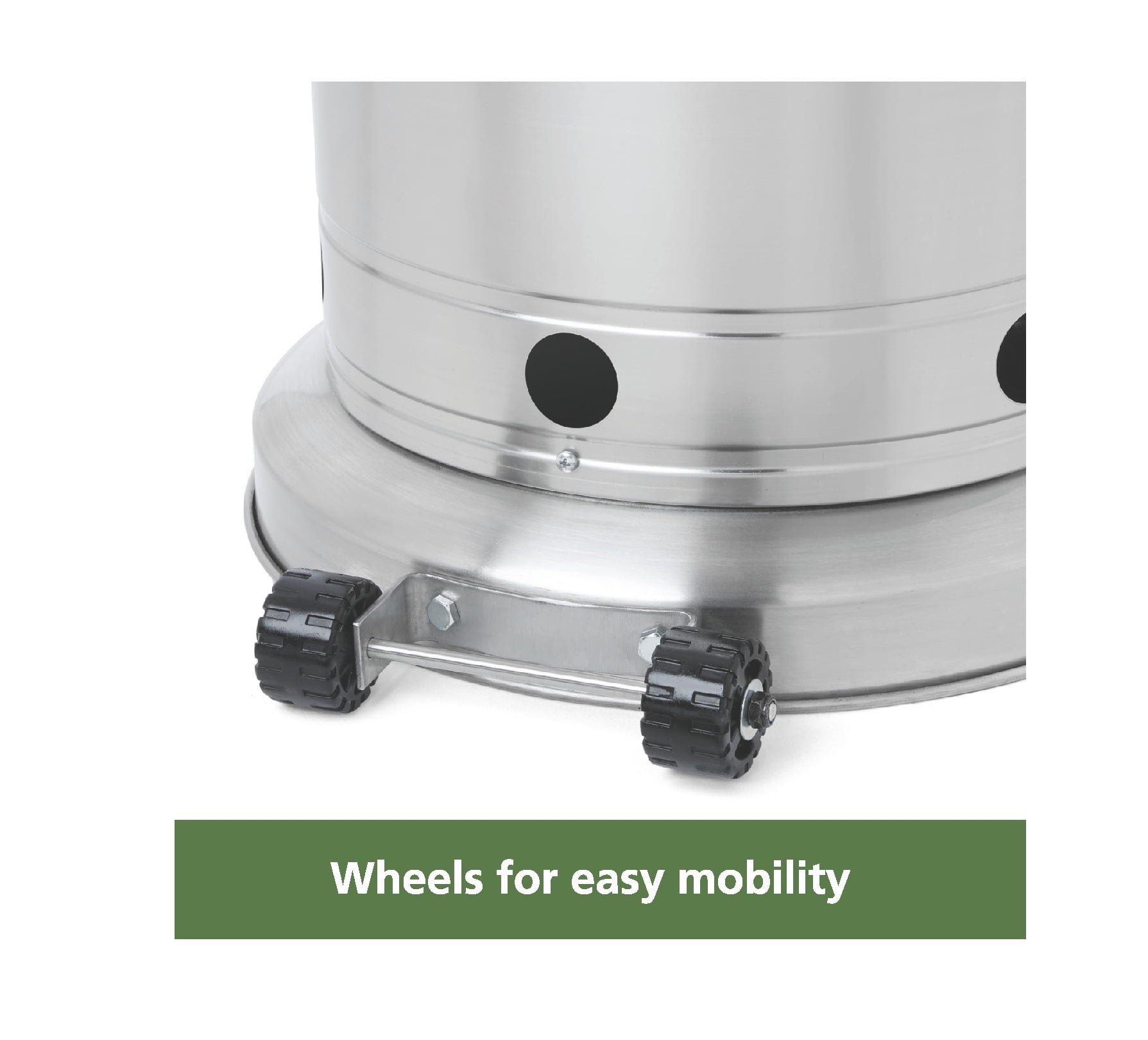 - Propane gas heater includes two wheels for transport, easy-to-use Piezo ignition, heat shield, and reflective cover