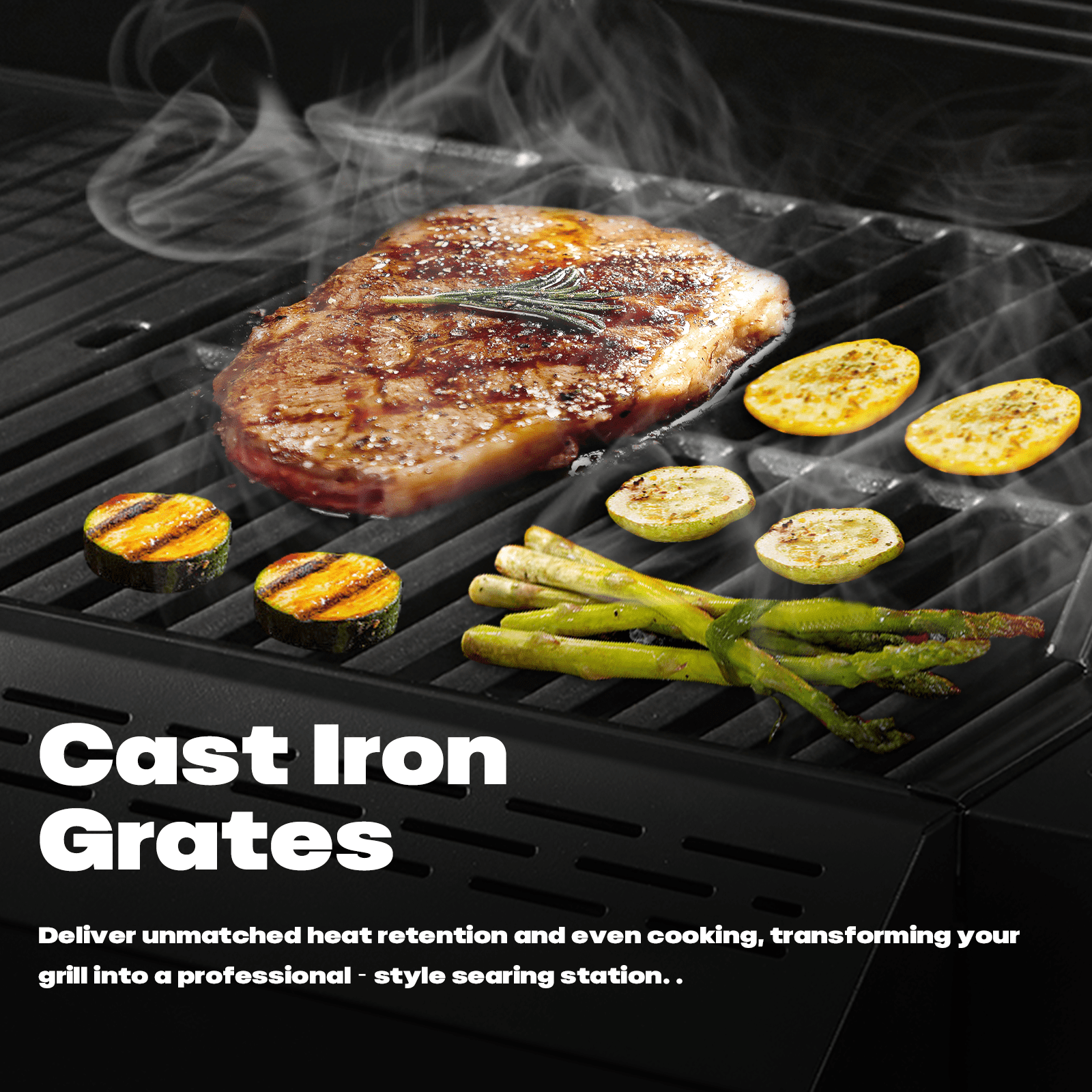 Elevate your outdoor cooking experience with the MAISON HUIS 4-Burner BBQ Propane Gas Grill. Featuring a powerful 52,000 BTU output, cast iron griddle and cooking grates, and a spacious 520 sq. in. primary cooking area, this heavy-duty grill delivers exceptional performance for all your grilling needs. Equipped with a side burner, locking wheels for easy mobility, and a visual window with a built-in thermometer, this grill ensures consistent, delicious results every time. The slide-out grease tray makes cleanup a breeze, allowing you to focus on creating mouthwatering meals for family and friends.