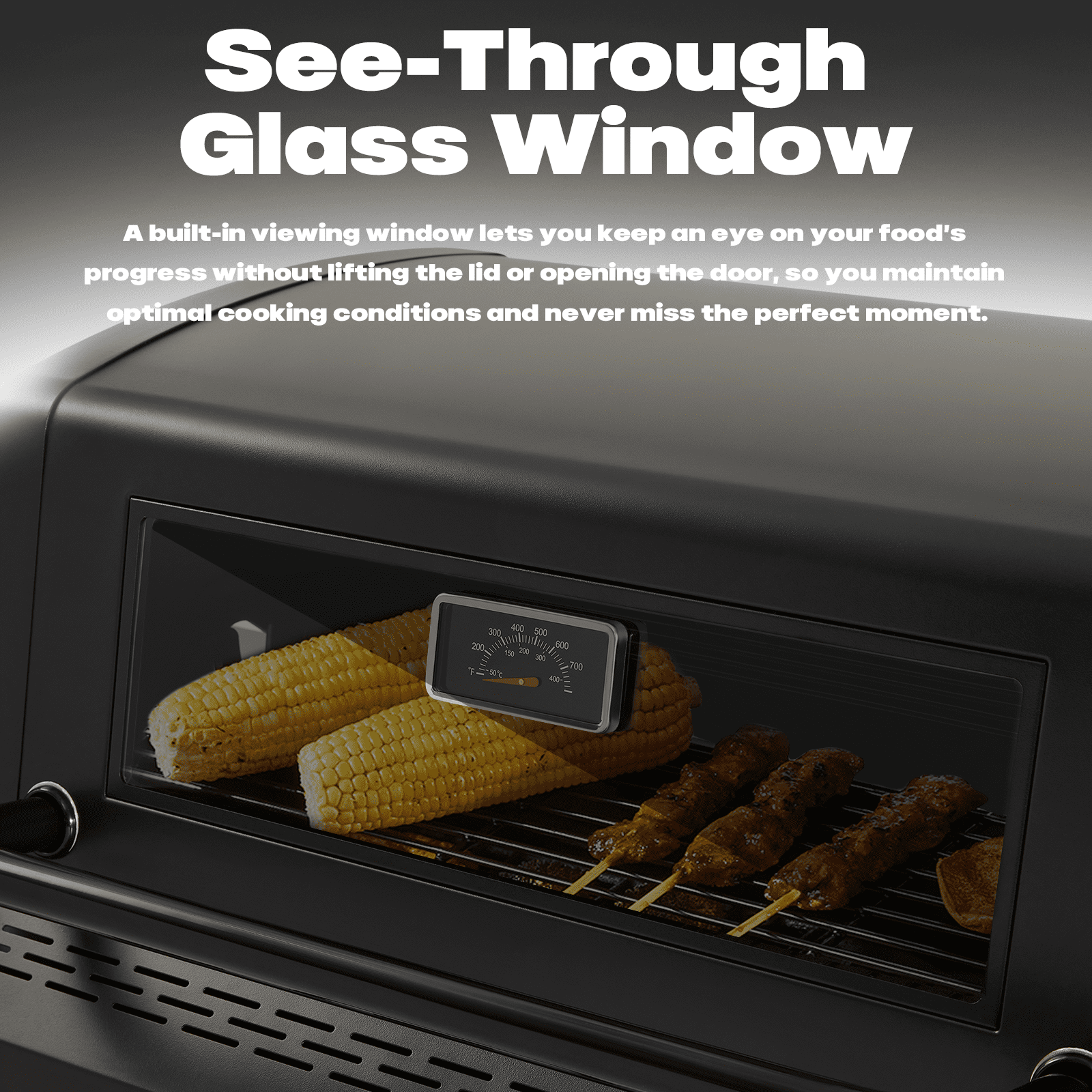 - Equipped with a visual window and built-in thermometer to monitor your food’s cooking progress without losing precious heat.