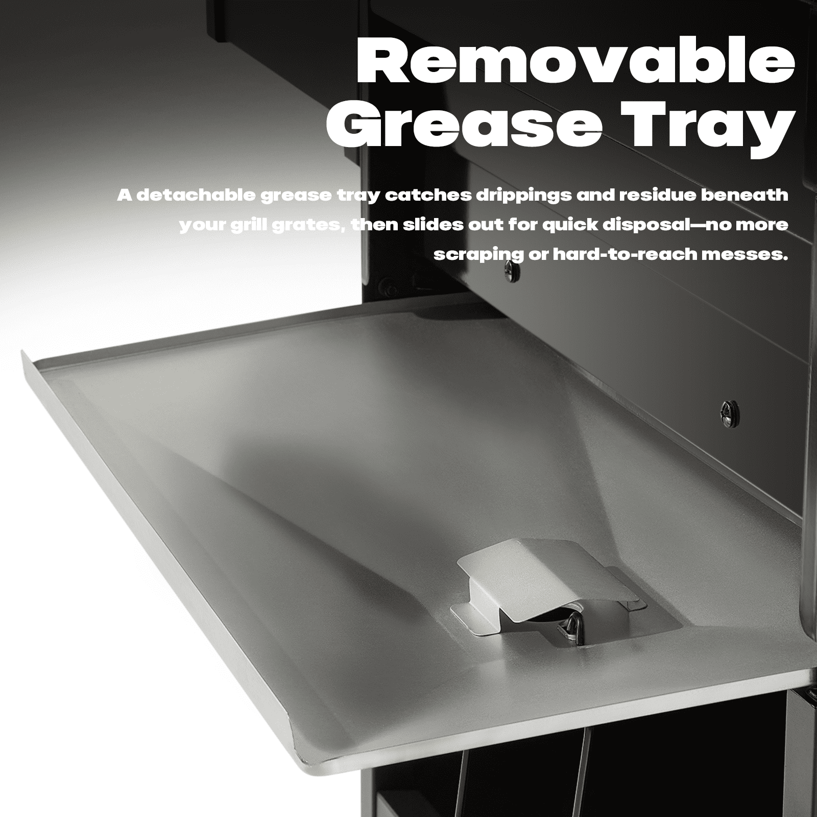 - Convenient grease management system with a slide-out tray for easy cleanup after every cookout.