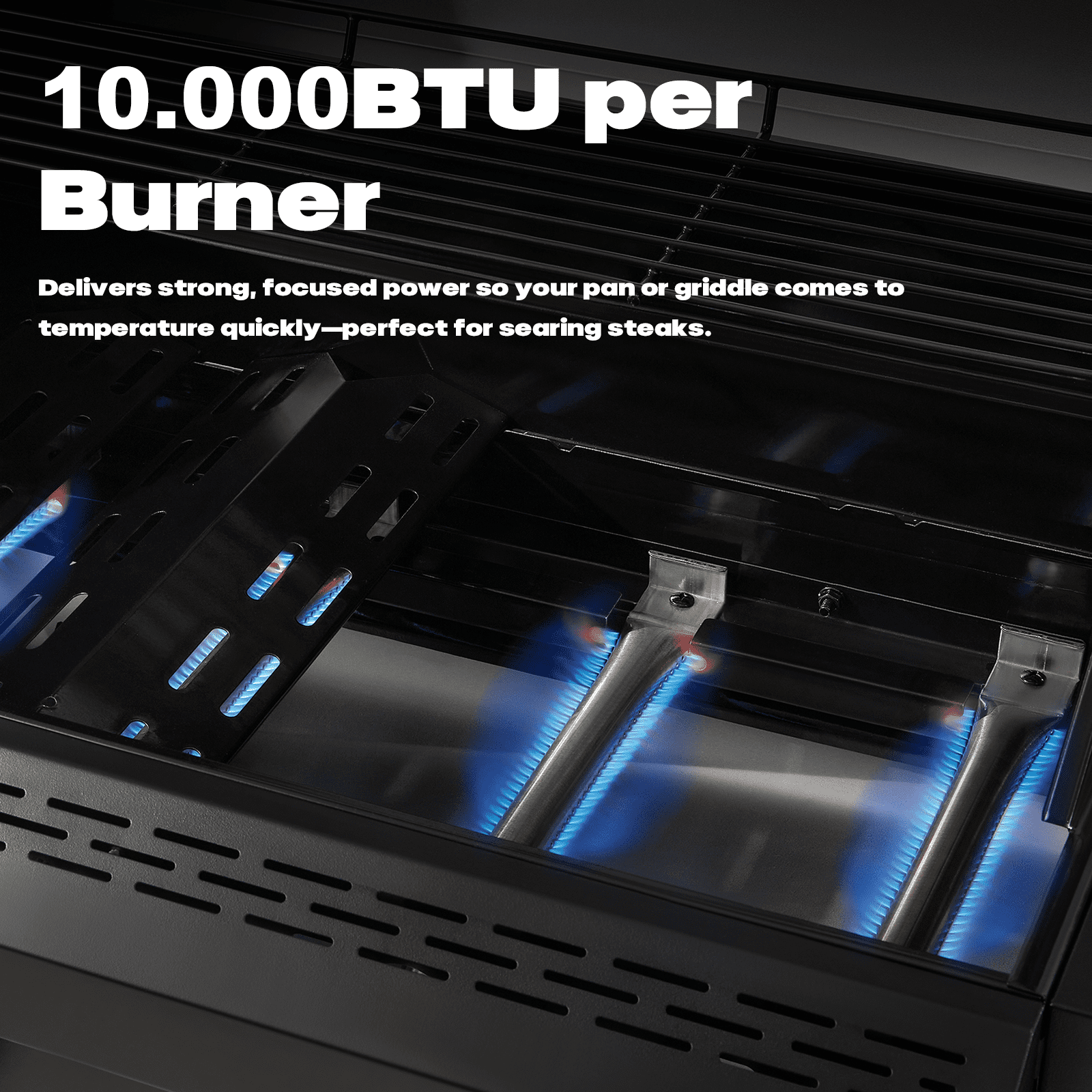 - Powerful 4-burner propane gas grill with a total heat output of 52,000 BTU for fast, even cooking of steaks, vegetables, and more.