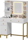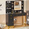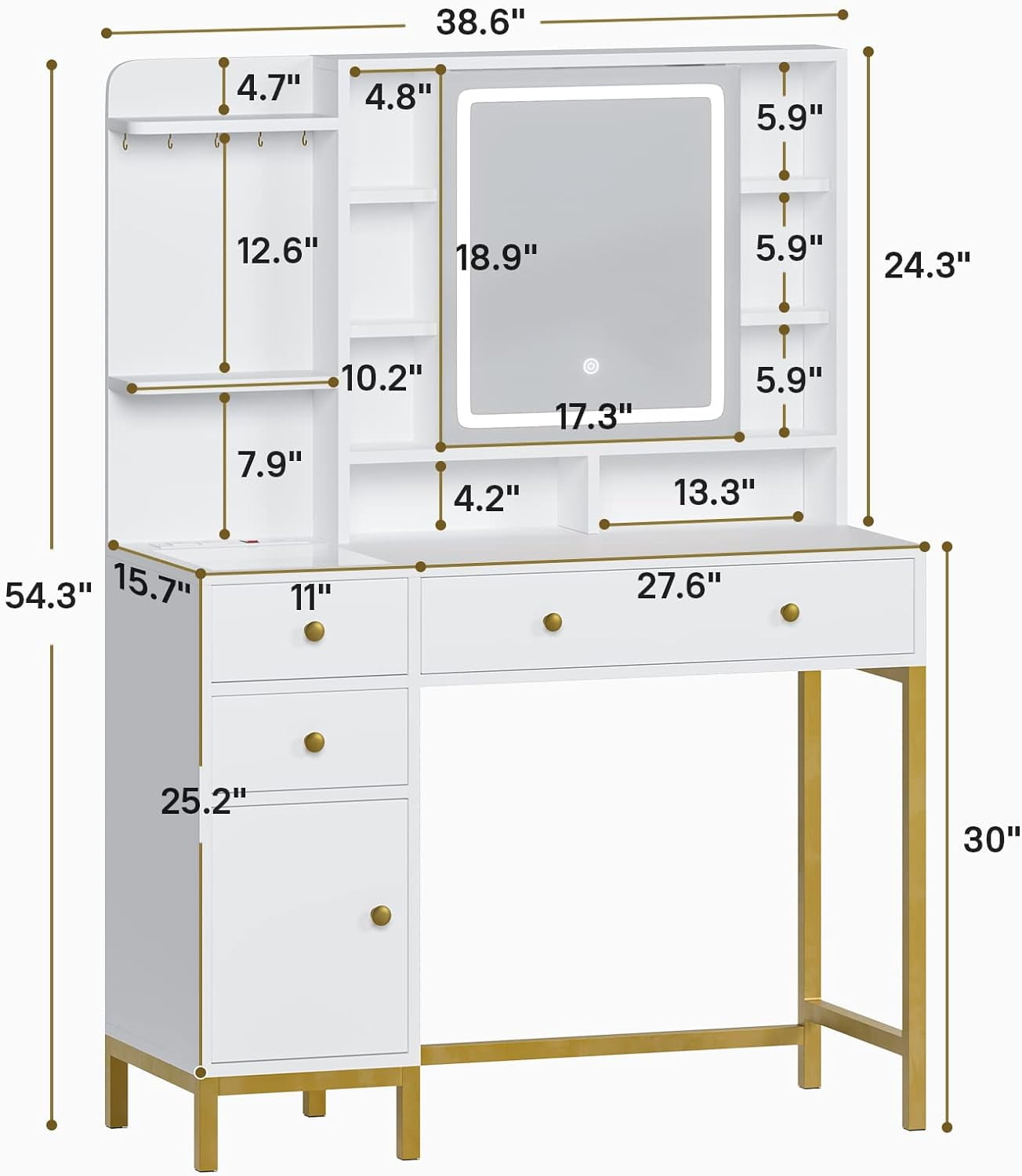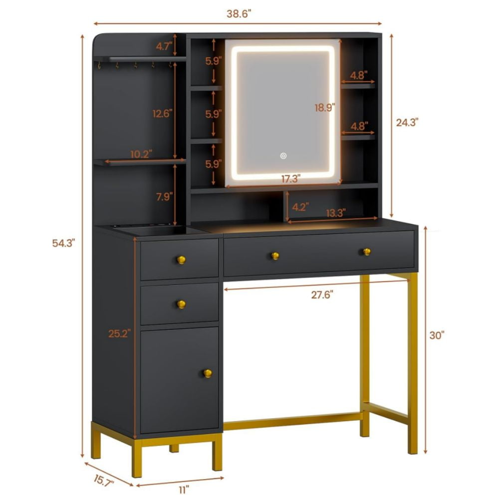 - 【Durable Material and Easy to Assemble】Frame made of FSC-Certified wood, golden iron pipe at the bottom, which has strong anti-rust ability and support, making the vanity desk have a long service life. The makeup table(38.6 “L x 15.7″W x 54.3″H) comes with detailed instructions and tools, it is recommended to follow the steps in the included instructions, and then arrange each board according to the number, and finally assemble, which can save time.