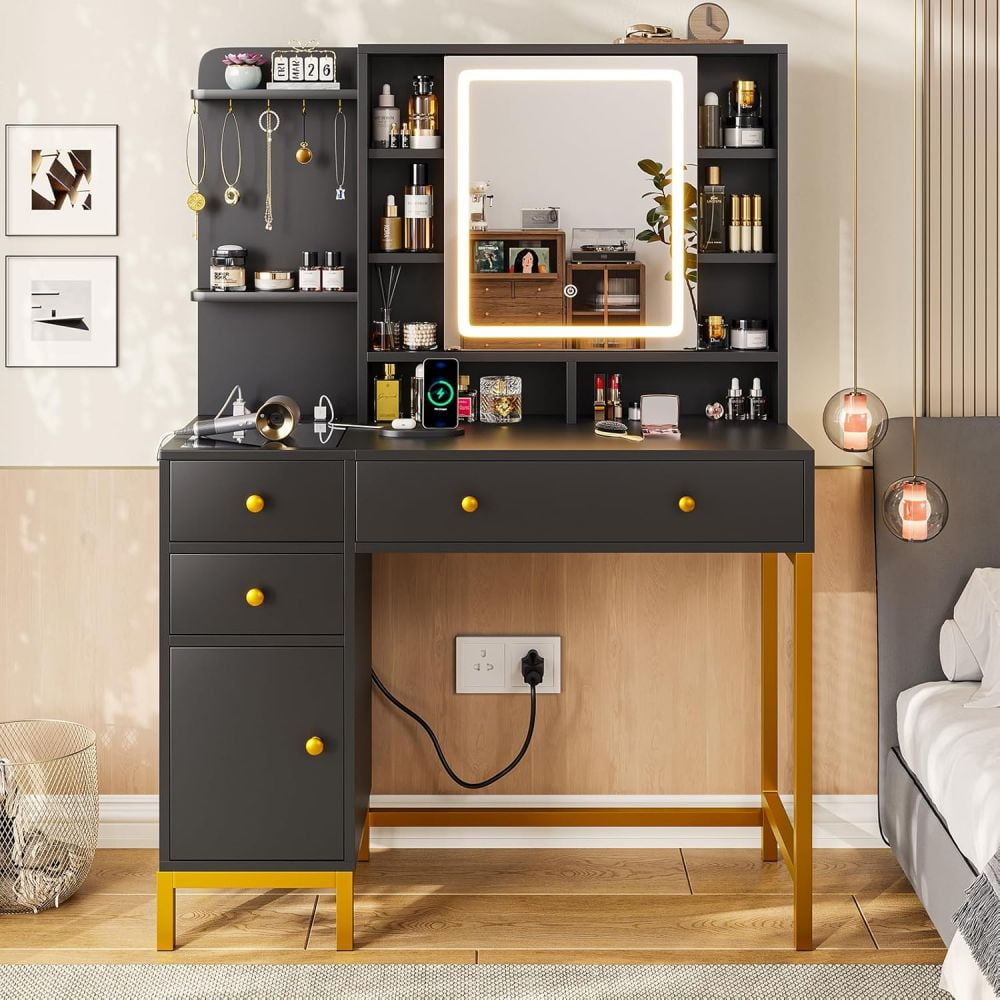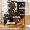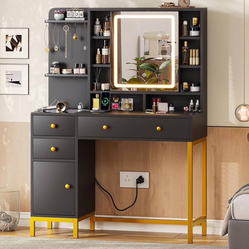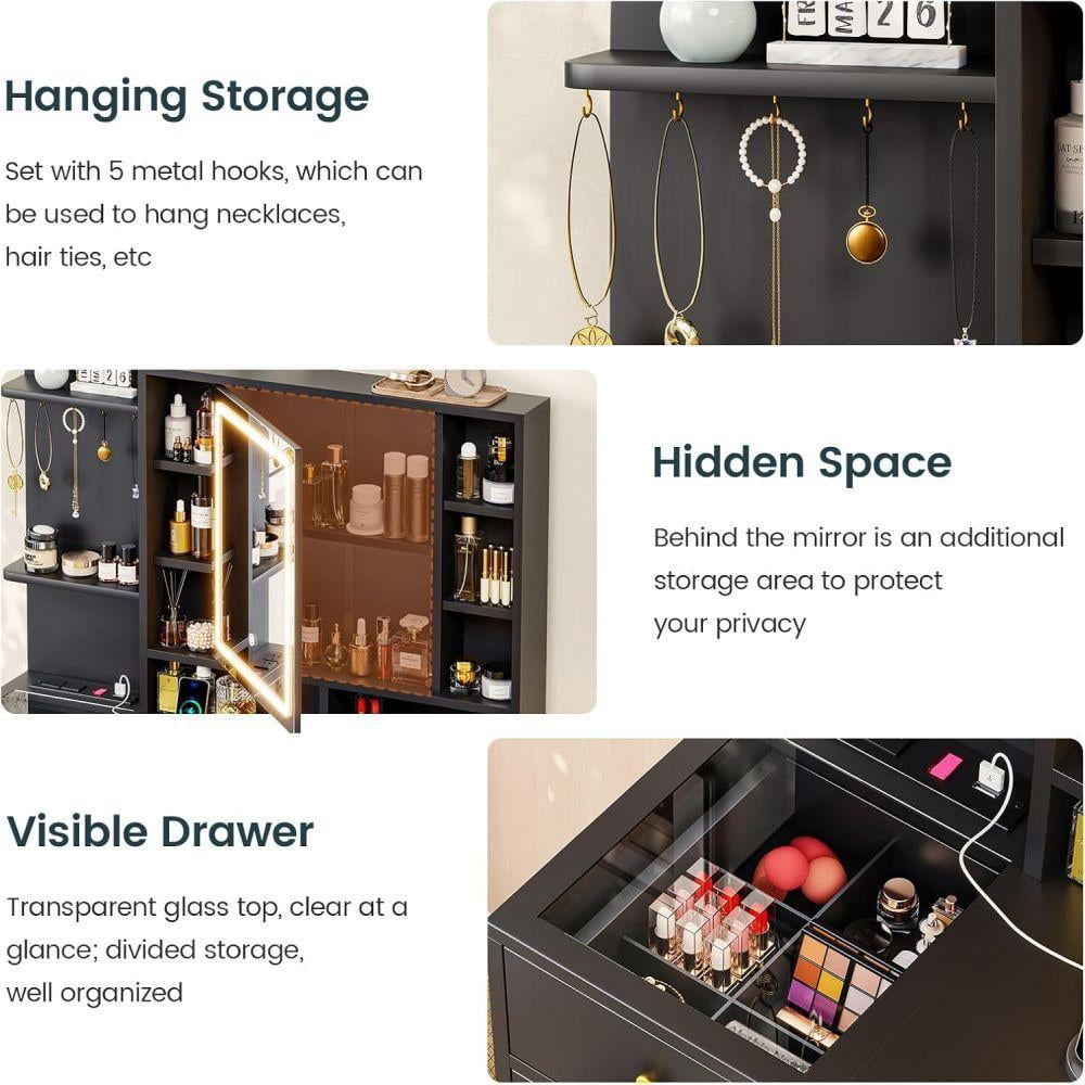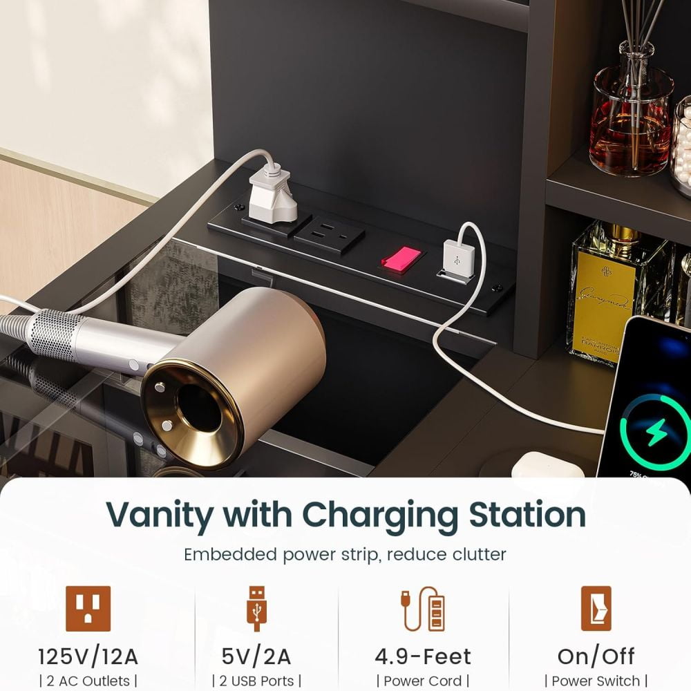 - 【Makeup Vanity with Charging Station】This dressing table is equipped with a charging station on the left side of the table with 2 power outlets and 2 USB ports, designed to allow you to charge multiple electronic devices at the same time, such as mobile phones, computer and so on. Besides that, you can easily style your hair with a curling iron or blow dryer right in front of your vanity without worrying about the cord of this tools not being long enough.