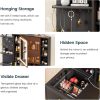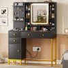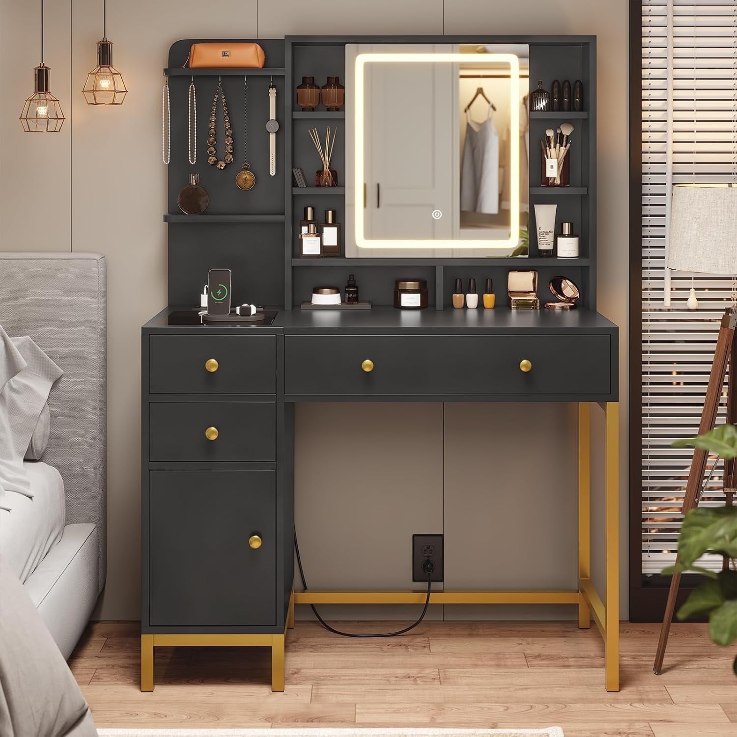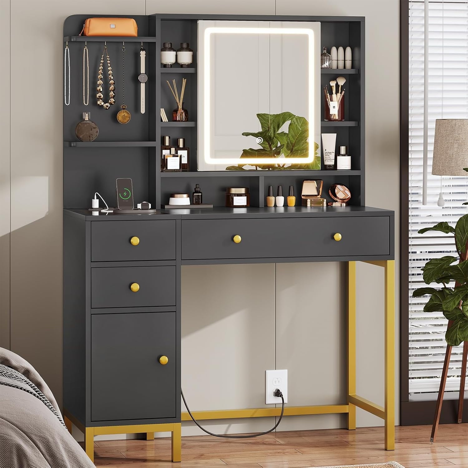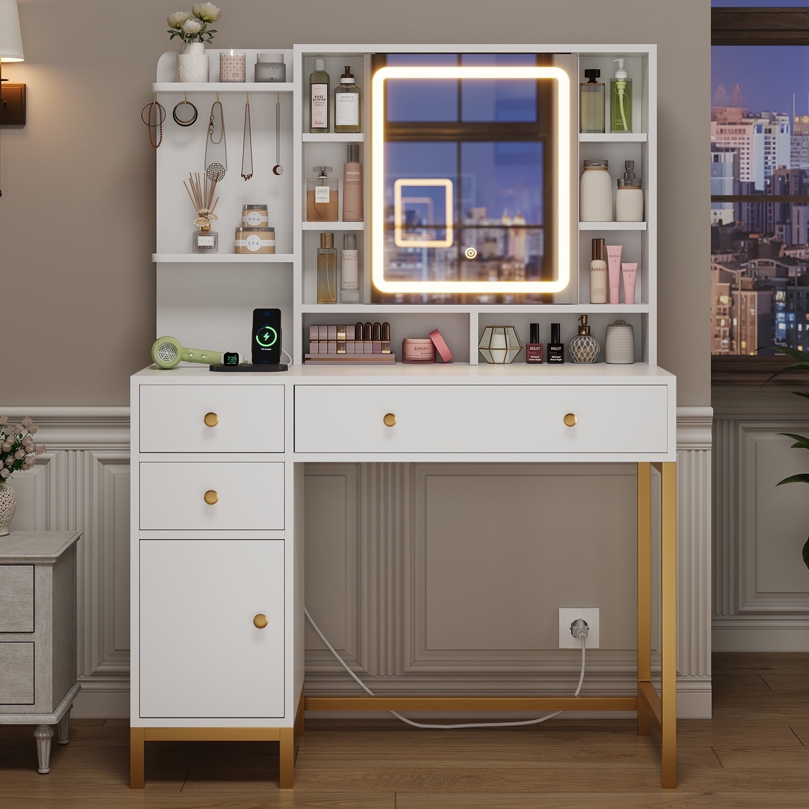 - 【Makeup Vanity with Charging Station】This dressing table is equipped with a charging station on the left side of the table with 2 power outlets and 2 USB ports, designed to allow you to charge multiple electronic devices at the same time, such as mobile phones, computer and so on. Besides that, you can easily style your hair with a curling iron or blow dryer right in front of your vanity without worrying about the cord of this tools not being long enough.