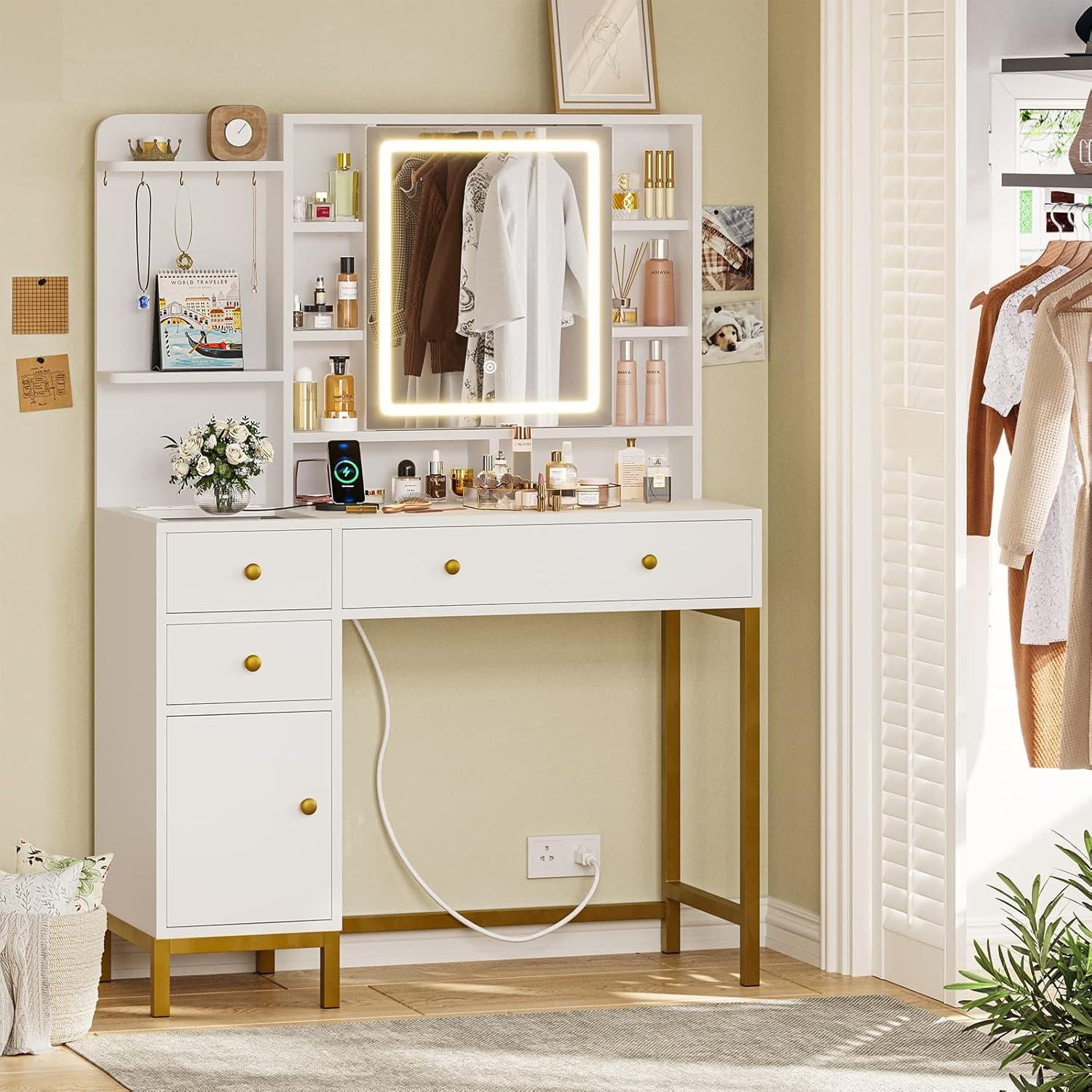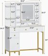 Elevate your beauty routine with the AOGLLATI Makeup Vanity. This modern, white vanity desk features 3 adjustable lighting modes, a power strip with USB ports and outlets, and a unique design with visual drawers and hooks for easy organization. Crafted with eco-friendly particle board and metal materials, it offers flexible and ample storage space, including 6 drawers and open shelves, to neatly house your makeup, jewelry, and other essentials. With its easy assembly and sturdy construction, this vanity table is the perfect addition to your bedroom or vanity area.