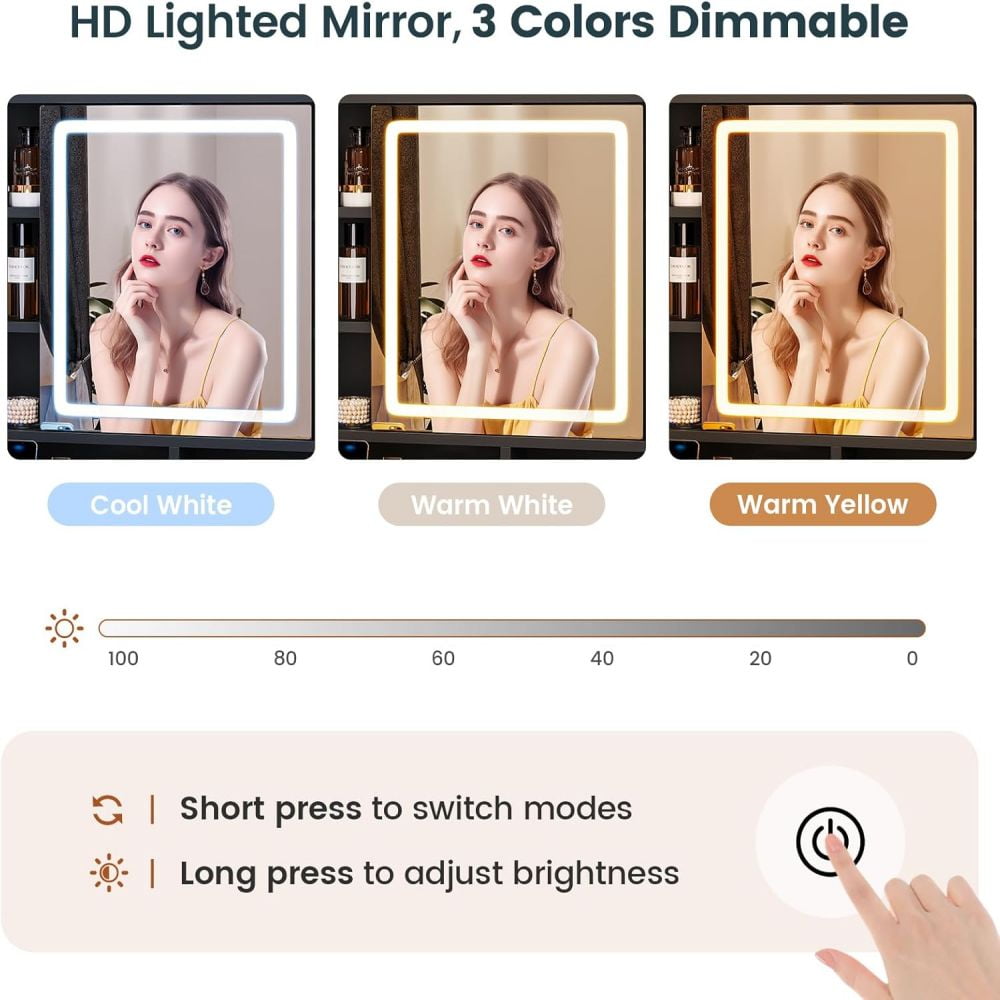 - 【3-Color Dimmable Mirror & Touch Screen Operation】The 3-color LED mirror on the makeup vanity desk is safer than ordinary light bulbs. The light mirror of vanity has 3 different brightness options: warm yellow, warm white and cool white, by touching the sensor switch on the screen, you can control the light switch to select different light modes and adjust the brightness. Take you to experience the make-up environment of the Hollywood make-up room.