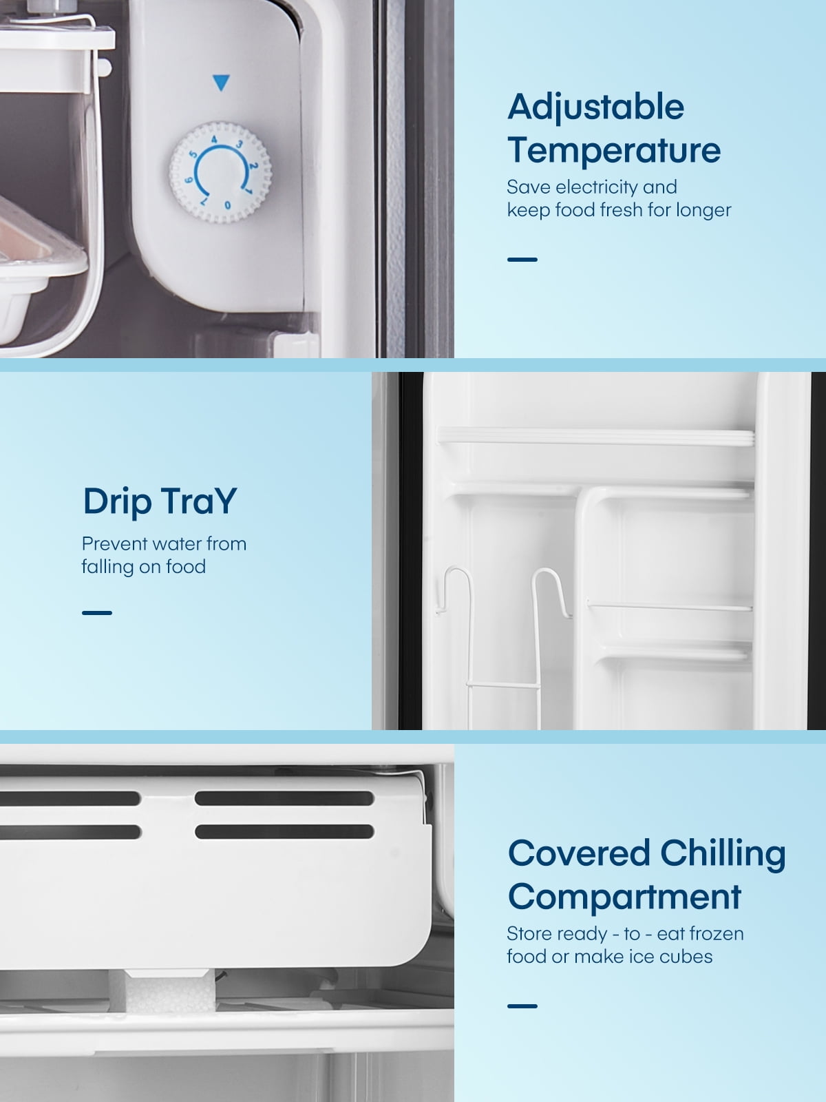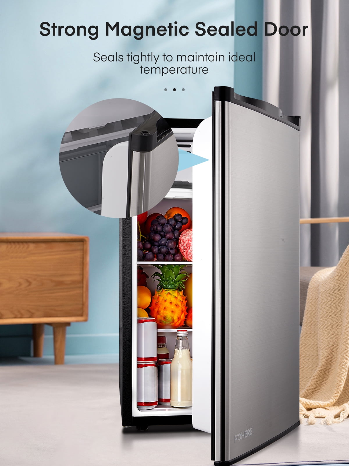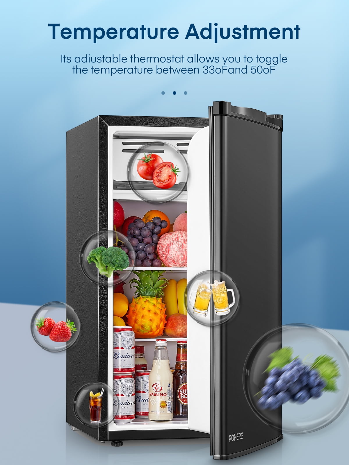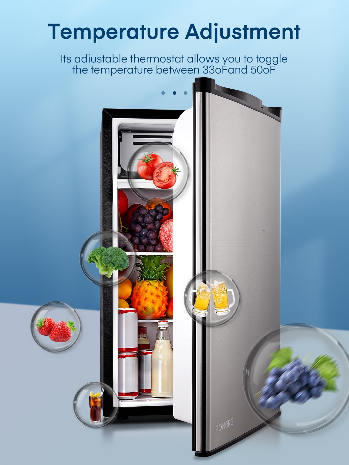 - 【Adjustable Thermostat】Clear 7-level temperature adjustment allows the refrigerator to cool down quickly and meet all your storage needs. The mini refrigerator in the bedroom allows you to drink a cold drink anytime and anywhere in the hot summer, improving the happiness of life.