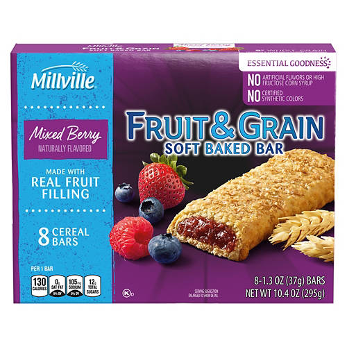 Complete a healthy lunch with these Millville Mixed Berry Fruit and Grain Cereal Bars! Each soft baked cereal bar features a sweet filling that blends all your favorite berries without any artificial colors, flavors, or high fructose corn syrup. Enjoy yours alongside a loaded deli sandwich and baked crackers for a tasty and filling meal!