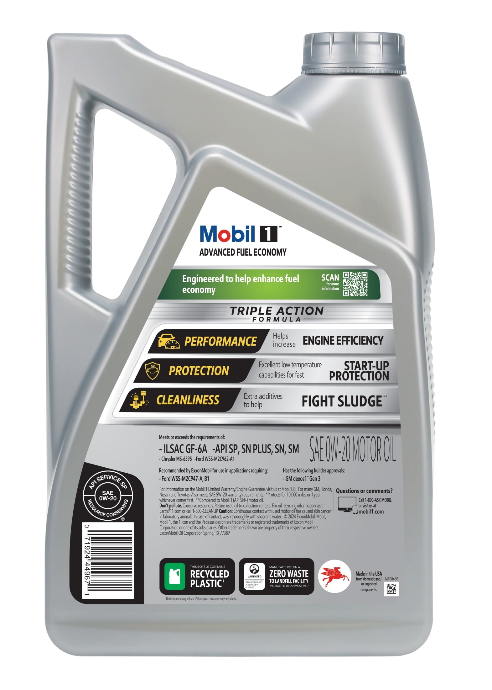 Keep your engine running at peak efficiency while improving fuel economy. Engineered for today’s advanced engines, Mobil 1 Advanced Fuel Economy full-synthetic motor oil 0W-20 helps to improve fuel economy* and extend engine life for vehicles of all ages. Utilizes Mobil 1’s signature Triple Action Formula to deliver outstanding engine performance, protection, and cleanliness to your vehicle. Mobil 1 Advanced Fuel Economy full-synthetic motor oil 0W-20 is recommended by ExxonMobil for all types of modern vehicles, including high-performance, turbo-charged, and supercharged gasoline and diesel multi-valve fuel-injected engines found in passenger cars, SUVs, light vans, and light trucks. Mobil 1 is America’s #1 selling synthetic motor oil brand at retail,** trusted and recommended by car builders and experienced mechanics, and is the Official Motor Oil of NASCAR®. (*Potential fuel economy improvement obtained by switching from higher-viscosity oils to a lower-viscosity grade. Actual savings are dependent upon vehicle/engine type, outside temperature, driving conditions, and your current engine oil viscosity. **Source: The NPD Group/Retail Tracking Service/Dollar Sales/PCMO full-synthetic/52 weeks ending September 30, 2023)