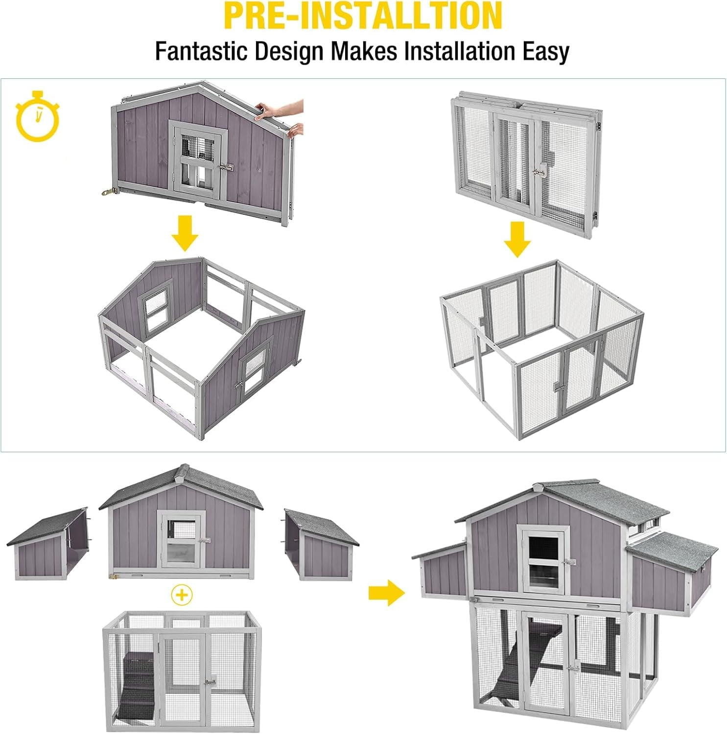 - STURDY: 100% solid fir wood,Asphalt roof cover all areas provide a dry and comfortable space for your pets,durable and sturdy metal wire with predator-resistant spring latch keeps your Chicken flock secure.4 big doors for easy catching your pets.