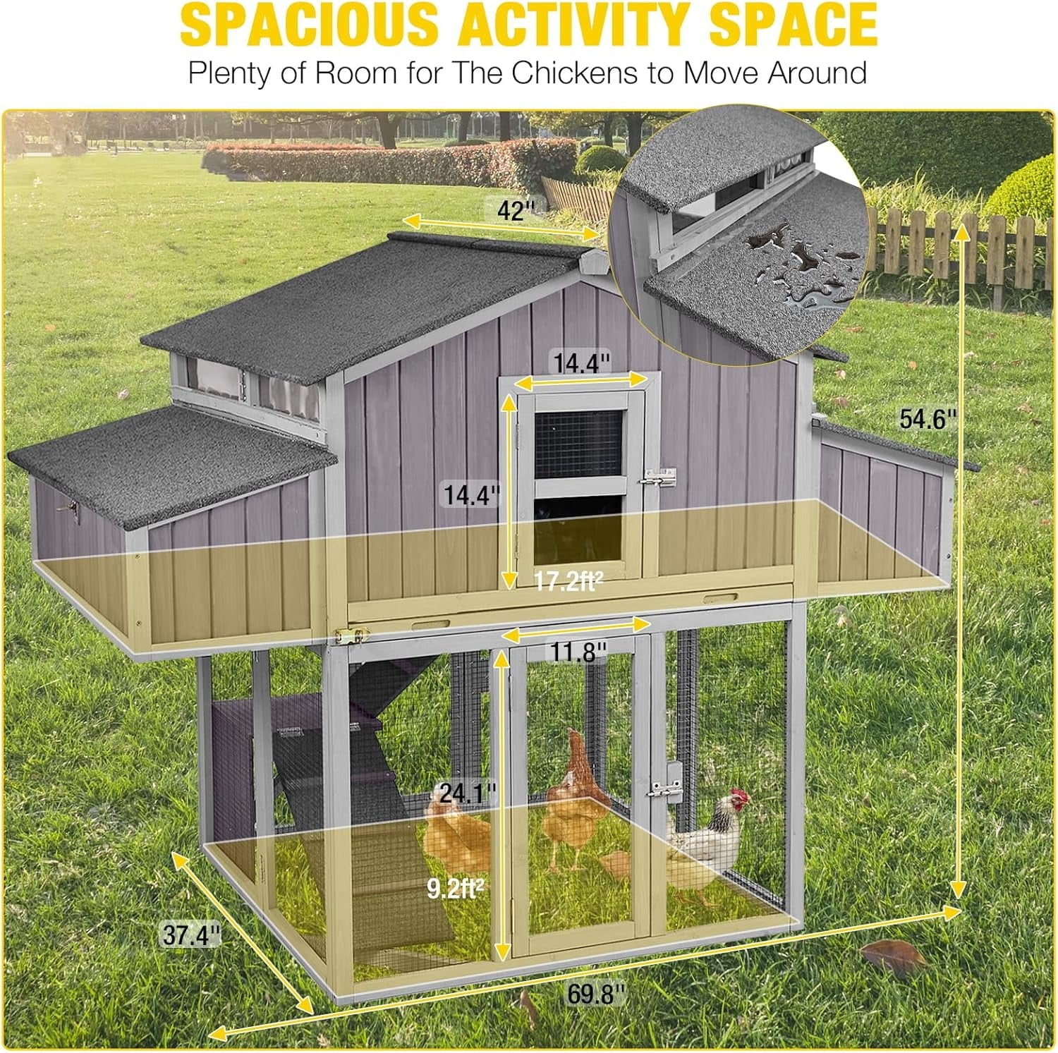 - LARGE SPACE: 2 Levels chicken house 26ft² activity space include large nesting box,resting area and running area,perfect for 4-6 chickens.Overall size: 69.8”(L) x 42”(W) x 54.6”(H)