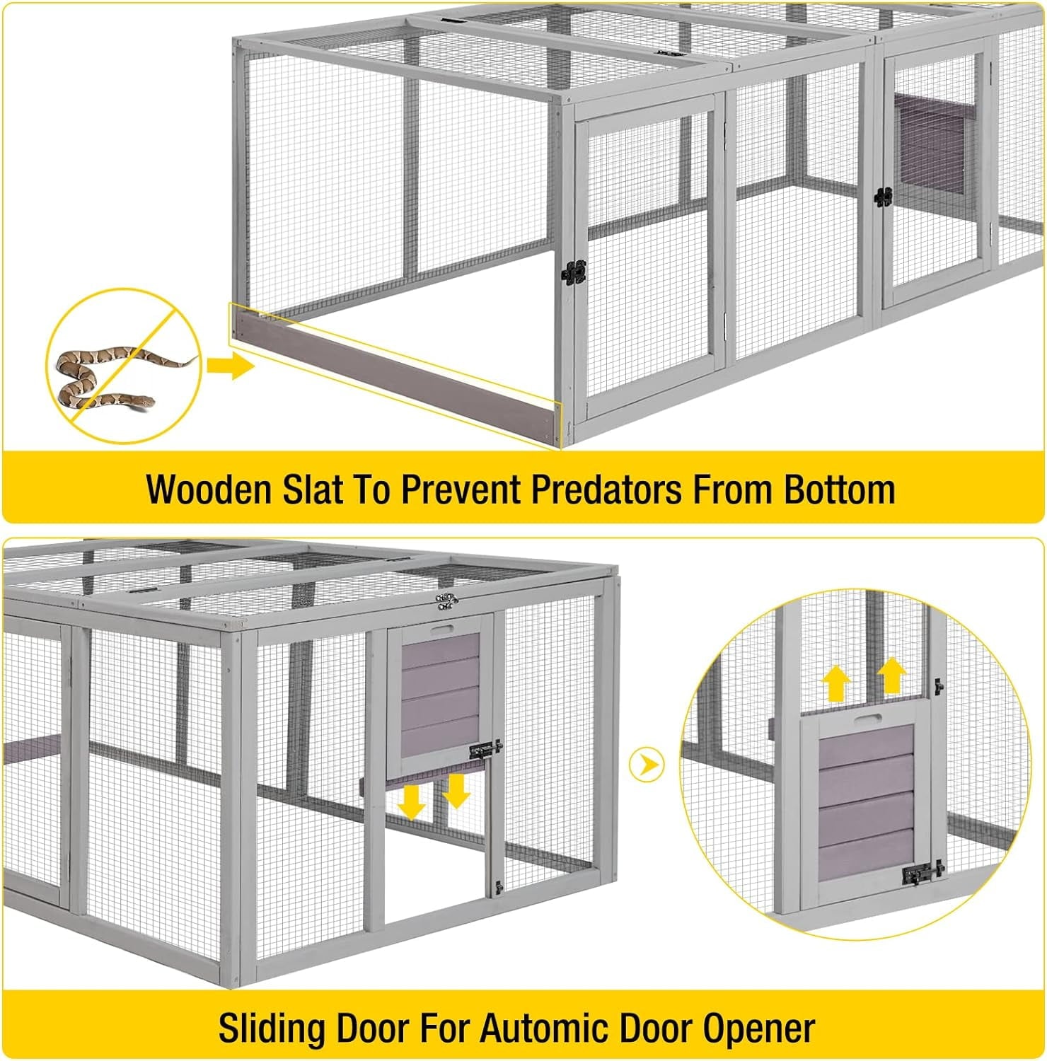 - NESTING BOXES: LARGE 2 sides nesting box design with PVC cover above the connecting of nesting box to prevent leakage.Special custom locks predators prevent.