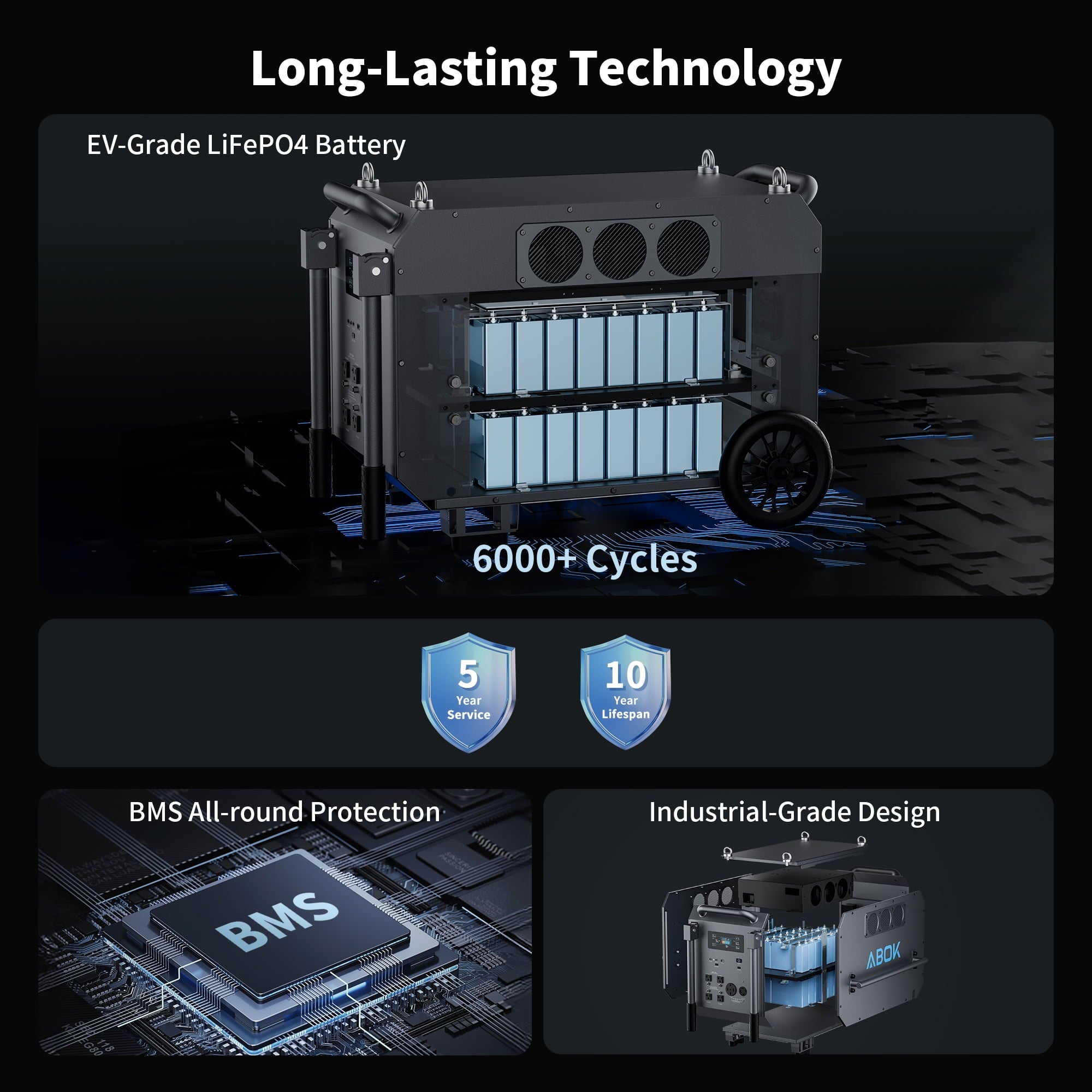 Starts at a robust 9792Wh and scales up to 29,376Wh with ABOK add-on batteries (sold separately)—enough to keep your fridge chilling, AC blasting, and power tools cranking for DAYS.