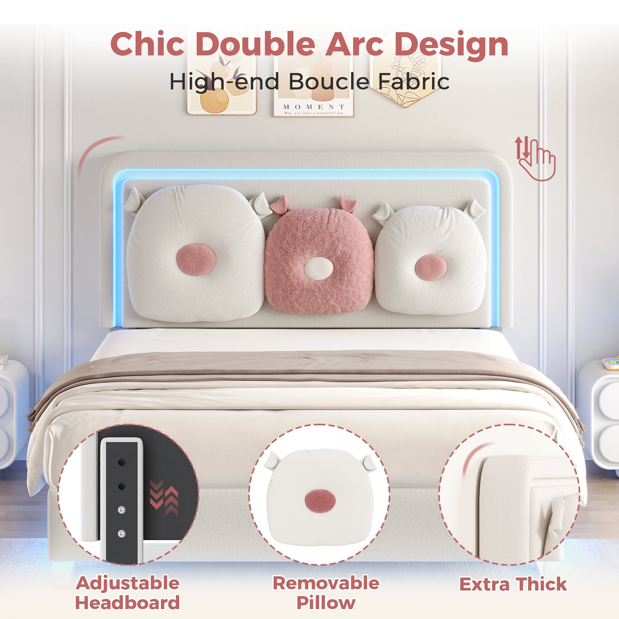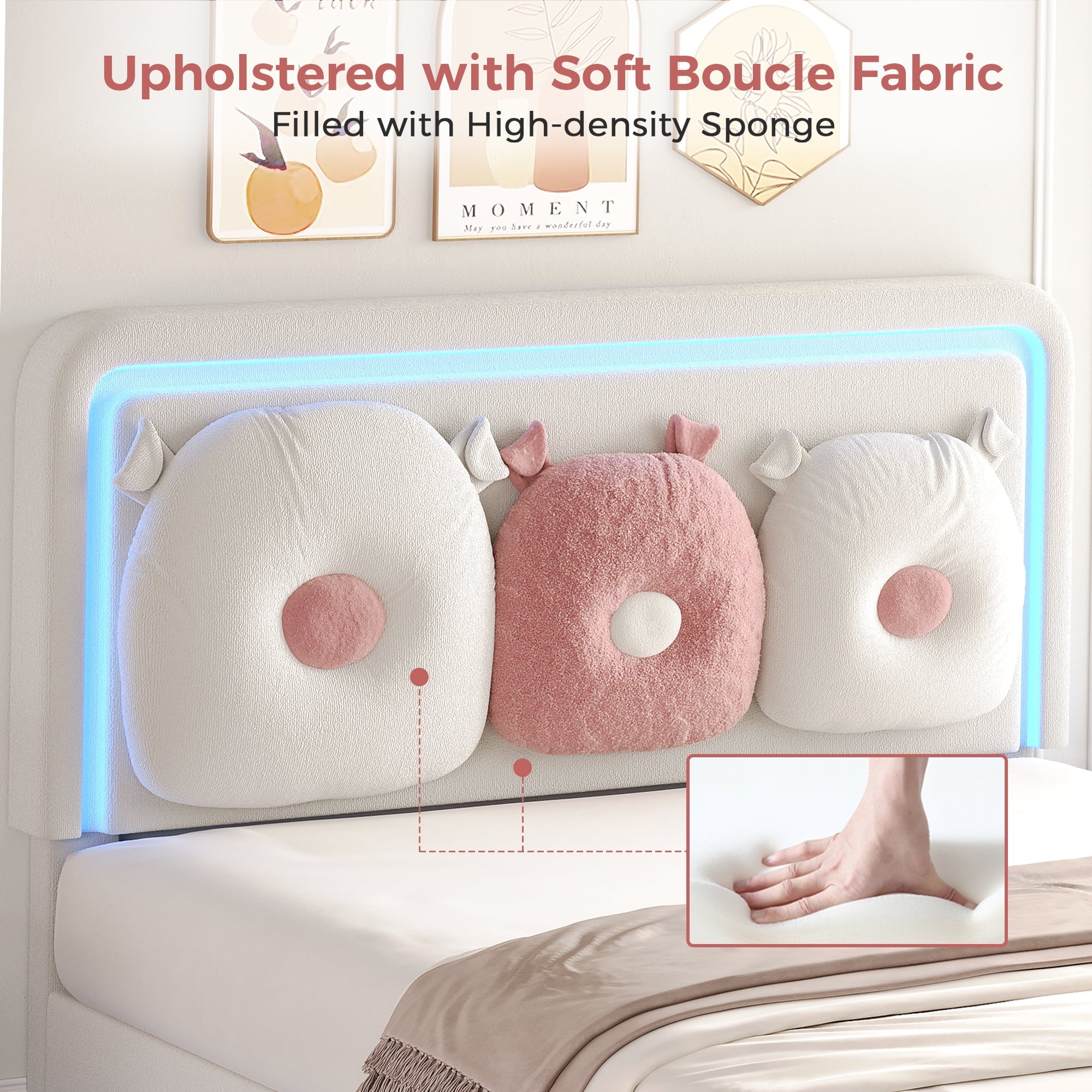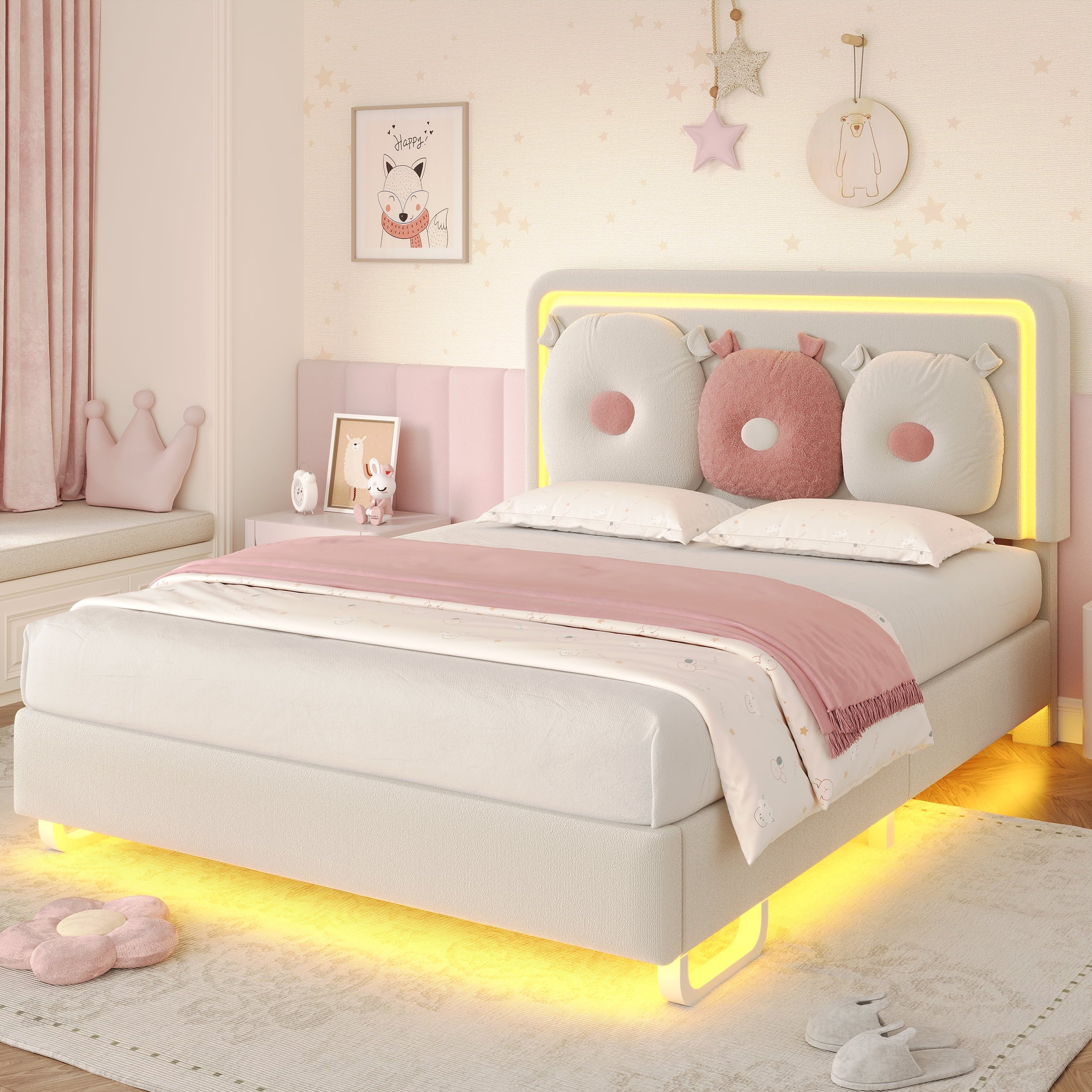- 【Cute Removable Pollows】This full bed comes with 2 soft pillows, each pillow is made from fluffy boucle fabric and designed in a cute shape. The pillows can be easily attached to the headboard with button loops to act as cozy backrests or removed to use as snuggly pillow or cuddle buddies.