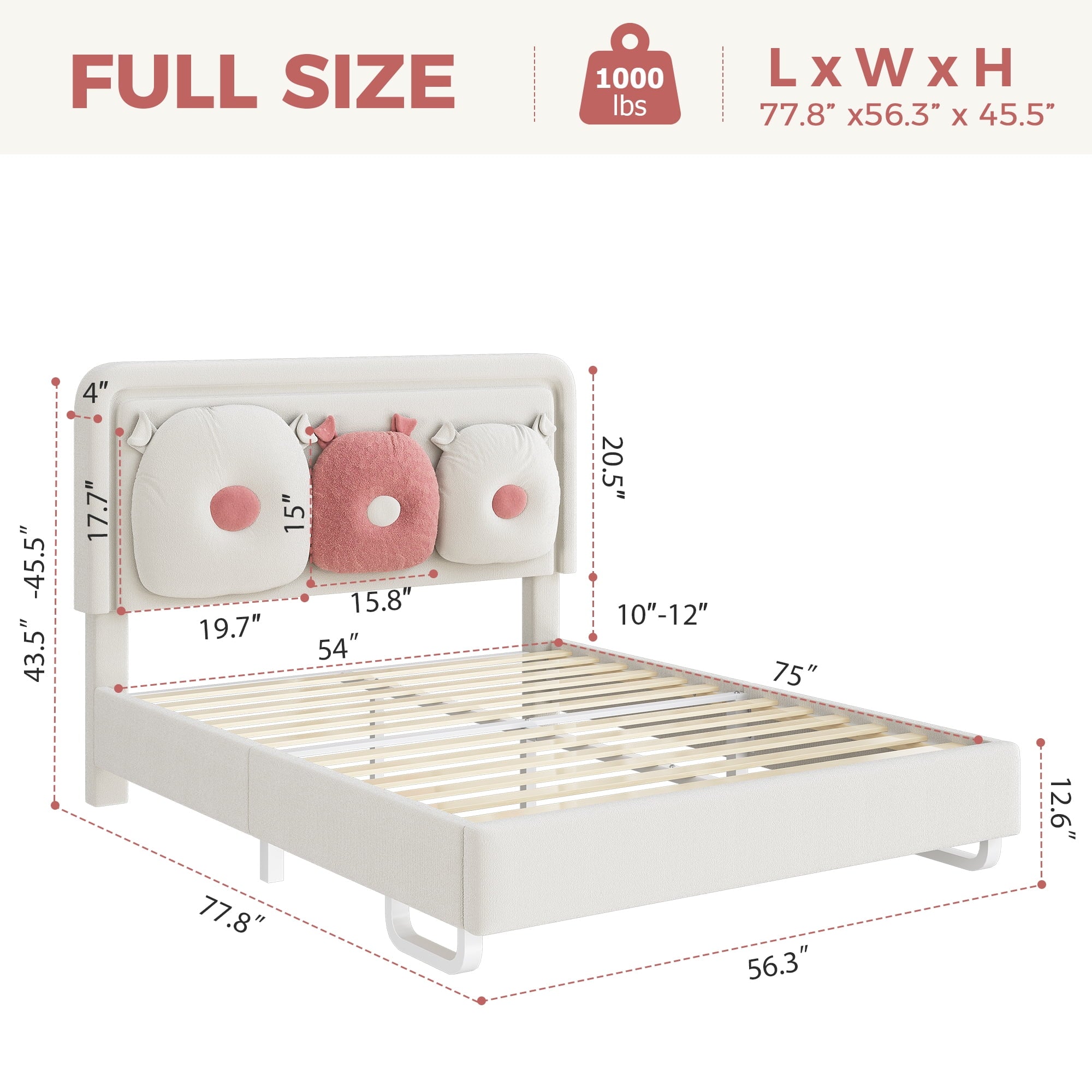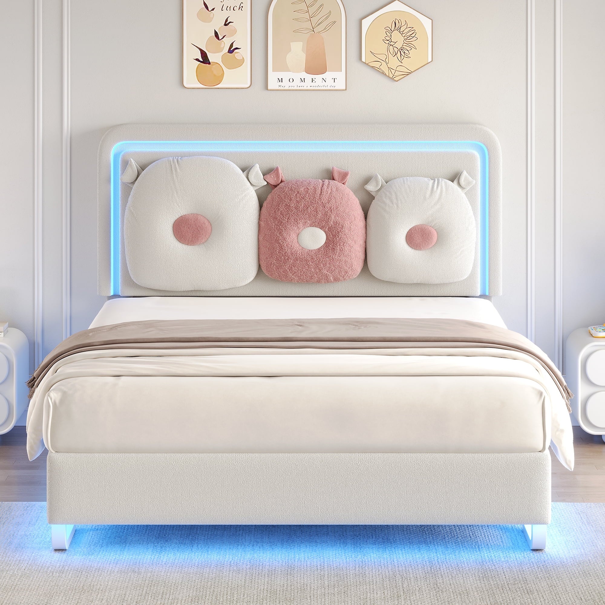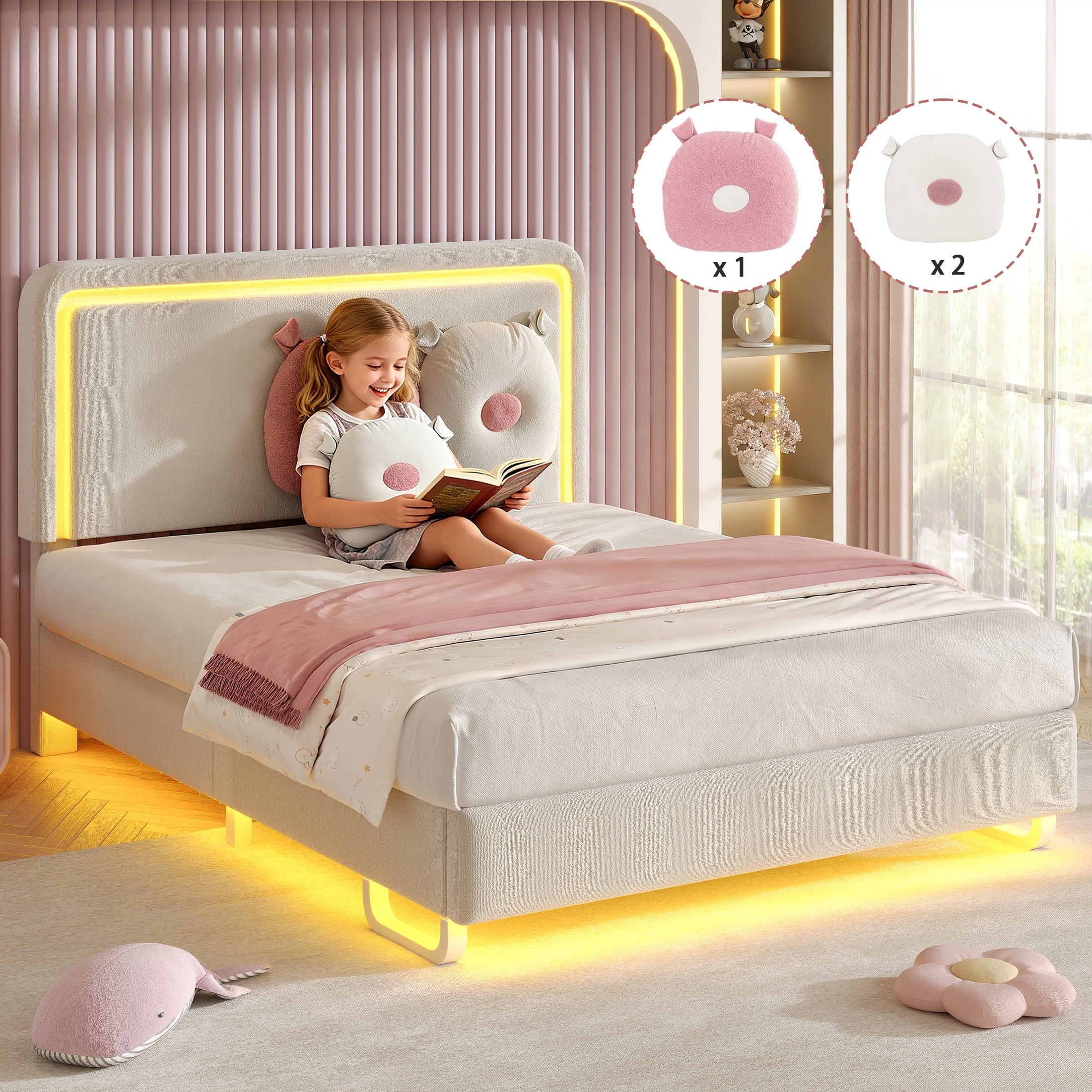 - 【Cute Removable Pollows】This full bed comes with 2 soft pillows, each pillow is made from fluffy boucle fabric and designed in a cute shape. The pillows can be easily attached to the headboard with button loops to act as cozy backrests or removed to use as snuggly pillow or cuddle buddies.