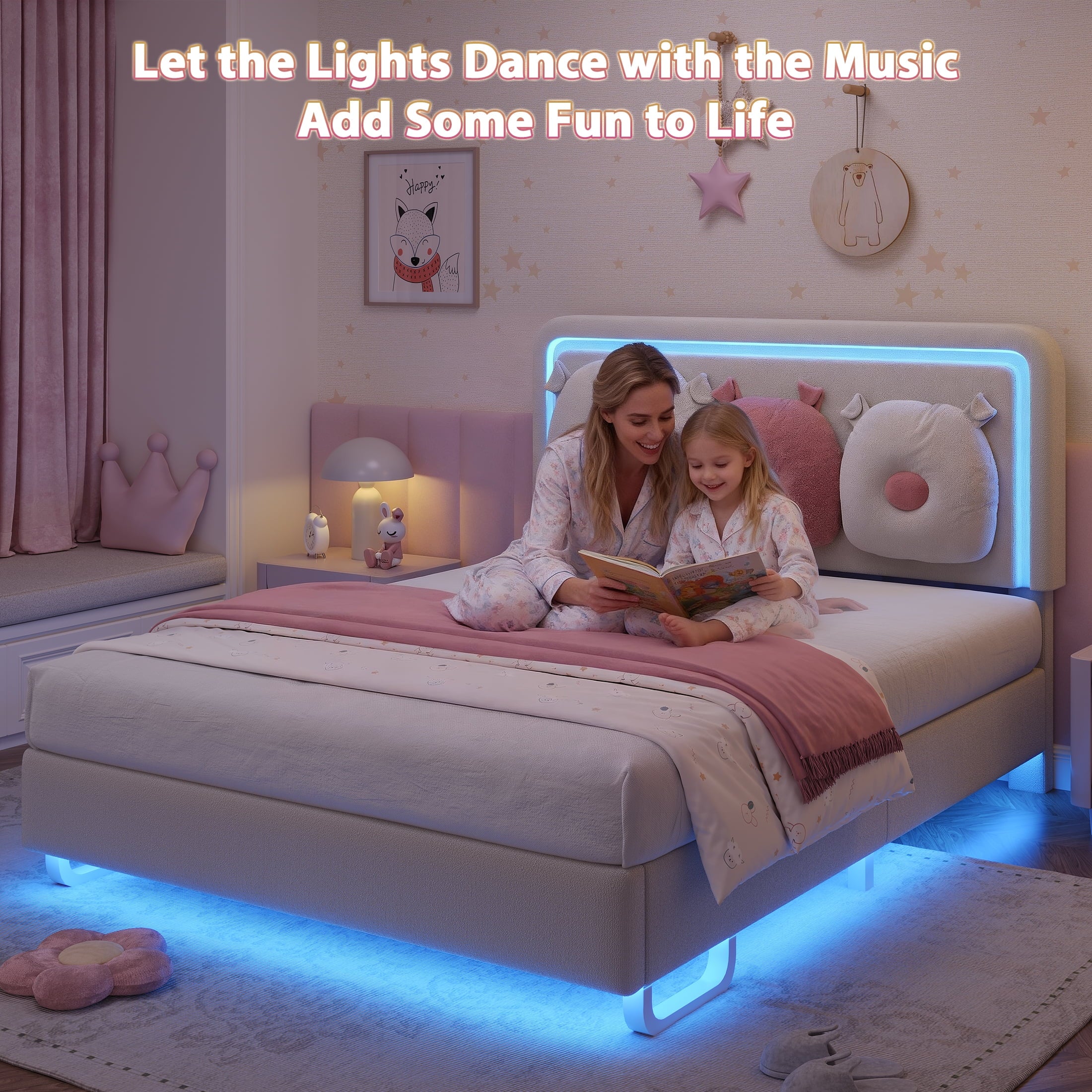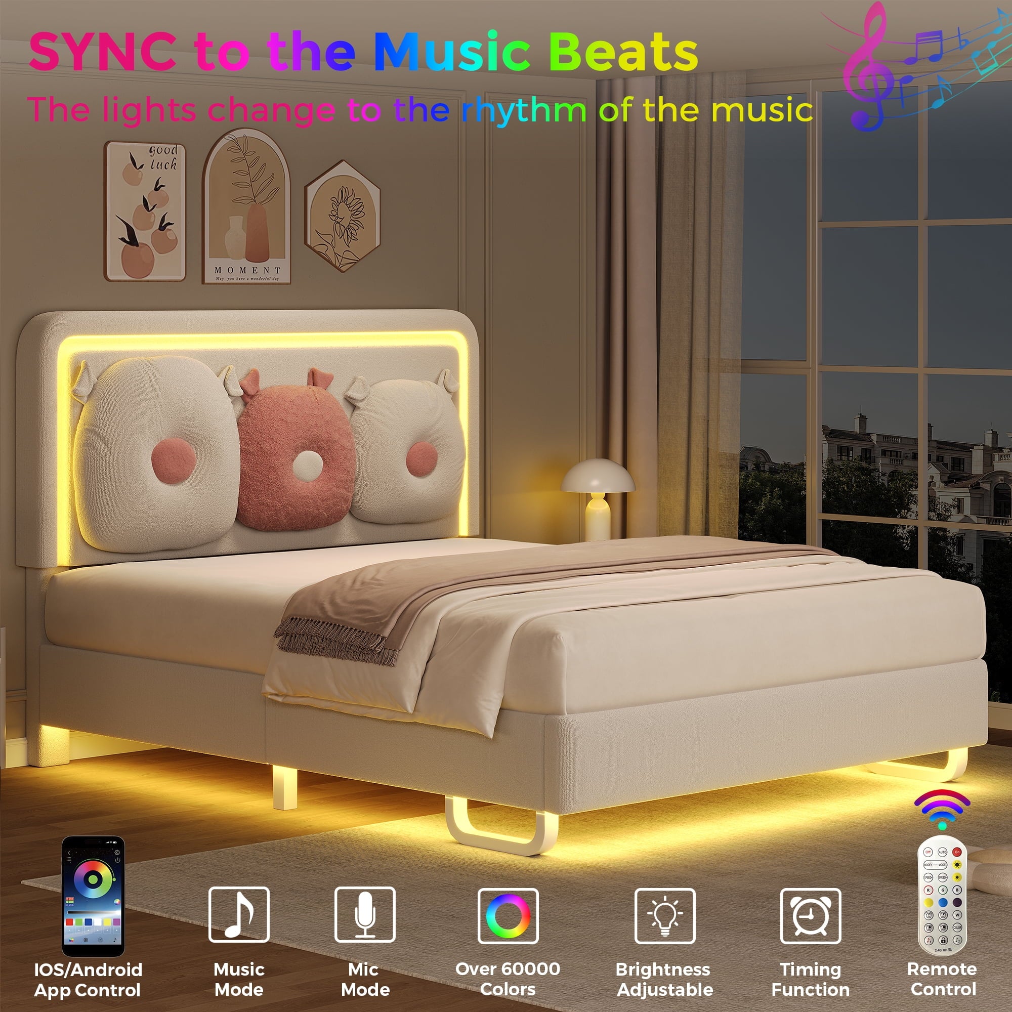 The Anyact full size LED bed frame with premium velvet upholstered headboard which is soft, skin-friendly and well-filled. Accompanied with cute cloud pillow, this off white full bed frame will bring comfort and cute decoration feeling to your quality bedroom time. The LED lights at the head and side of this full bed frame with storage flash in sync with music beats in the smart music activation mode and change, brightening up your cozy night.
