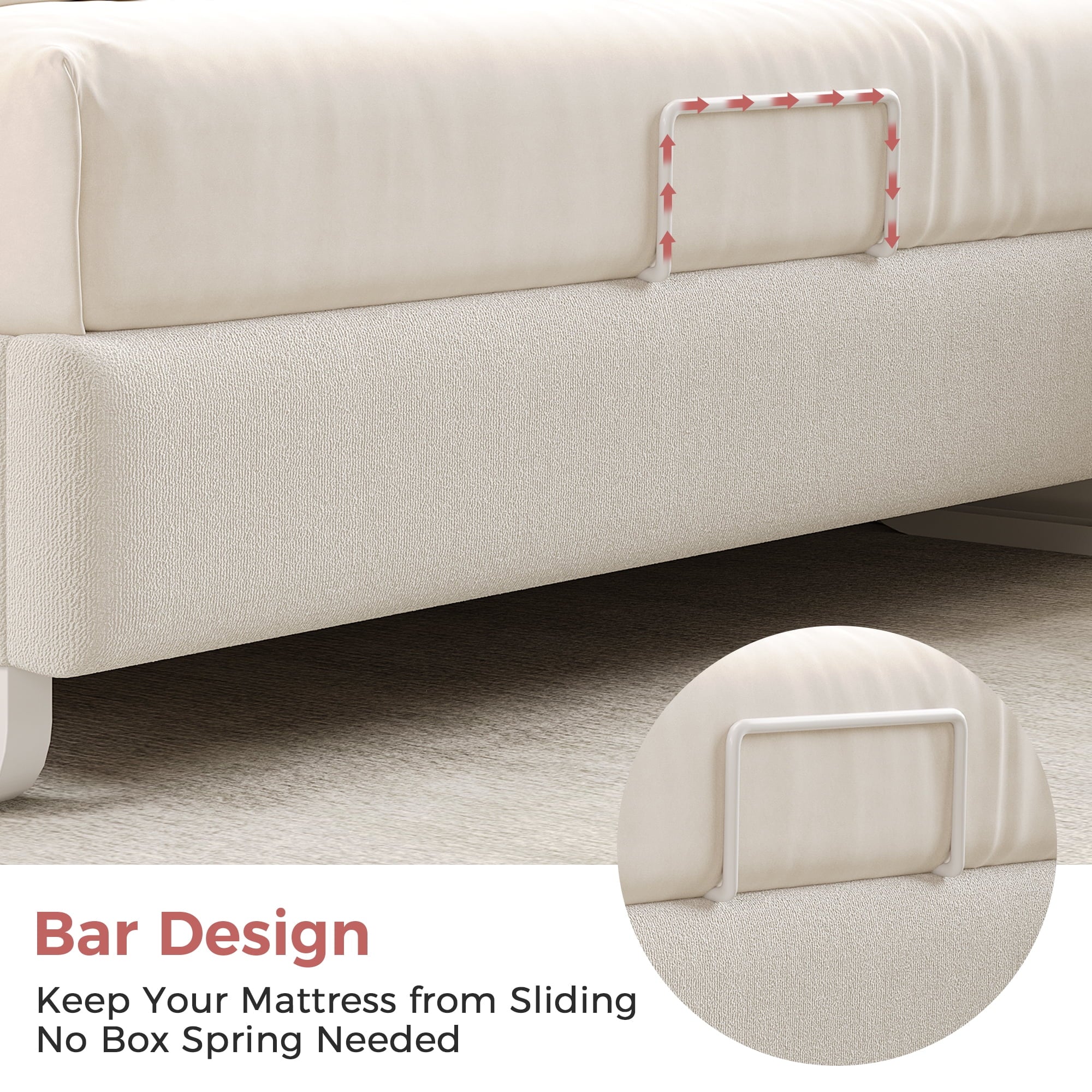 - 【Chic Double Arc and Height Adjustable Headboard】 Our full bed frame’s headboard boasts an elegant yet unique double arc design with a sleek curved profile, upholstered in skin-friendly boucle fabric and padded with soft sponge for ultimate comfort. Plus, the headboard’s height is adjustable to accommodate 8-12″ mattress sizes and provide optimal support while you relax in bed reading or watching TV.