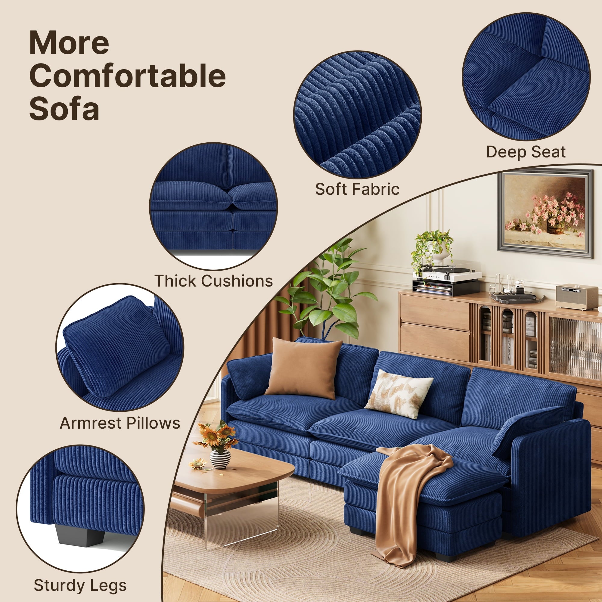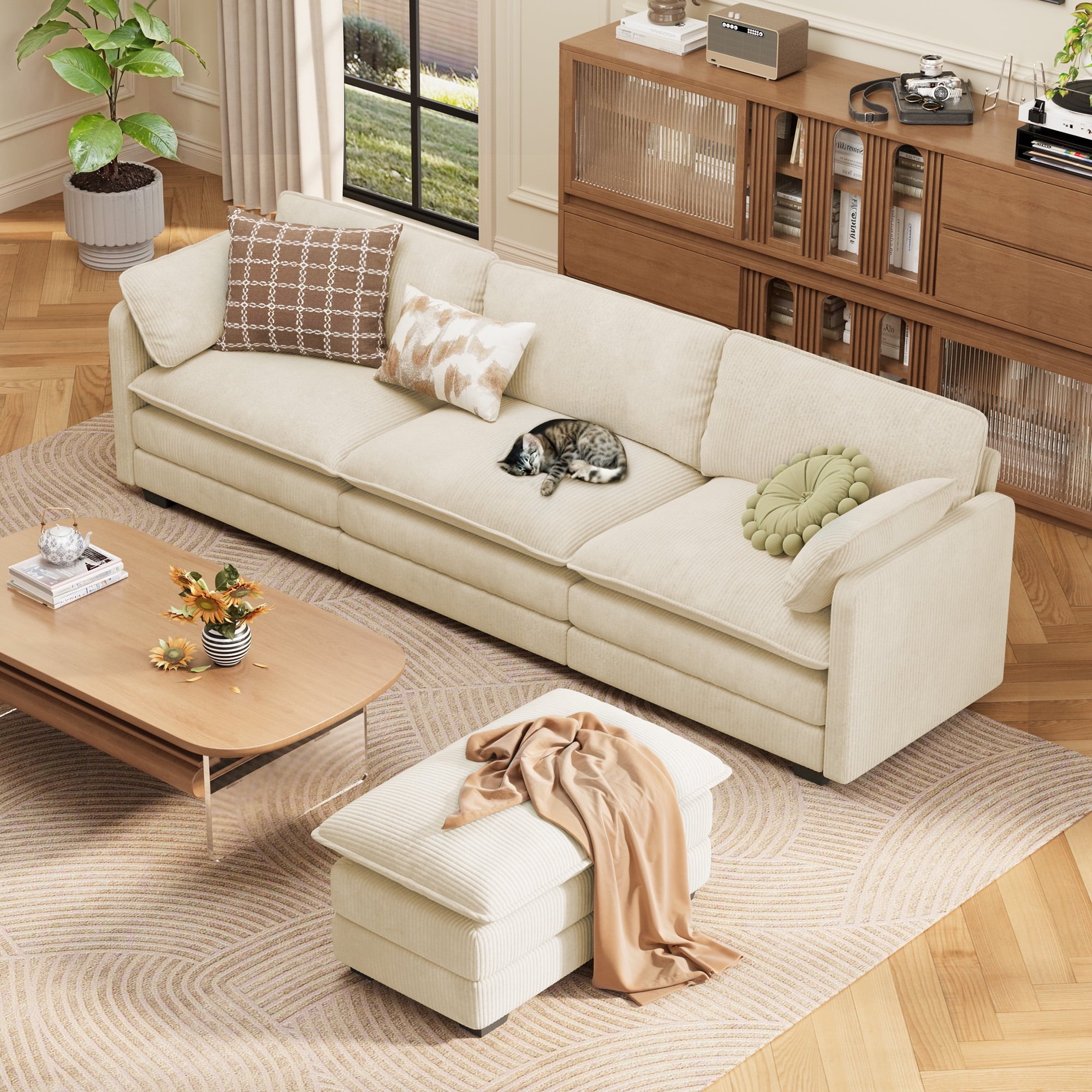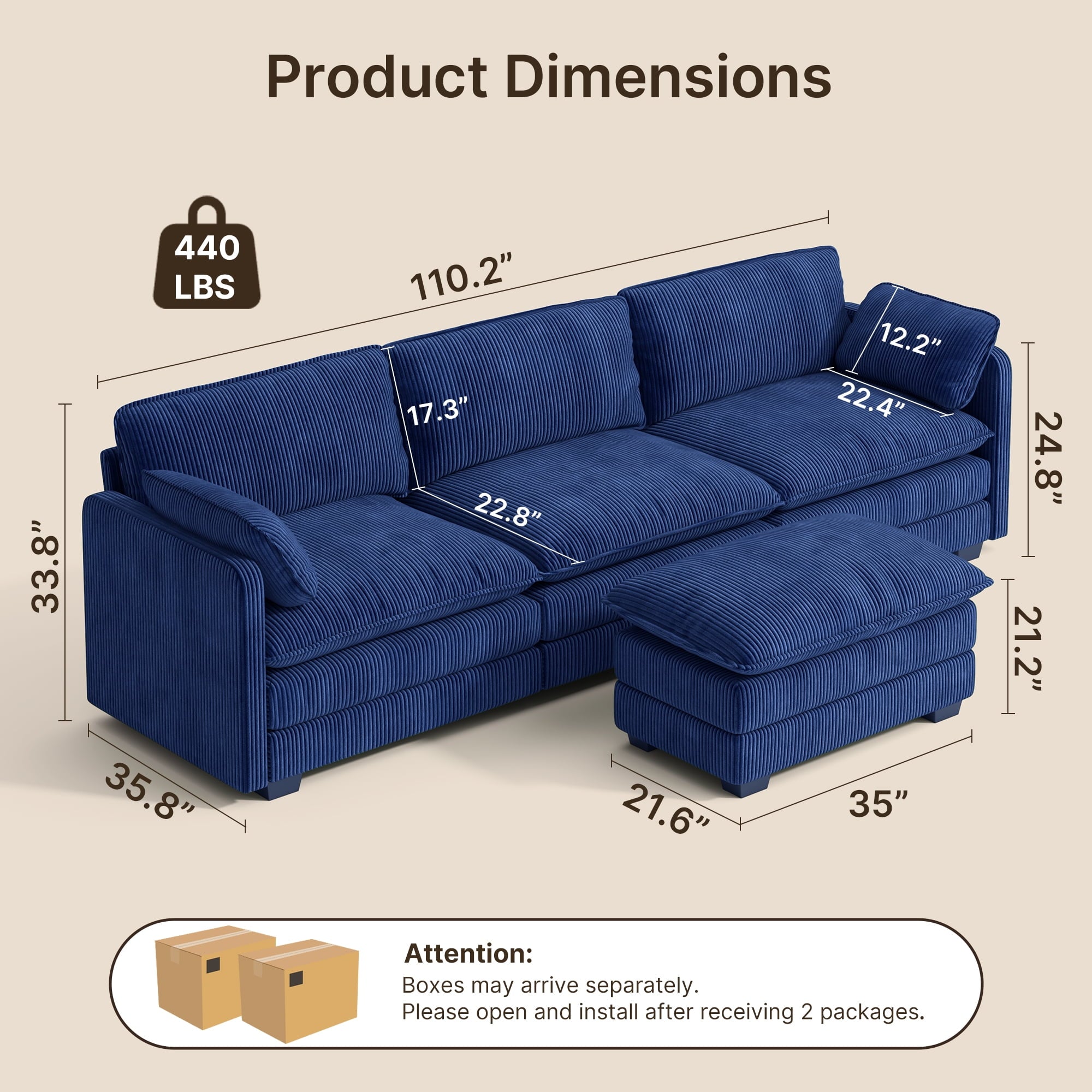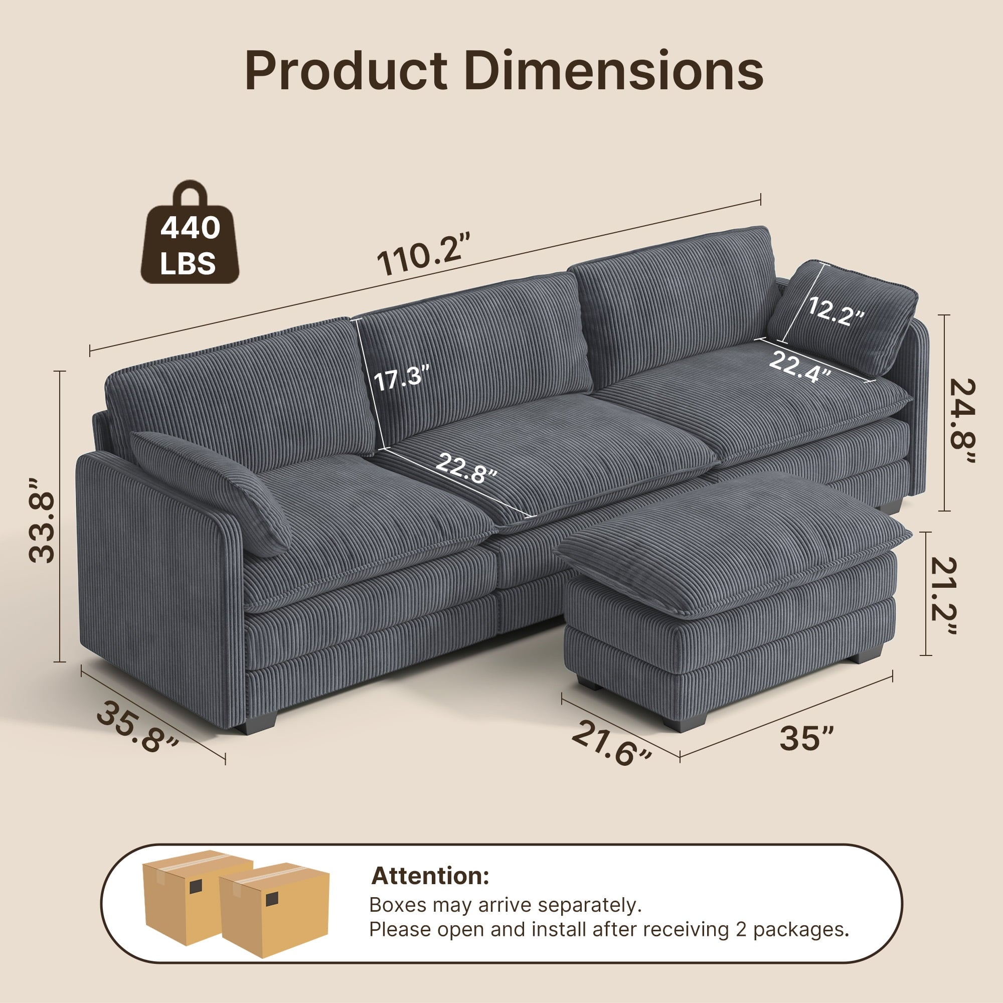 >>Features:✨ Cloud-Like Comfort for Total Relaxation: The double-layer high-resilience foam seat cushions deliver cloud-like softness while providing strong support—no more sinking too deep or feeling hard! The 22.8-inch deep seating area lets you lean back comfortably, and the 2 included arm pillows + movable ottoman let you adjust your lounging posture freely. Perfect for lazy Sundays, movie marathons, or post-work relaxation.🐾 Pet-Friendly Corduroy Fabric: Crafted with durable, tightly woven corduroy fabric, this sofa stands up to pet claws and playful scratches. All cushion covers have zippers and are fully removable—just toss them in the washing machine and tumble dry for easy cleaning. Say goodbye to stubborn pet hair, coffee spills, or dirt stains!🏠 Durable & Sturdy Structure: Built with a solid wooden frame and high-quality support springs, the sofa is stable and durable, not easy to shake or deform. The 108-inch length can comfortably seat 4 family members, and the ergonomic design (paired with arm pillows) alleviates pressure on your lower back and muscles—say goodbye to back pain from long sitting!🔄 Flexible Combination for Any Space: With the movable ottoman, this sofa can be rearranged into multiple styles: a 3-seater straight sofa, an L-shaped sectional, a sofa with a chaise, or even a temporary guest bed. It adapts to small living rooms, bedrooms, or apartments—you can create your own furniture layout!🛠️ Assembly Takes Time, But It’s Worth It: A friendly reminder—with 109 labeled parts, assembly may take some time. But we provide detailed picture-guided instructions to help you step by step. Note: The cushions are made of memory foam; after unpacking, pat them gently to speed up rebound, and wait up to 48 hours for the sofa to reach its optimal shape—your patience will be rewarded with a super comfy sofa!🤝 48-Hour After-Sales Support: If you encounter missing parts, damaged components, or assembly troubles, contact us immediately. Our team will respond within 48 hours and assist you until the problem is fully resolved.