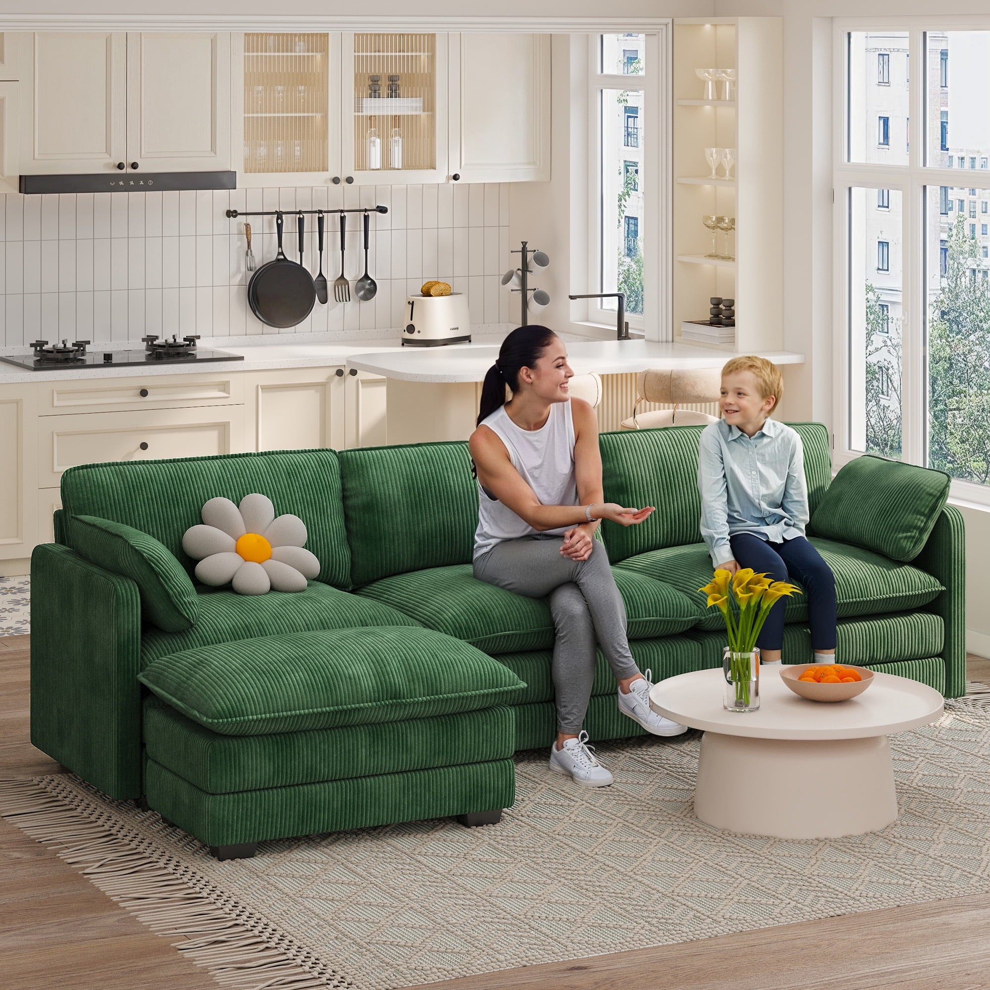 >>Specifications:Color: Grey & Beige & GreenType: L-Shaped Sectional Sofa (with movable ottoman)Number of Seats: 3-Seater (can seat 4 people comfortably)Seat Height: 21.2 inchesSeat Depth: 22.8 inchesSofa Length: 108 inchesNumber of Packages: 2 (may arrive separately)Item Weight: 166 lbsAssembly Required: Yes (with 109 labeled parts + picture instructions)Material: Solid Wooden Frame, High-Density Foam, Support Springs, Soft Corduroy Fabric (polyester fill)Special Features: Cloud-Like Softness, Pet-Friendly, Removable Washable Cushion Covers, Movable Ottoman, Flexible Combination, Double-Layer Cushions, Ergonomic DesignRecommended Uses: Ideal for living rooms (daily lounging), bedrooms (extra seating), apartments (space-saving), student apartments (multi-functional), or home offices (relaxation breaks).>>📦 What’s Included:1 x Picture-Guided Assembly Instruction Manual1 x L-Shaped Sectional Sofa Main Body (split into 2 packages)1 x Movable Ottoman2 x Arm Pillows1 x Assembly Accessories Pack