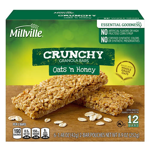 Stay satisfied all afternoon with these Millville Oats ‘n Honey Crunchy Granola Bars! The crispy granola bars are made with whole grain oats and come in convenient twin packs. With no artificial colors, flavors, preservatives, or high fructose corn syrup, they’re the perfect snack for a busy day at the office or a packed school day!