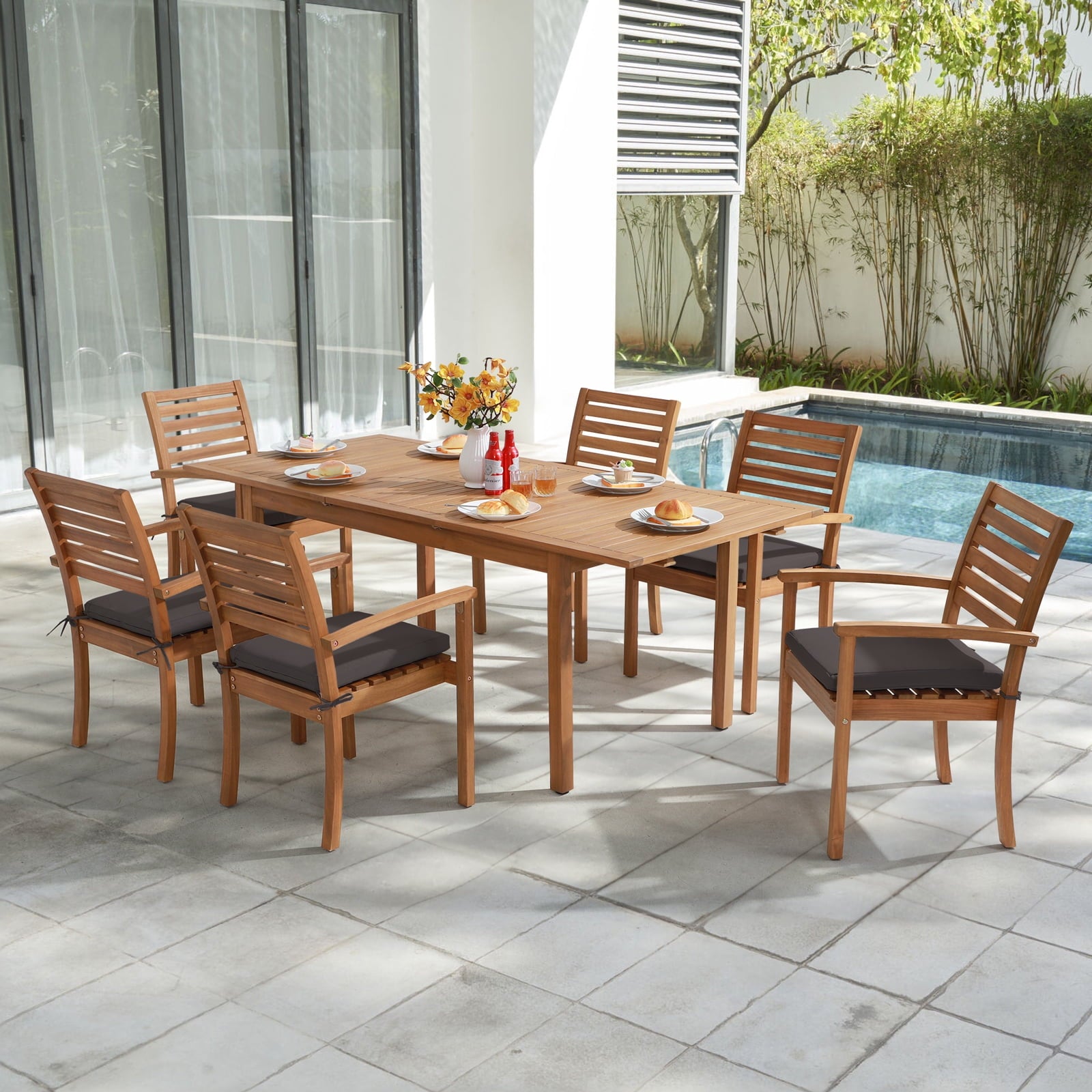 - : Our 7-piece outdoor dining set is constructed of sustainable FSC-certified acacia wood to ensure the chair can hold up to 300 lbs! The surface is coated with high-grade oil paint making the patio table and chairs weather-proof and built to last.