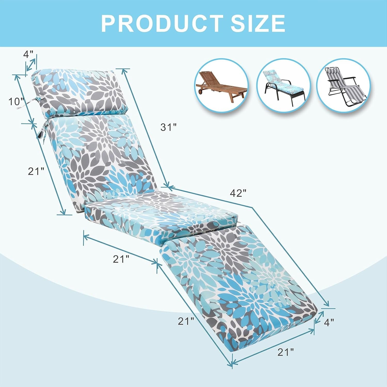 - ⭐suitable size – you will get a chaise lounge cushion, in which the cushion size is 21*42 inches and the backrest size is 31*21 inches, suitable for most indoor chaise lounges, outdoor chaise lounges, tri-fold design, easy to store, also suitable for folding chairs, which can be used in a variety of outdoor environments, such as poolside, beach and patio.