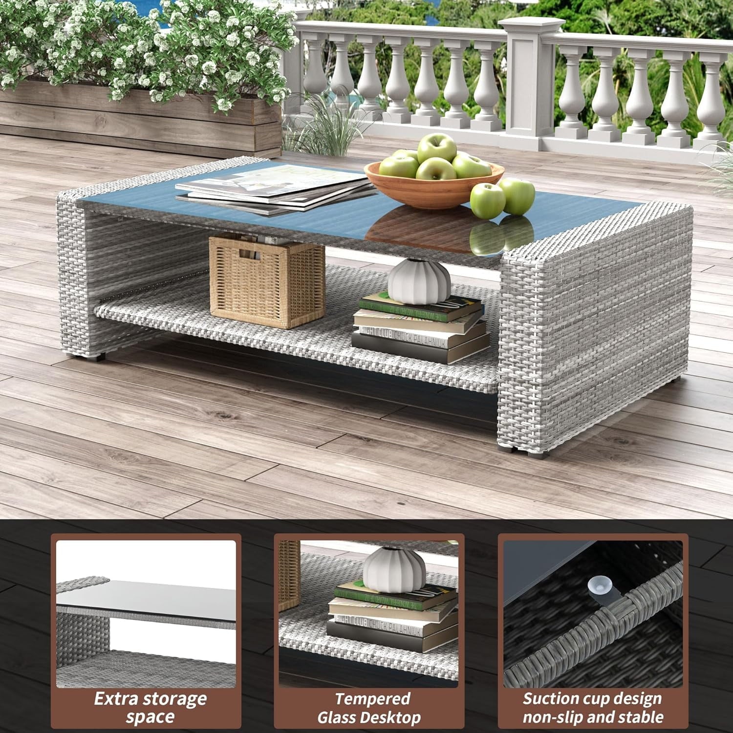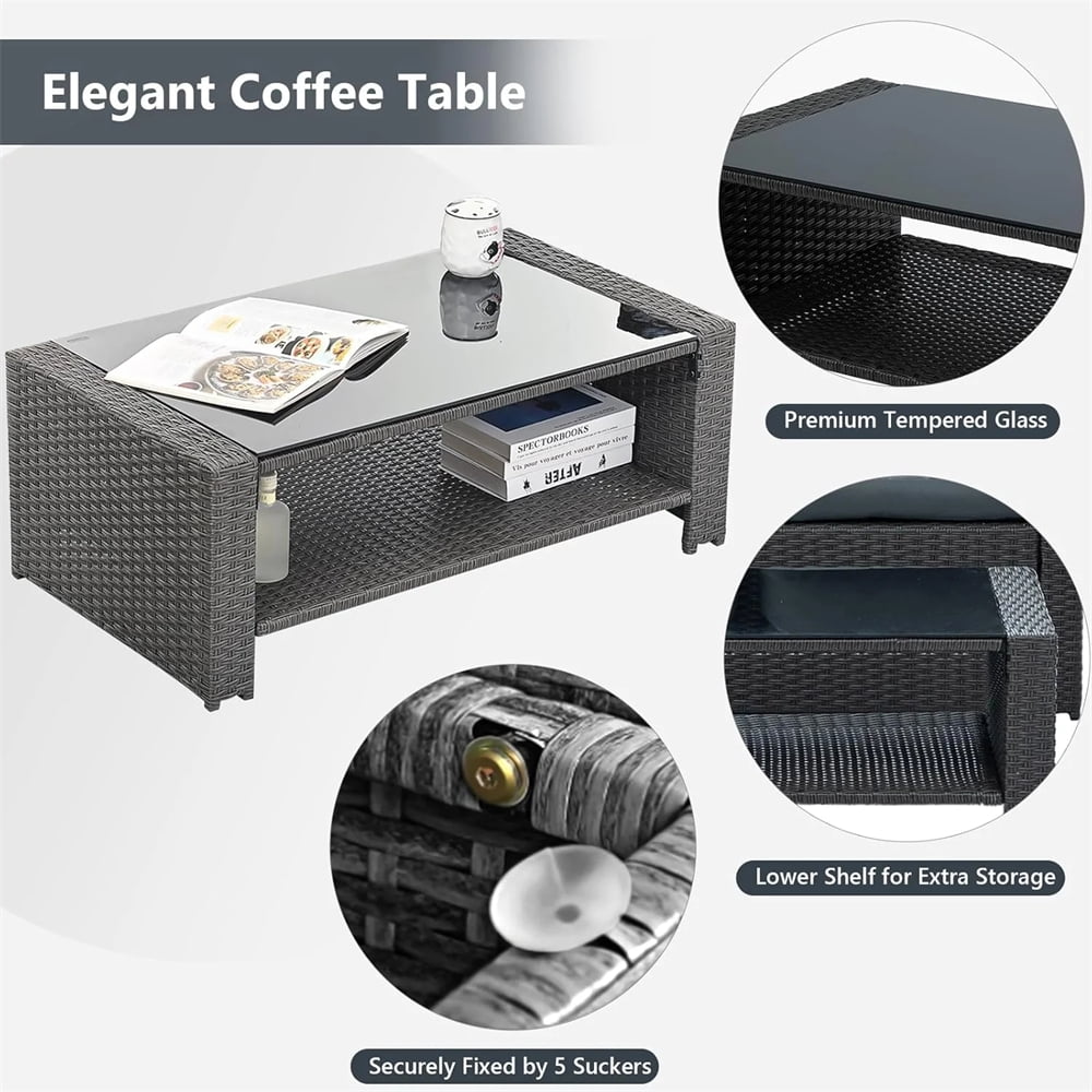 - Our 4-piece patio conversation set includes a coffee table with a removable tempered glass top secured with suction cups. Even if liquids like champagne are spilled, there’s no need to worry about it tipping over. Simply wipe the glass back to its original shape.