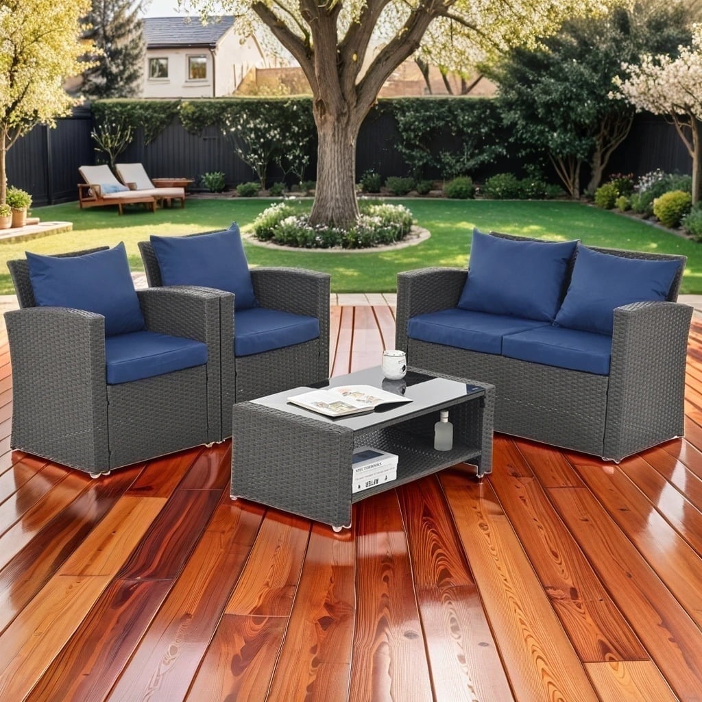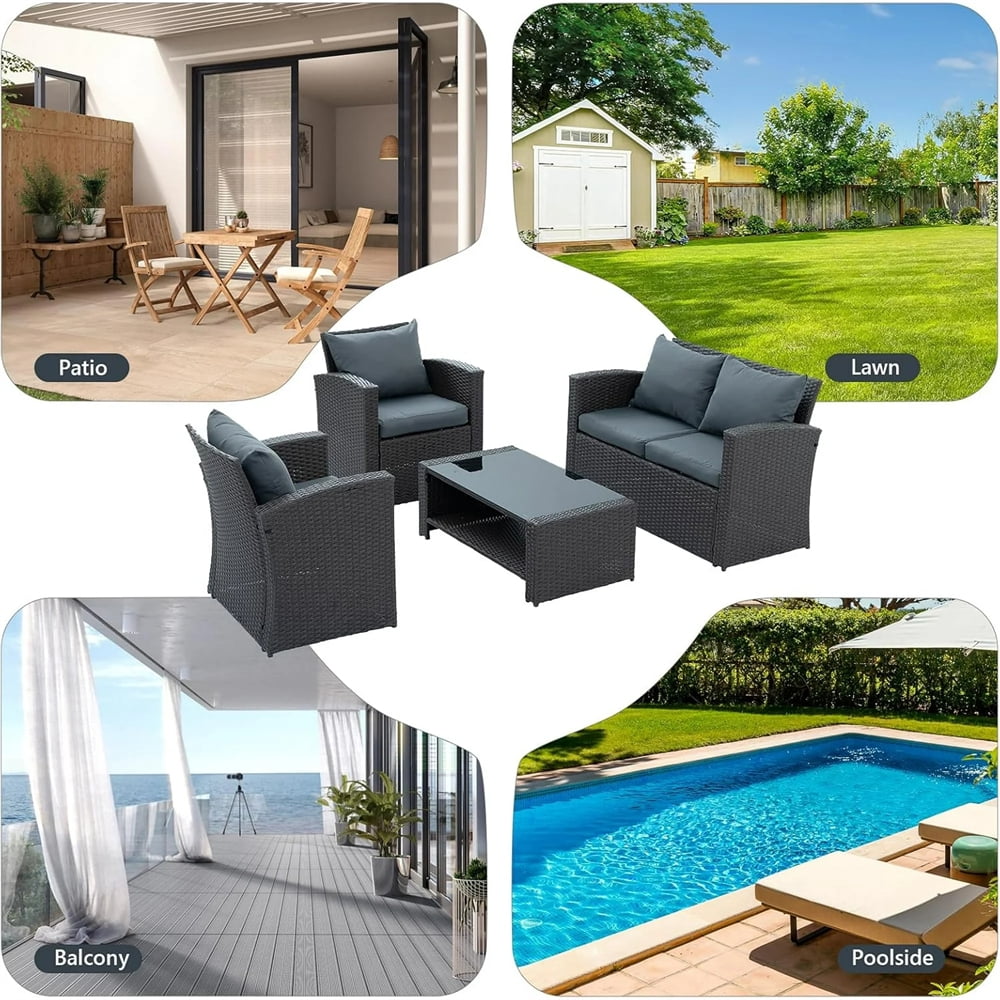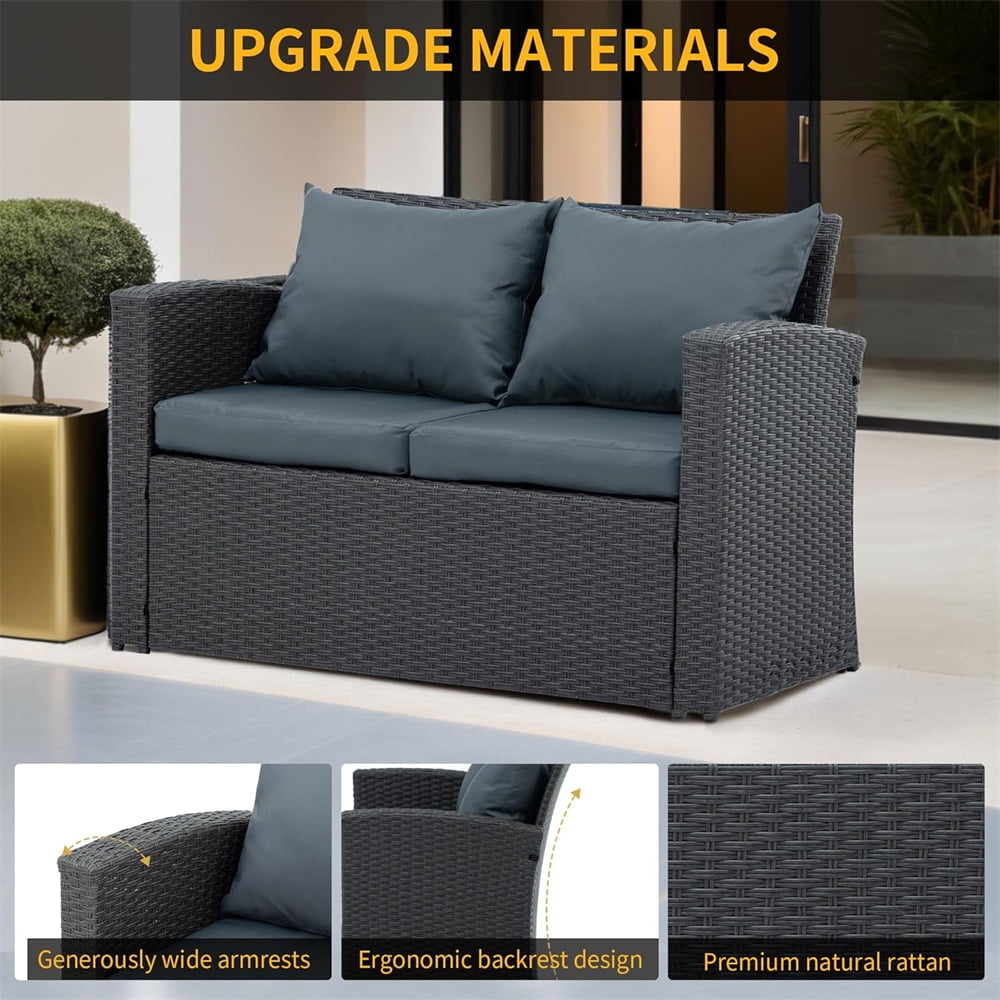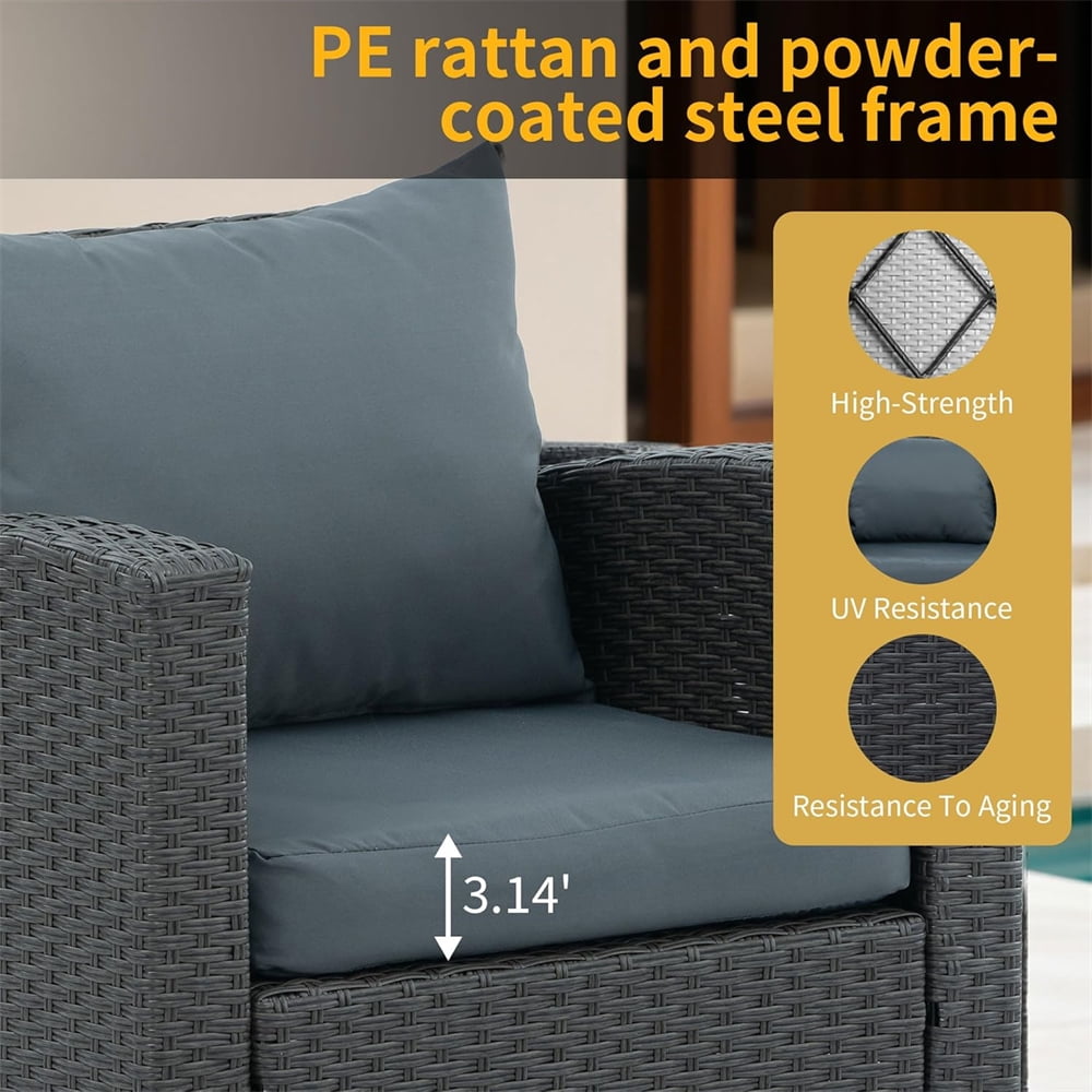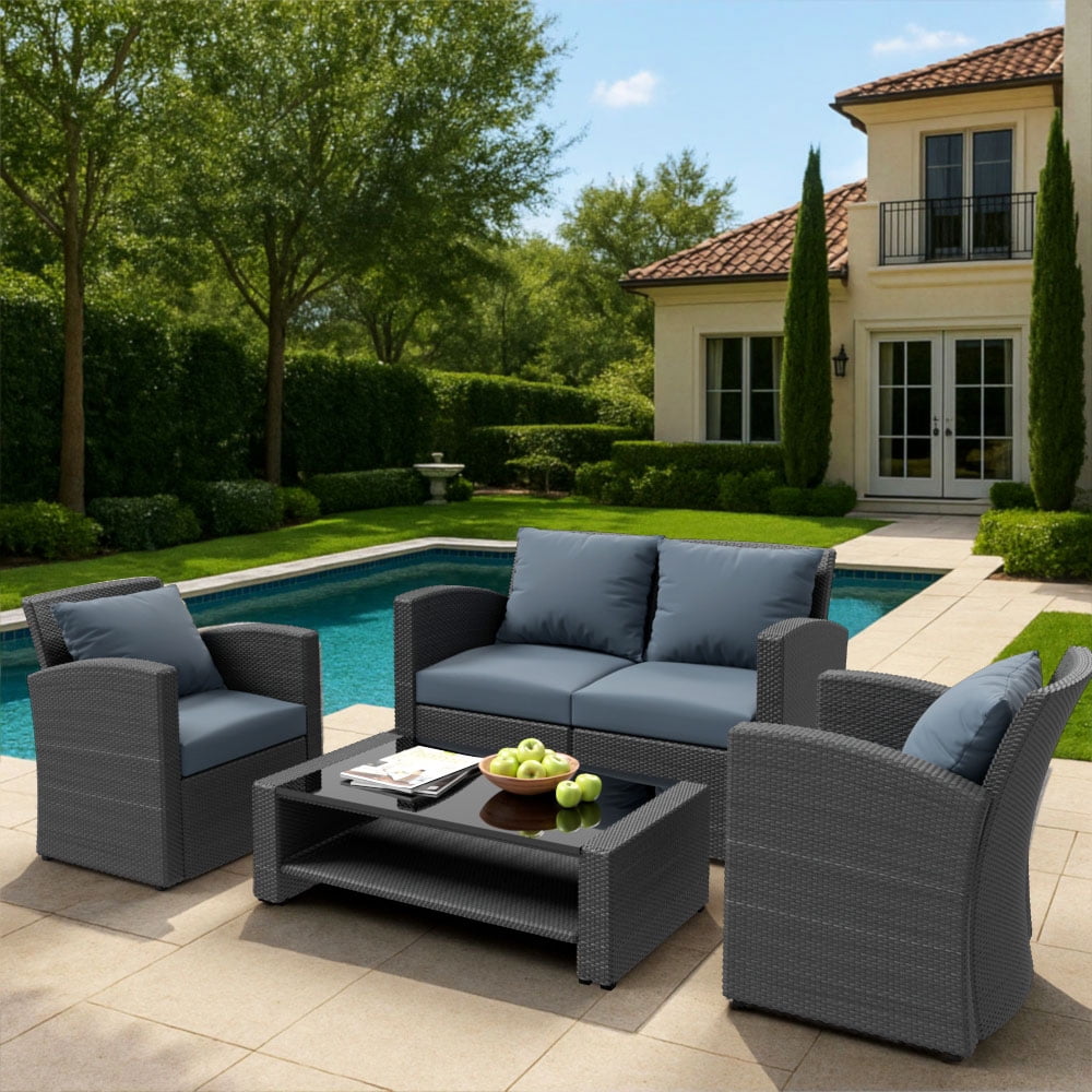 - Our 4-piece sofa set features a sturdy steel frame and finely hand-woven rattan, making it weatherproof and quick to clean and ready for use after a rainy day. Perfect for your living room, patio, or poolside.