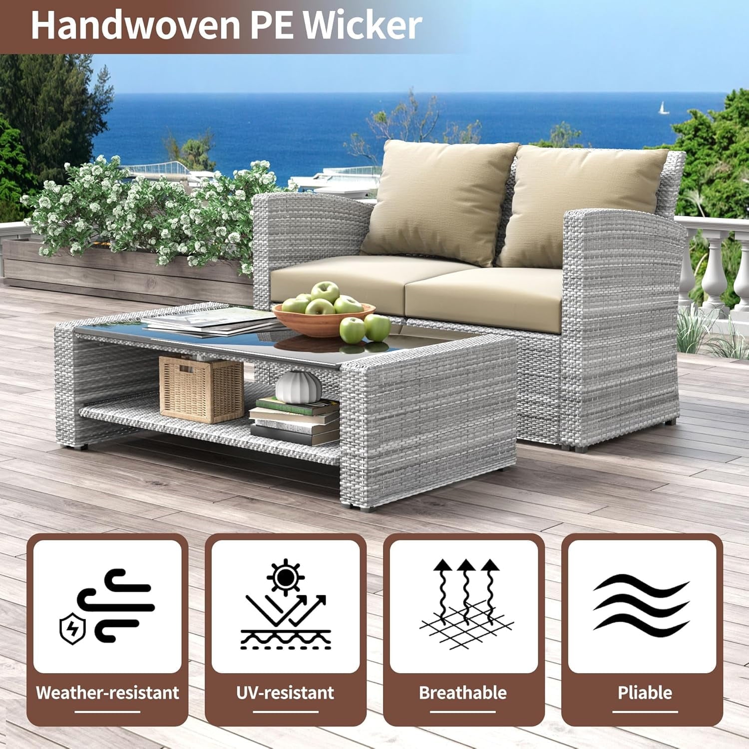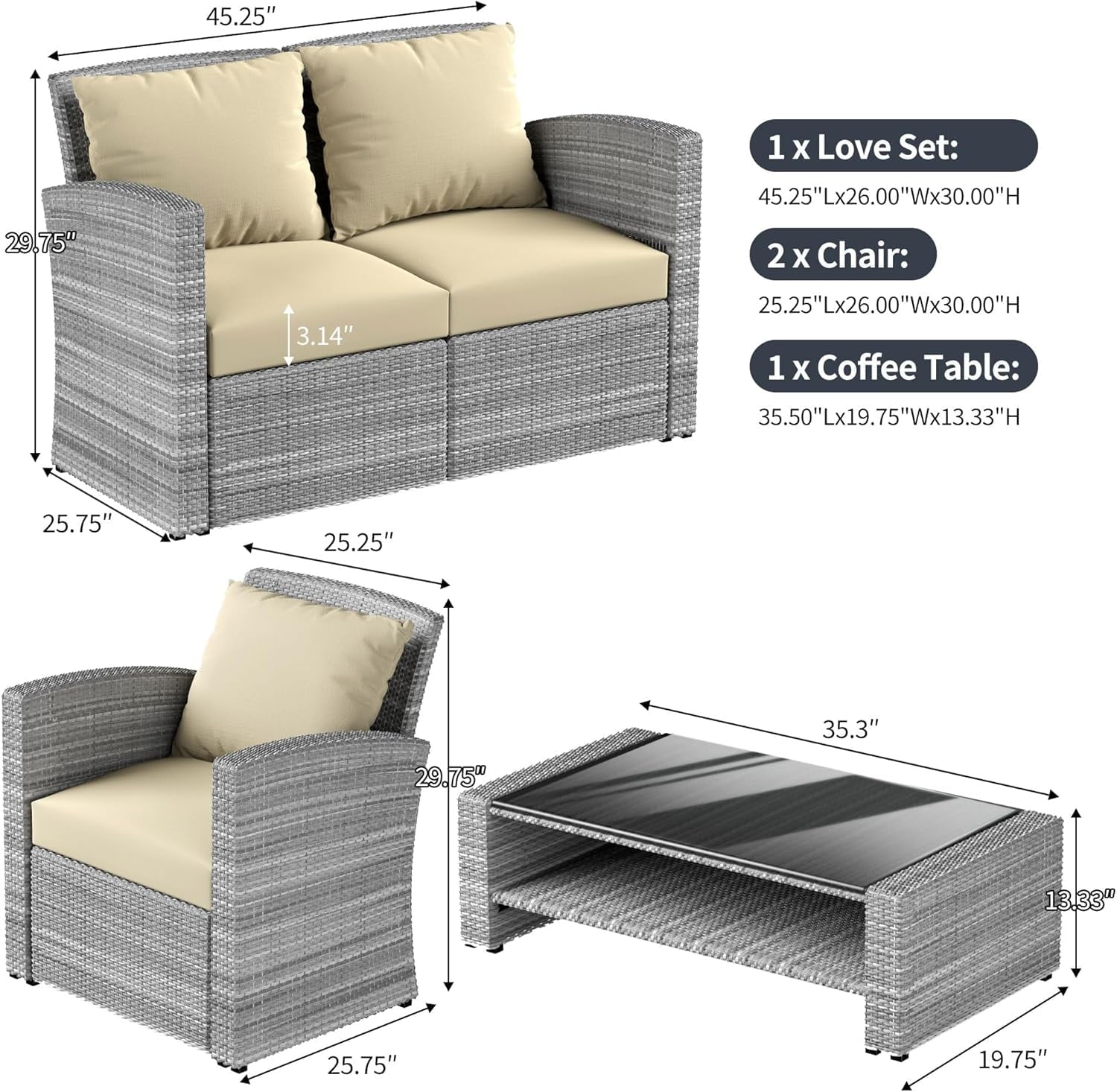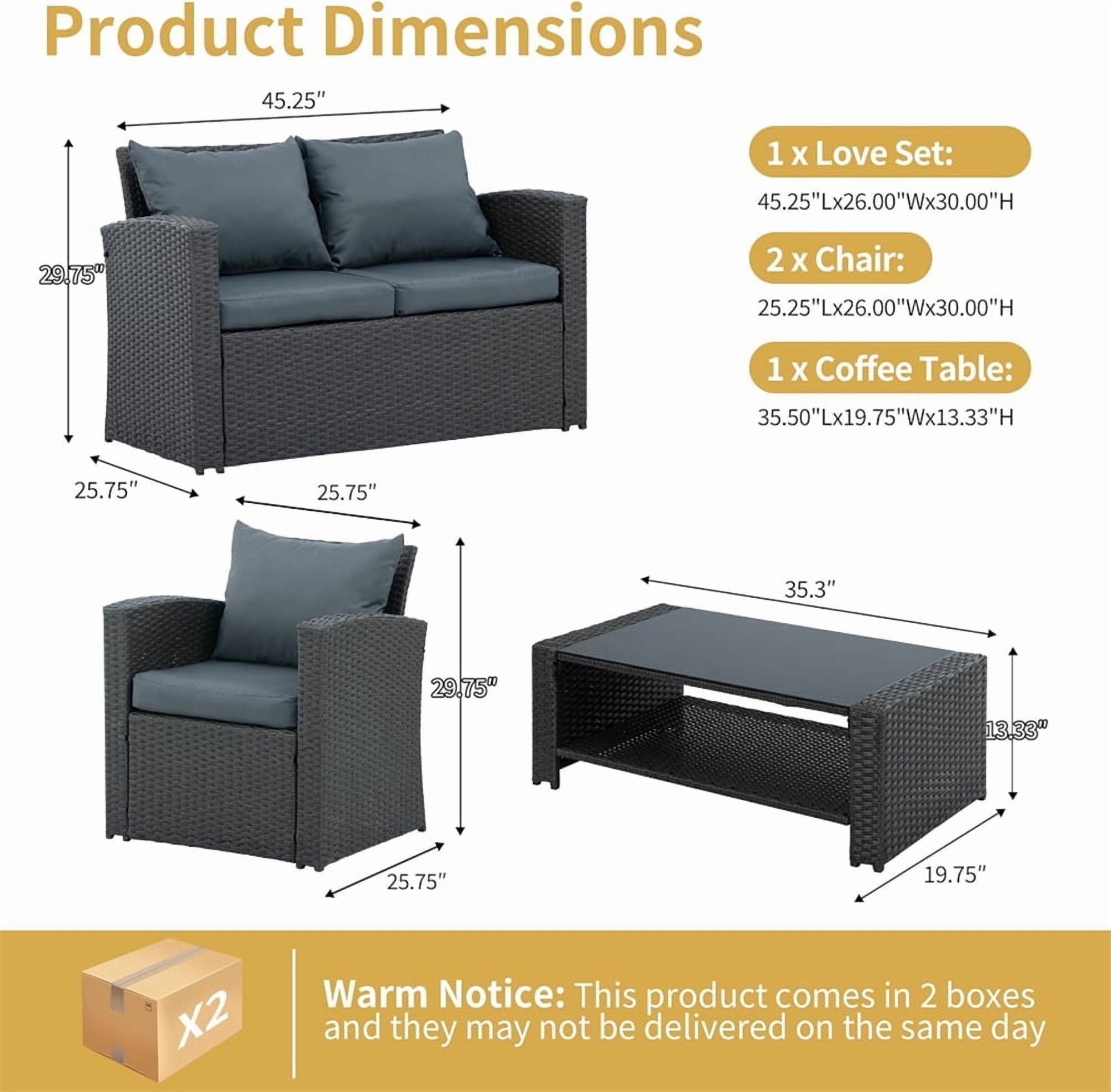 - This outdoor furniture set includes 2 single armchairs, a loveseat and a coffee table, each easily movable for optimal space utilization.