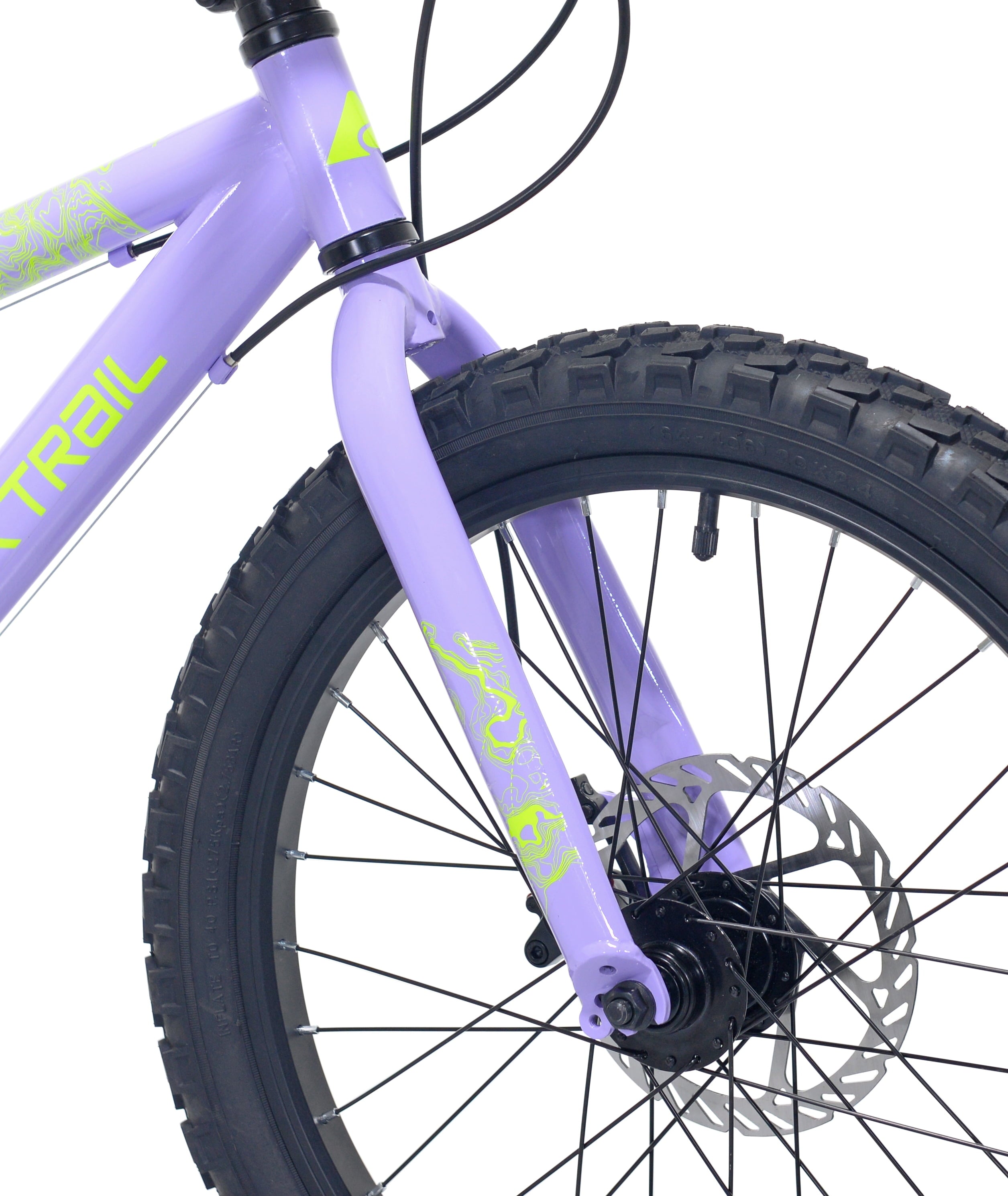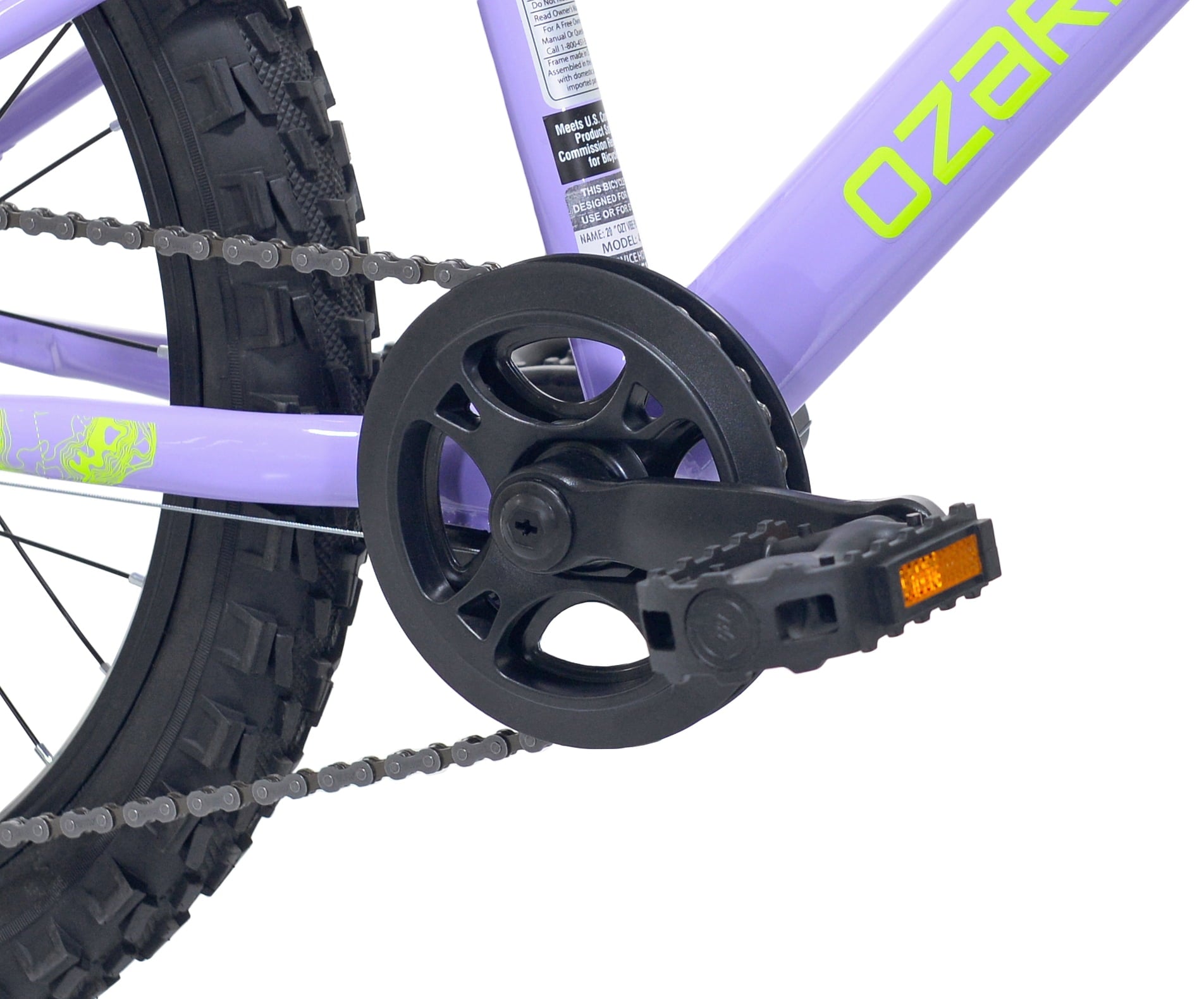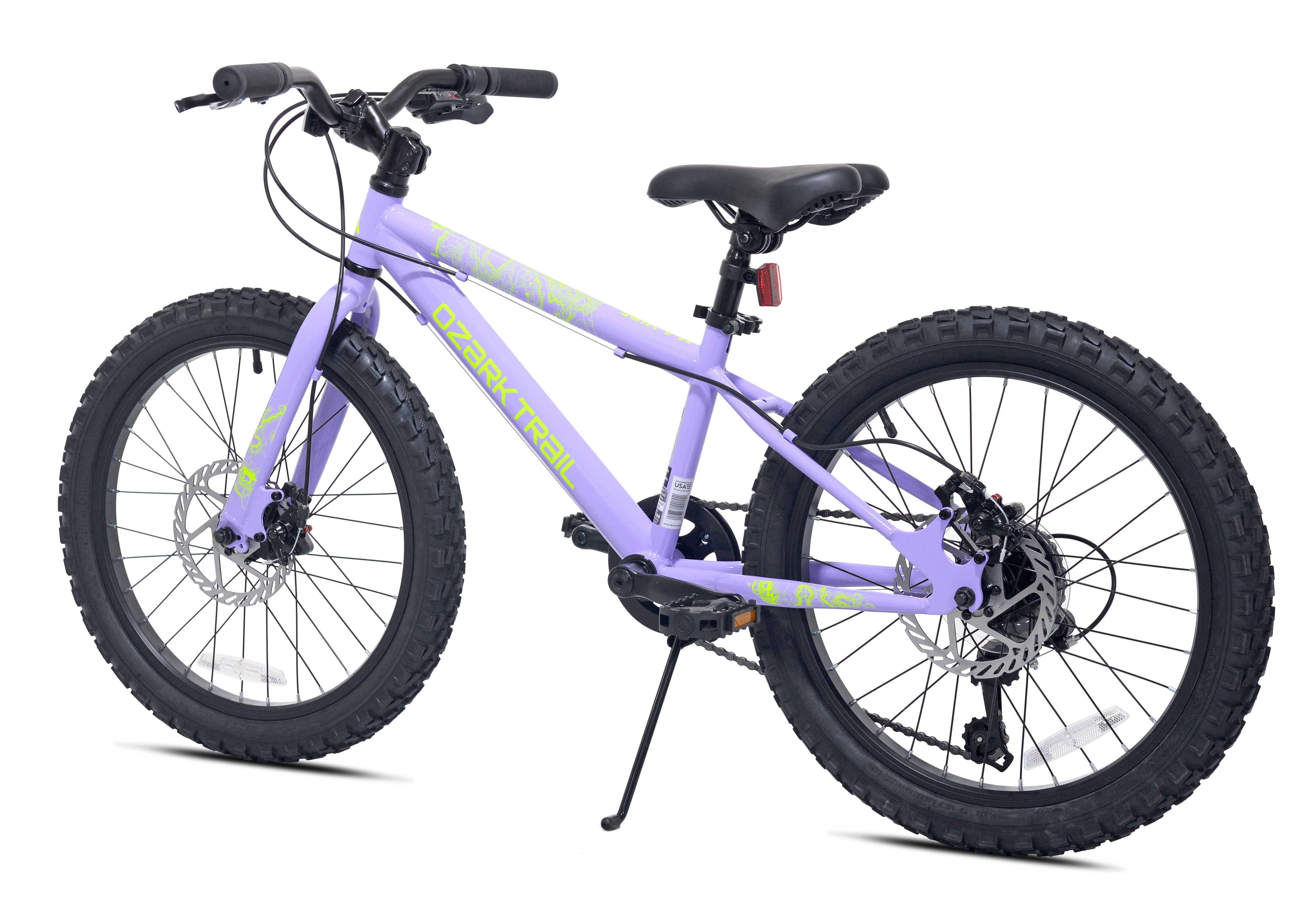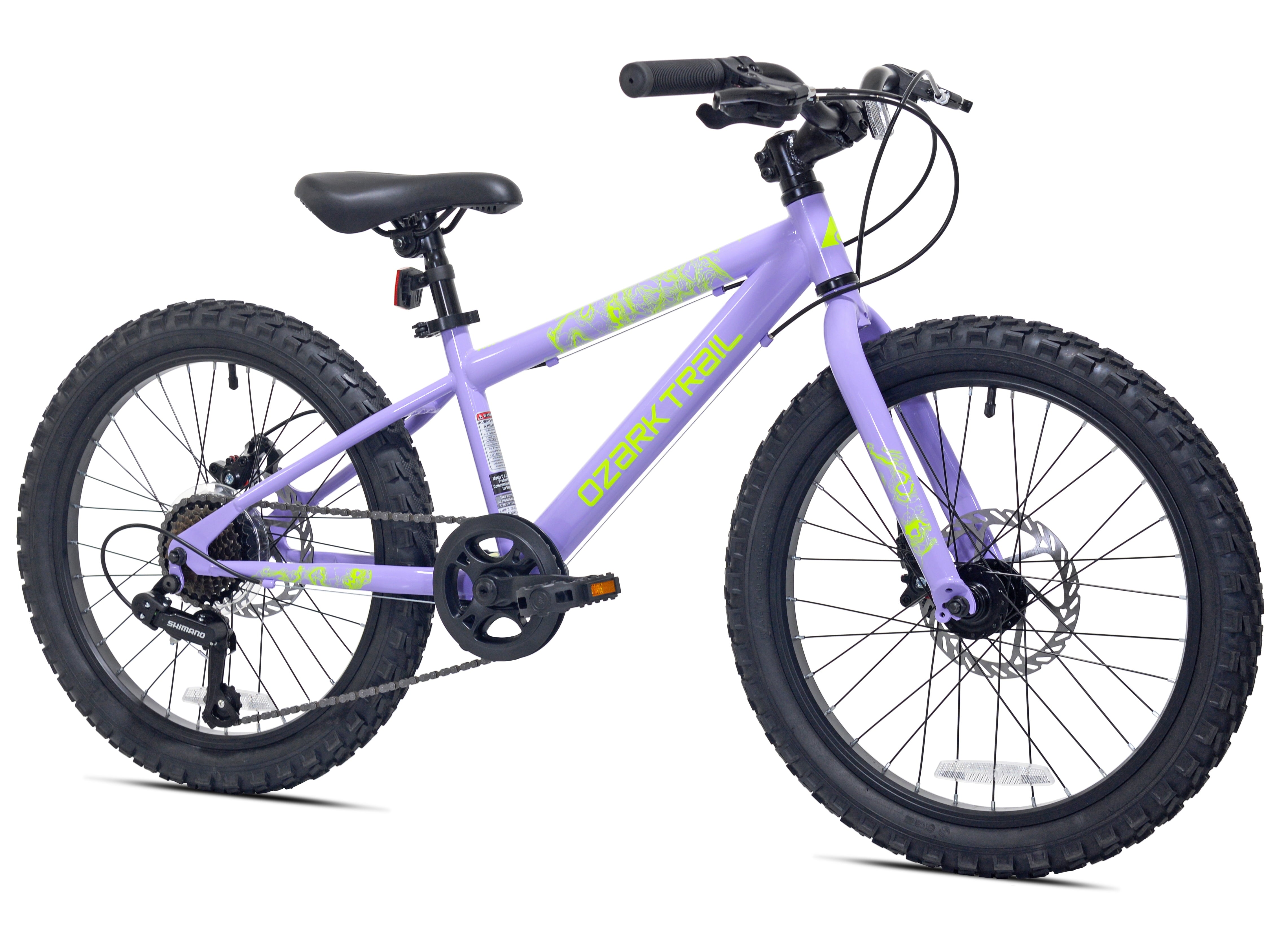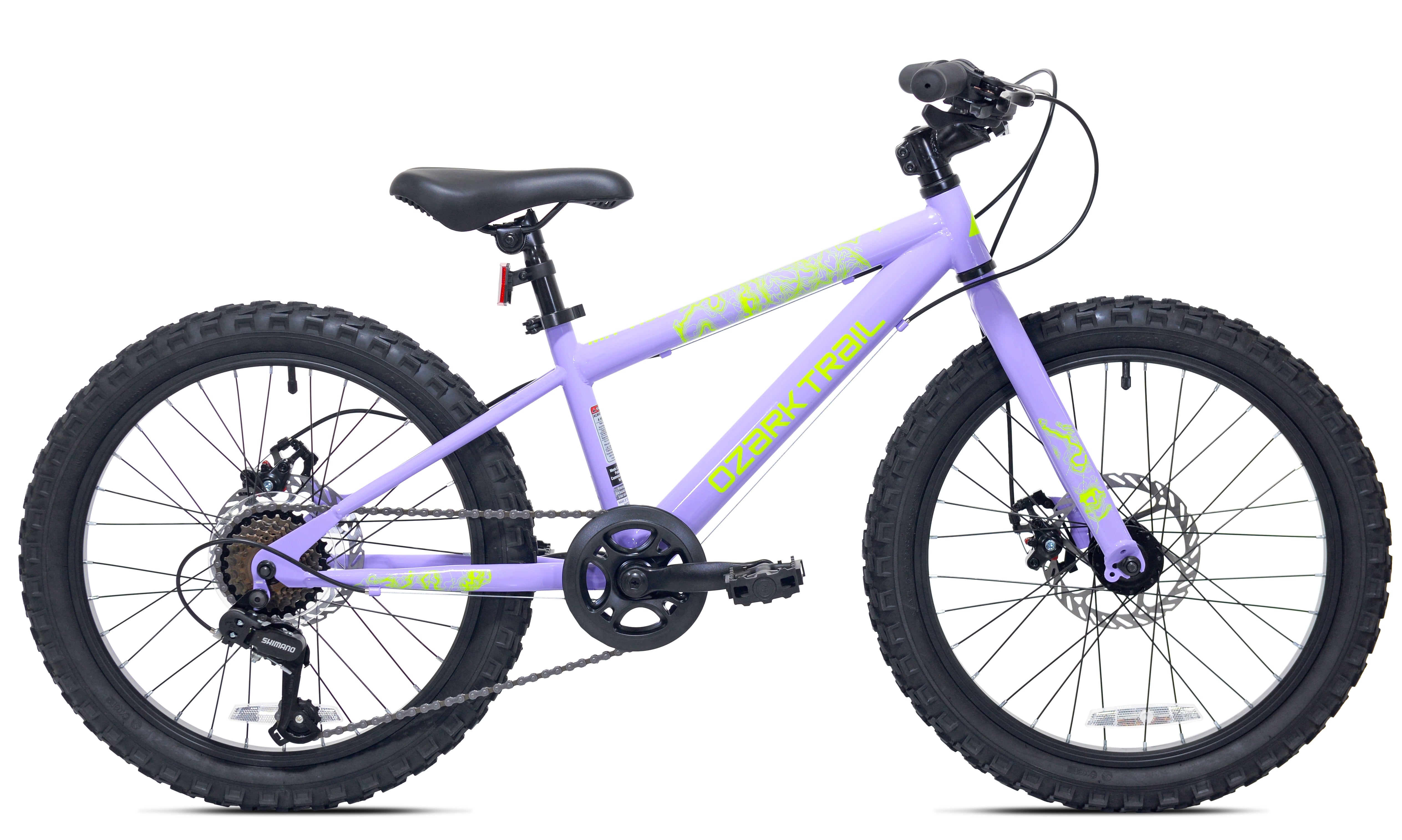 The 20″ Ozark Trail Vibe mountain bike hits the sweet spot with its capability, versatility, and affordability. This mountain bike is designed specifically for your young riders’ trail-riding needs. The dual mechanical disc brakes give substantial stopping power during normal trail riding and deep descents. Knobby MTB tires to tackle tougher terrain with ease. Quickly and smoothly transition through the 7 gears with the handlebar-mounted trigger shifters as you tear up the trail. Adjustability is key for a proper fit, so this bike offers great geometry and an adjustable saddle height for growing riders. If you’re looking for a capable mountain bike for your child/tween/teen the 20″ Ozark Trail Vibe has you covered.