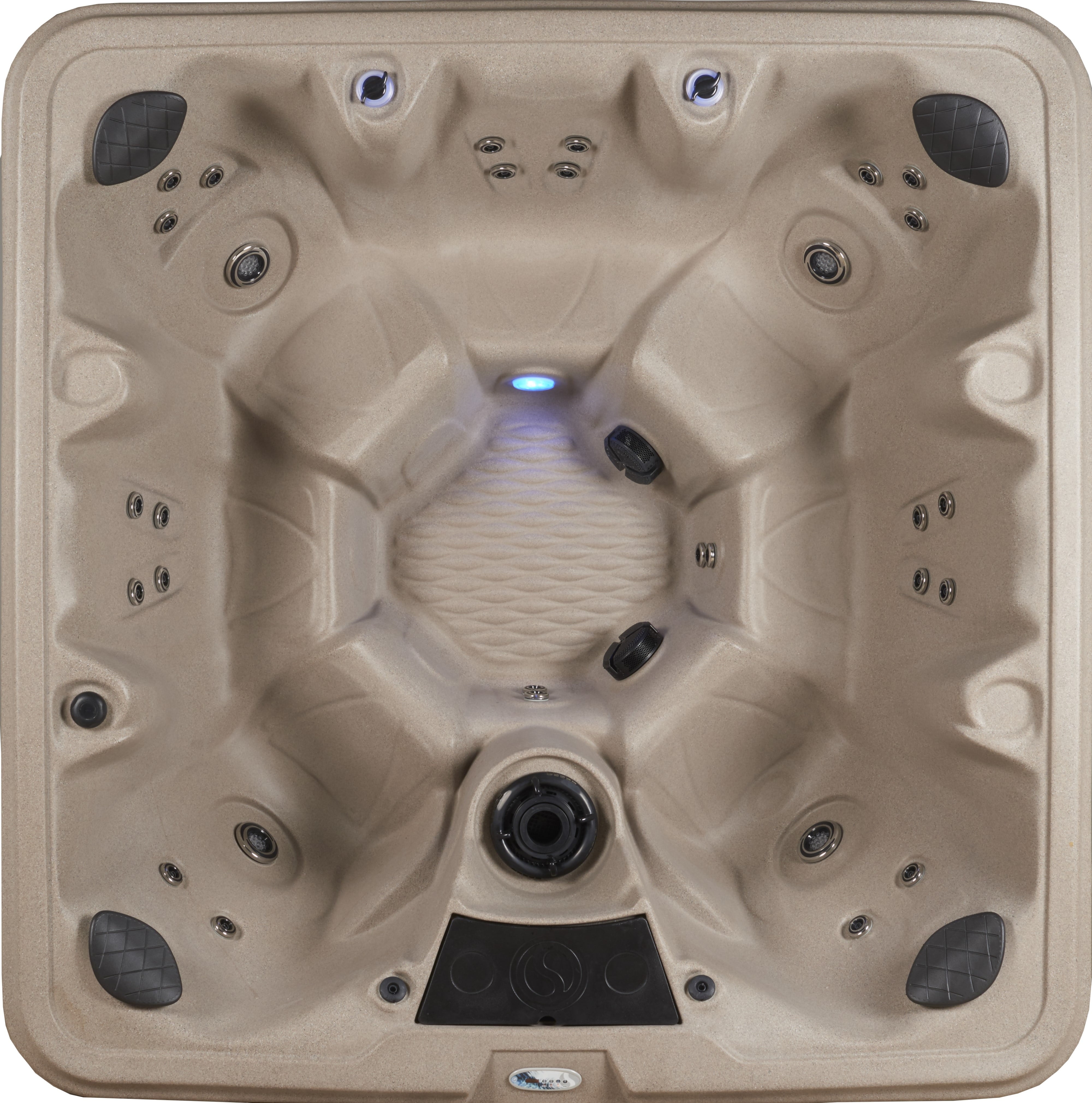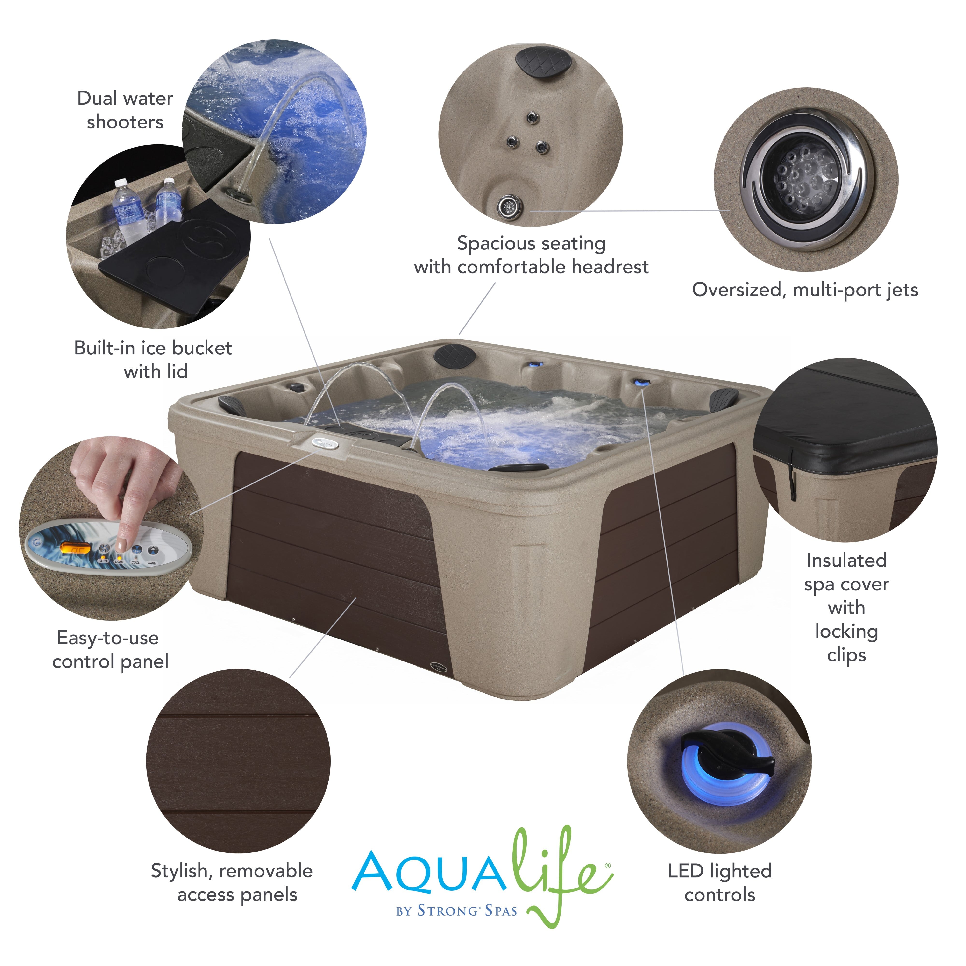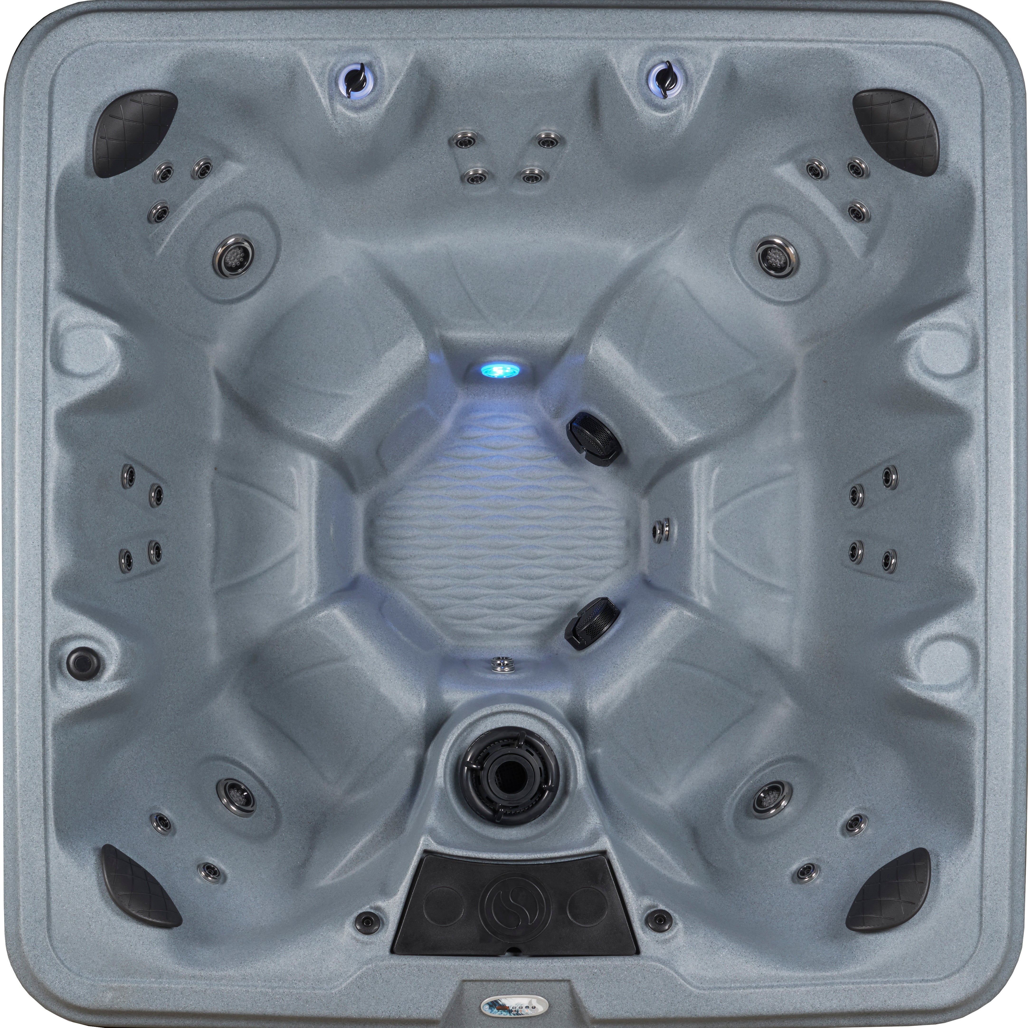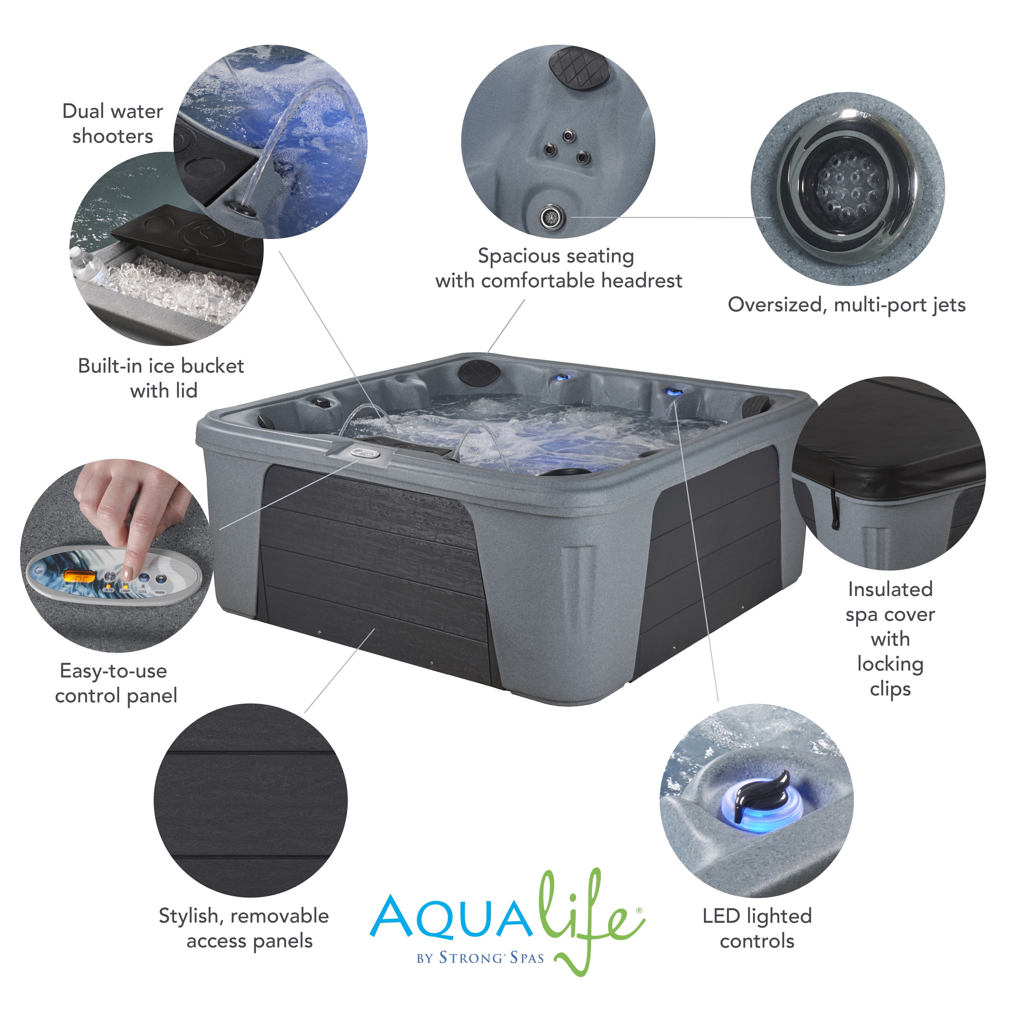 Your personal oasis is a Palm Beach™ Spa from Aqualife by Strong Spas. Oversized, multiport hydrotherapy jets focus on the areas of muscle tension and stress that need it most. Palm Beach has 30 two-tone adjustable stainless steel jets. It is powered by a 2BHP 2-speed pump providing powerful hydrotherapy. There is seating for up to 7 in this spacious non-lounger model with 82 hydrotherapy ports. The Palm Beach also has amenities such as a dual water column feature, LED controls, programmable LED underwater lighting and digital backlit display. A convenient ice bucket with lid puts refreshments at your fingertips.