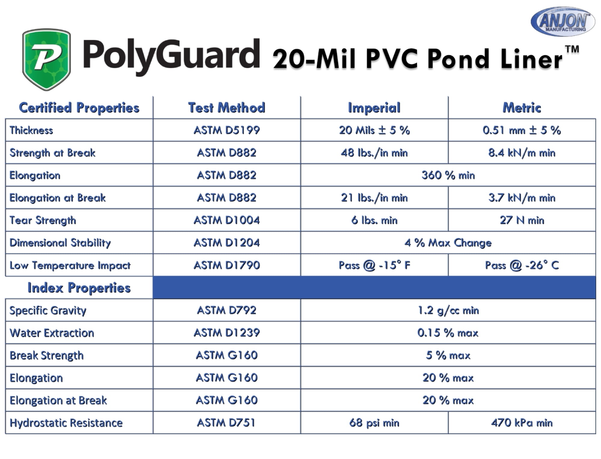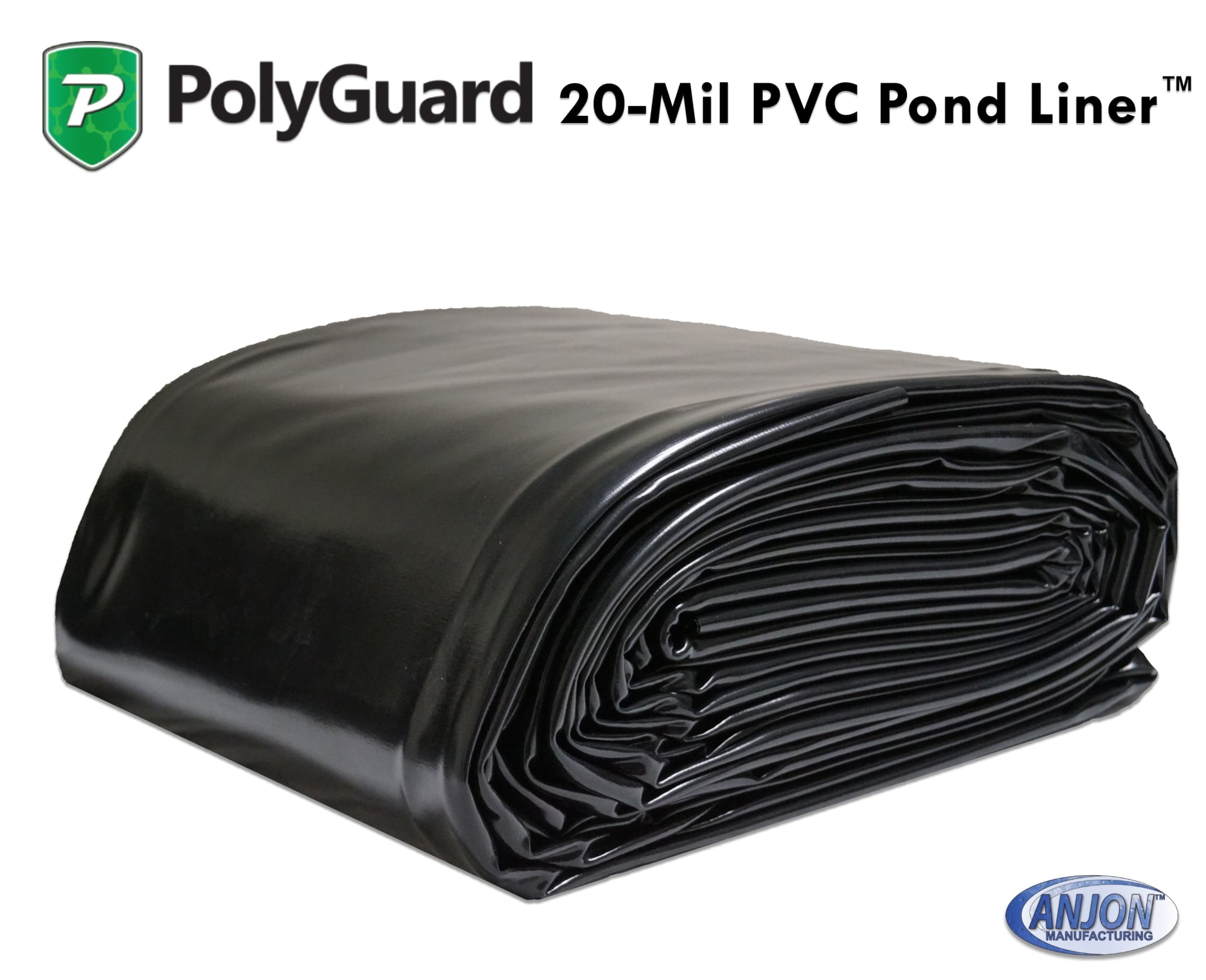 Anjon Manufacturing PolyGuard 20-Mil PVC Pond Liner PolyGuard 20-Mil PVC Pond Liners are the most cost effective versatile and adaptable liners available. Ideal for ponds of all sizes with steep or gentle sloping sides, tight corners, contours and shelving. Pliable and flexible; conforms to a variety of irregular surfaces. Excellent choice for water gardens, fish ponds and backyard waterfalls. PolyGuard PVC Pond Liner is light weight and easy to install Attaches easily to waterfall boxes, weirs and skimmers. Remains flexible and pliable even in extreme hot or cold temperatures. Contains plasticizers which will deteriorate in direct sunlight. For best results use ground cover, rocks or gravel to protect PVC liner from direct sun exposure. Contains plasticizers which will deteriorate in direct sunlight. For best results use ground cover, rocks or gravel to protect PVC liner from direct sun exposure. PolyGuard PVC Pond Liner has a standard 5-Year Manufacturers Warranty, but when installed with UnderGuard Underlayment the warranty is extended to a 10-Year Manufacturer’s Warranty!