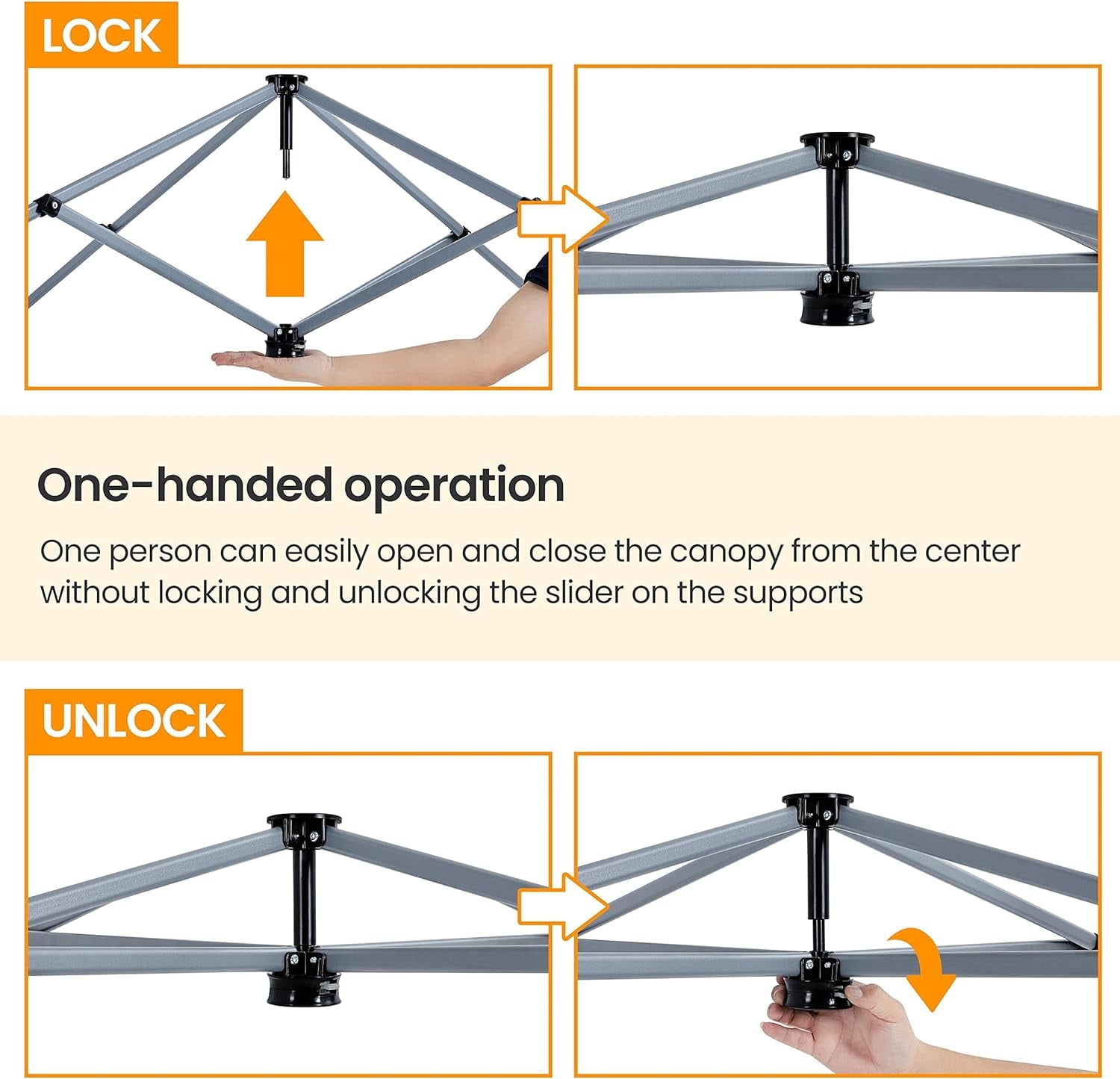 - Quick and Simple Assembly: This 10×10 ft instant canopy requires just one person to set up or fold down within minutes. The intuitive push-pull mechanism at the frame’s center ensures hassle-free operation.