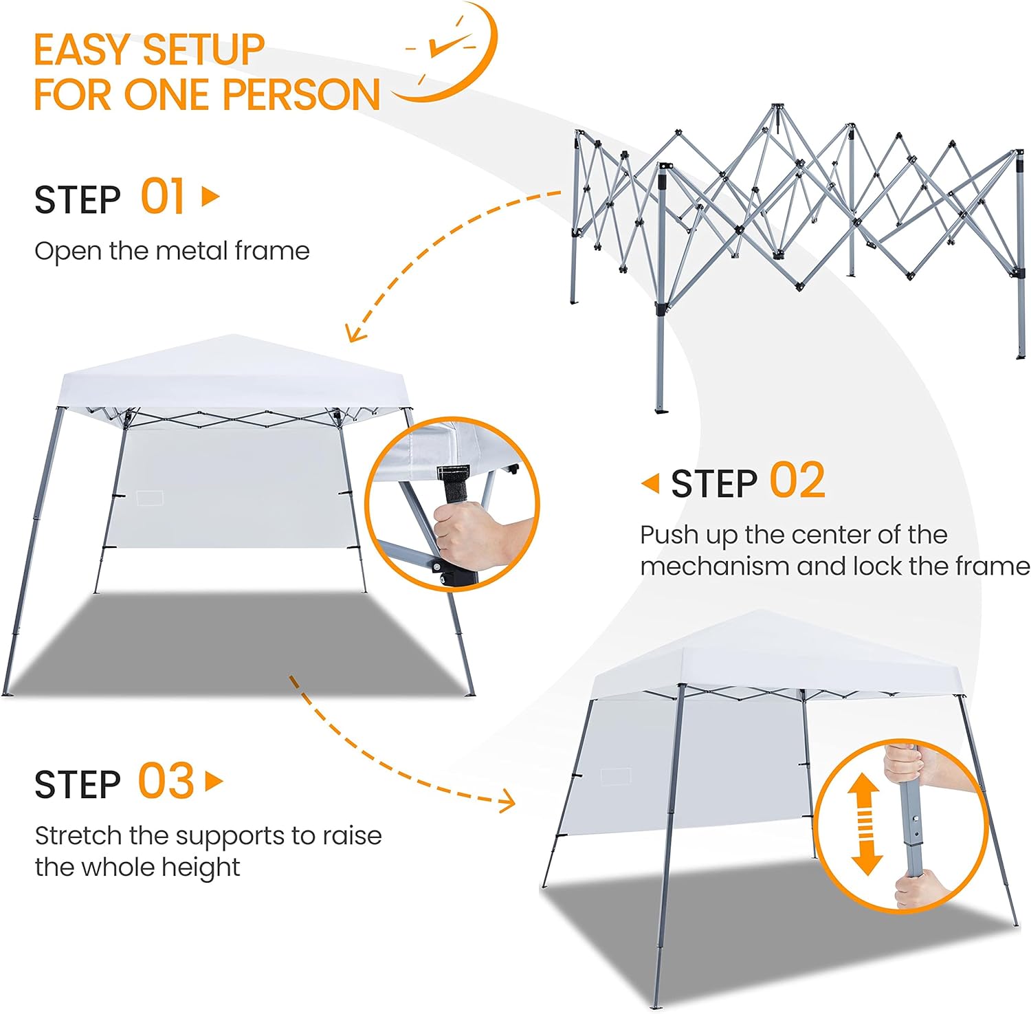 One-person Setup Within Minutes: You’ll only need one adult to set up or take down this 10 ft × 10 ft instant canopy. Just a simple push or pull at the center knob of the frame and you’ll have the whole thing up or down in just a matter of minutes