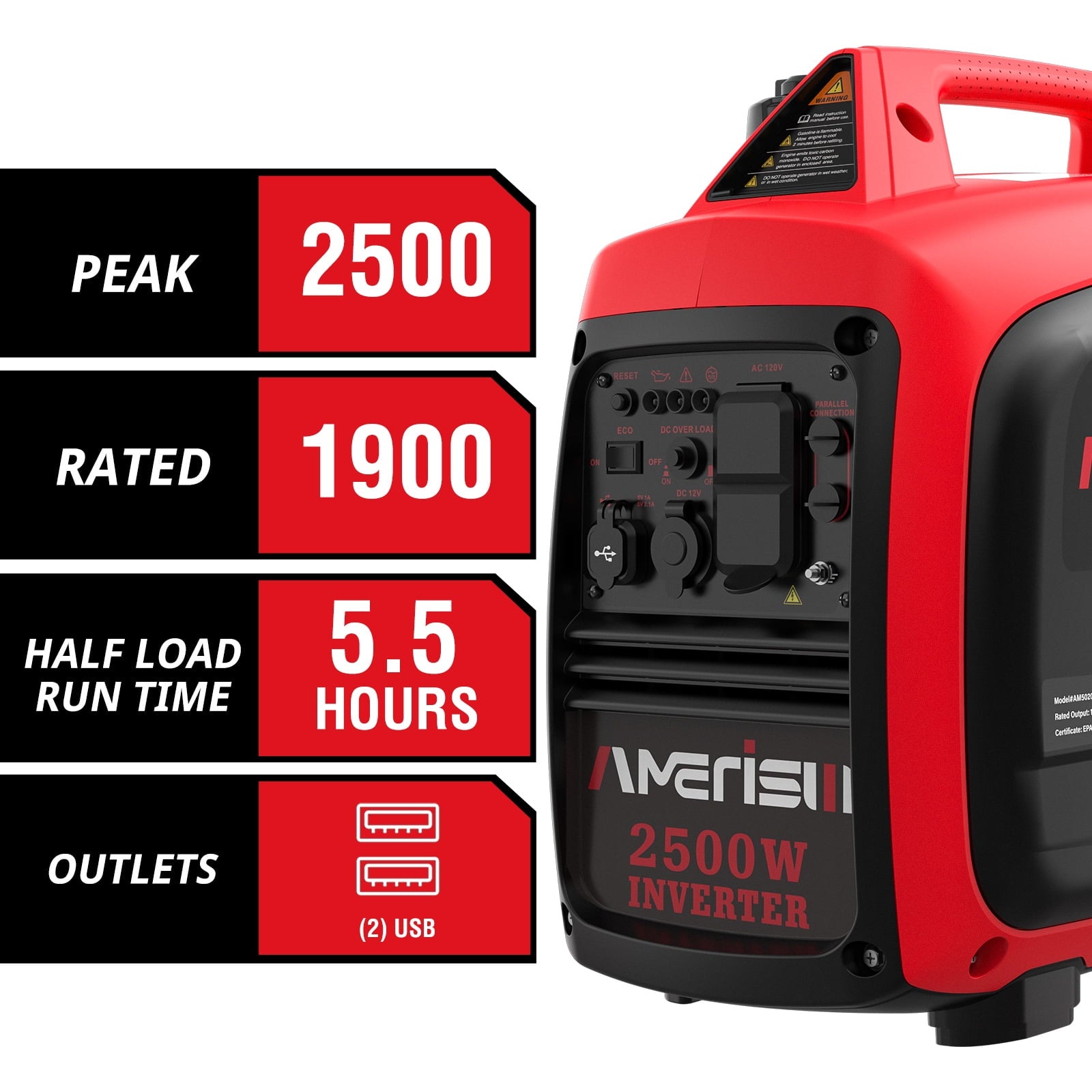 - Run time at 50% load: 5.5 hour