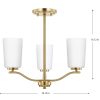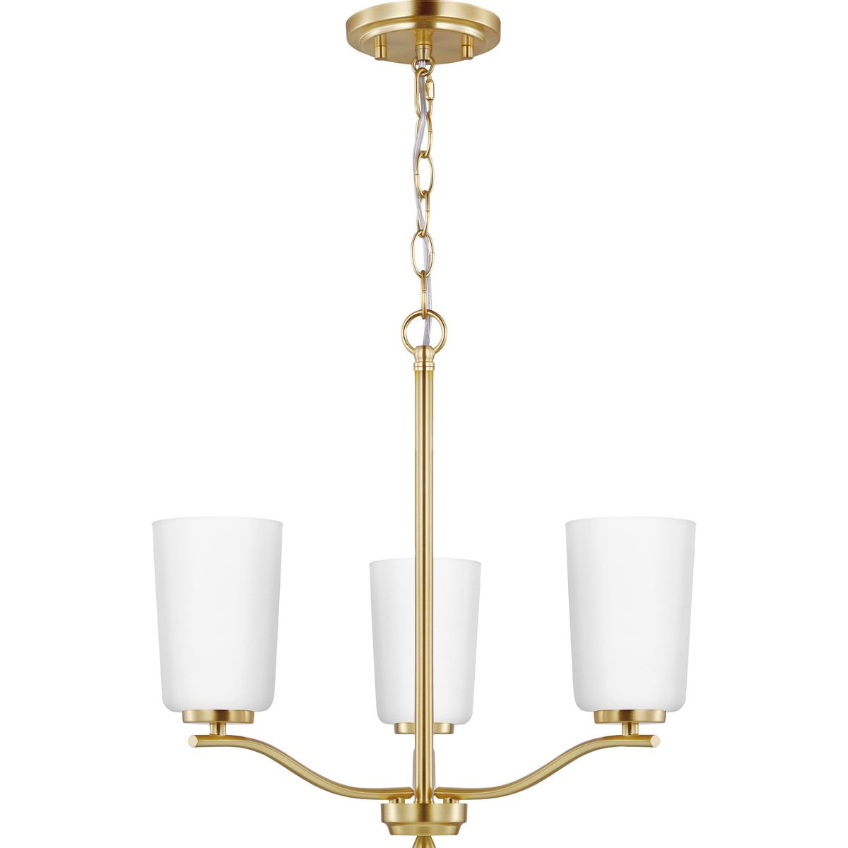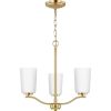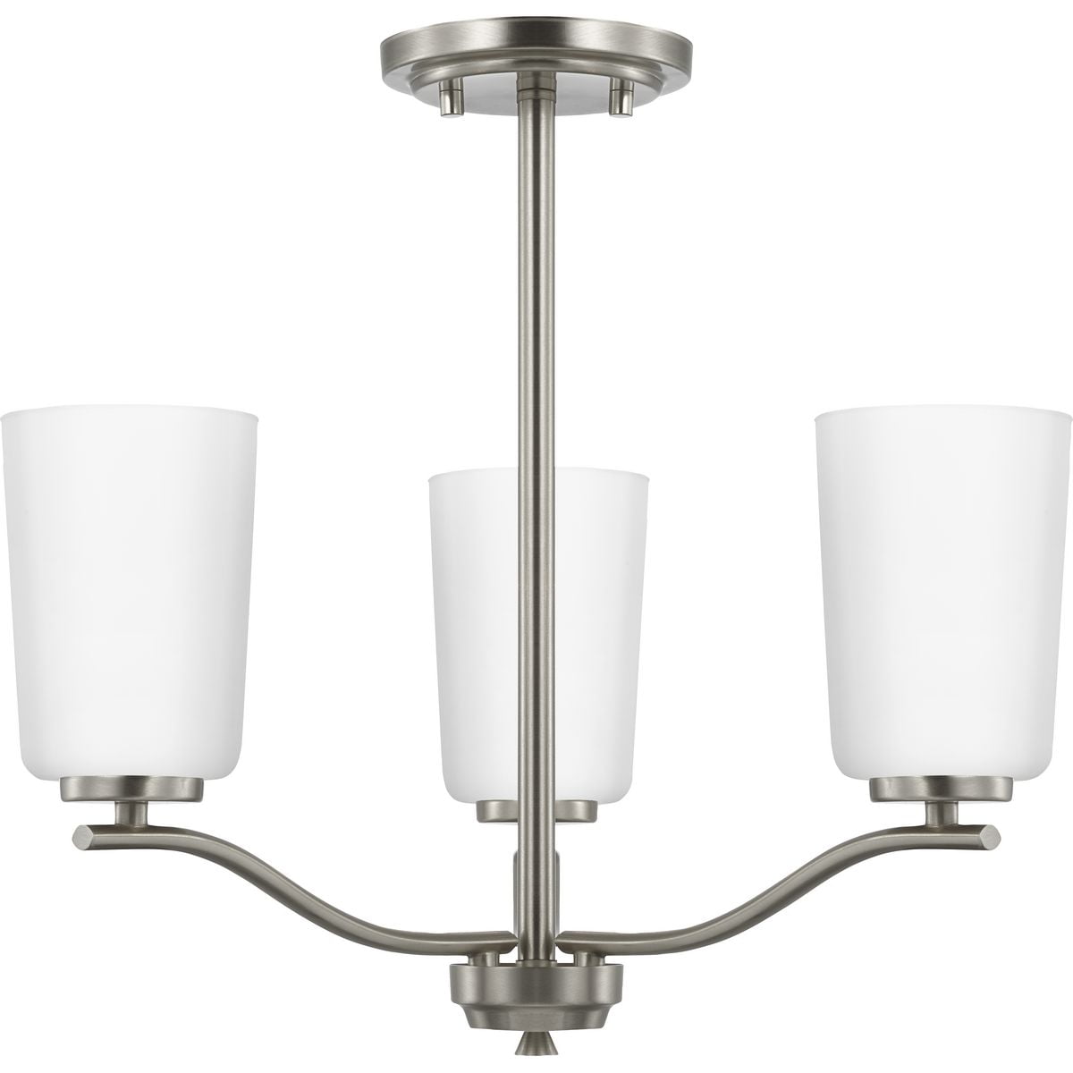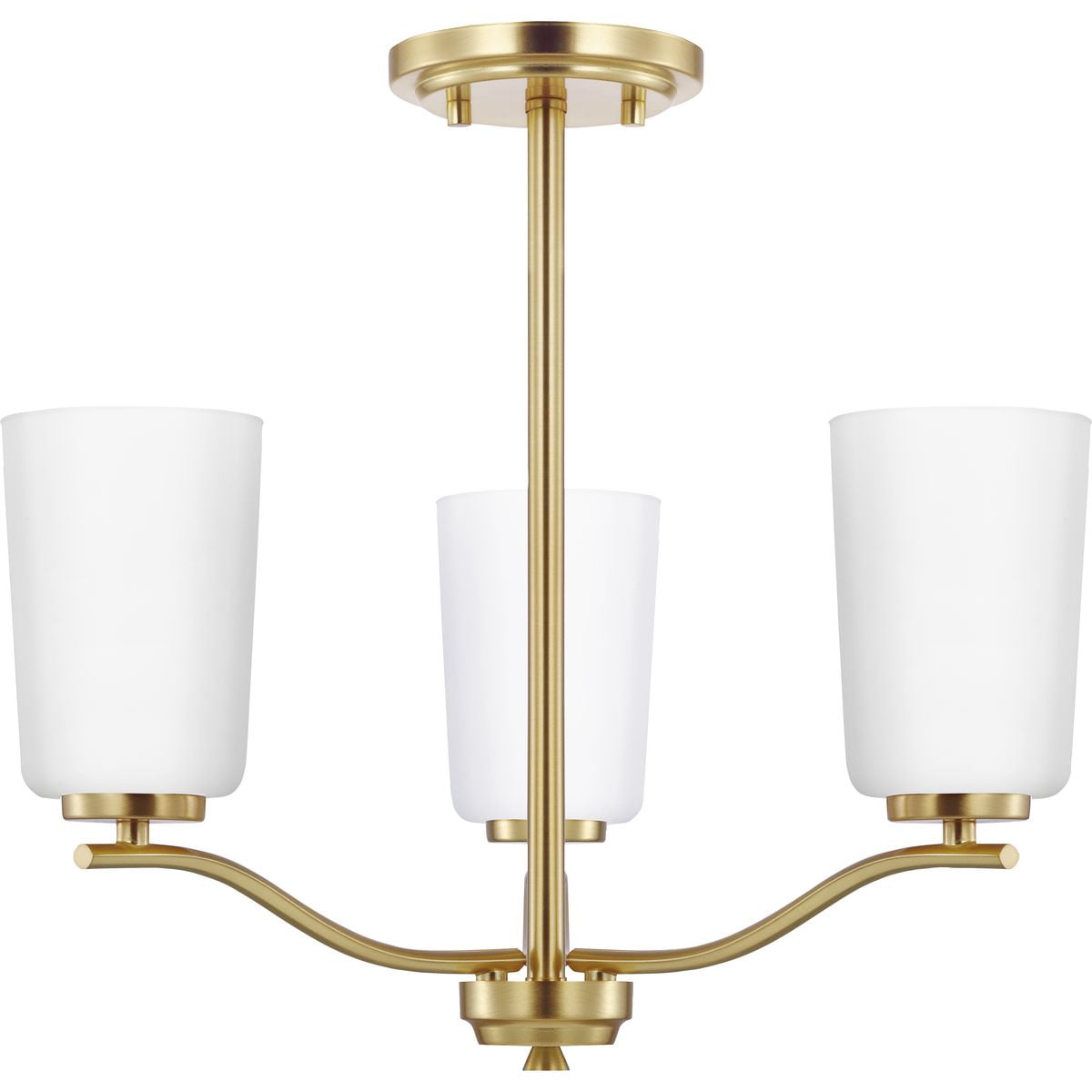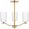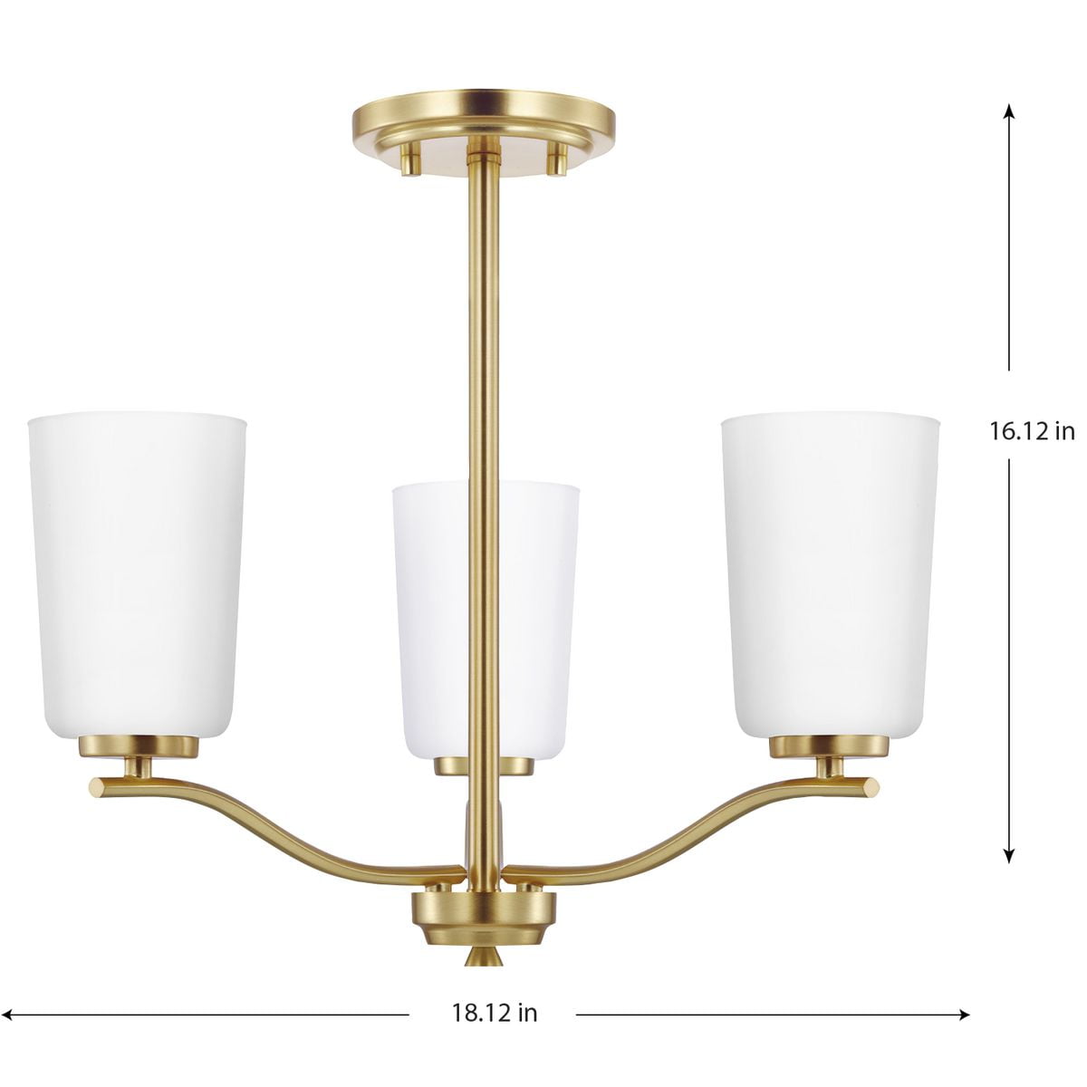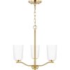 Fundamentally modern but with a traditional twist, the Adley semi-flush convertible chandelier combines etched white glass shades with a curved arms and simple, straight bars finished in satin brass. This light is an elegant choice for illuminating kitchens and breakfast nooks in transitional settings and contemporary settings. The fixture has 48 in. of chain to customize it for a variety of ceiling heights and can be used on a sloped ceiling.