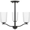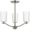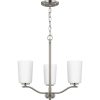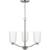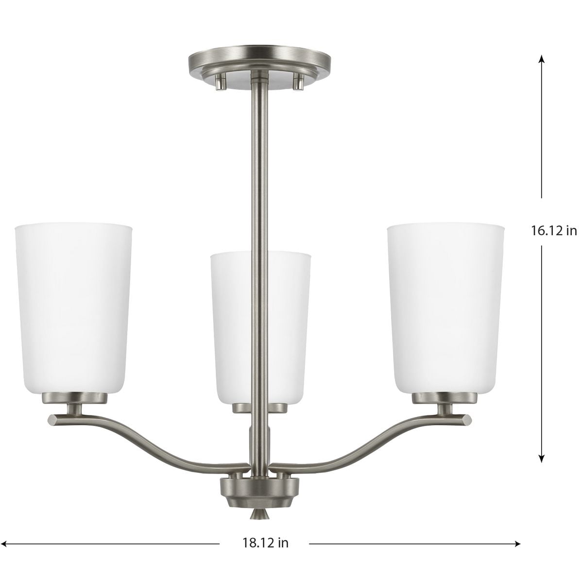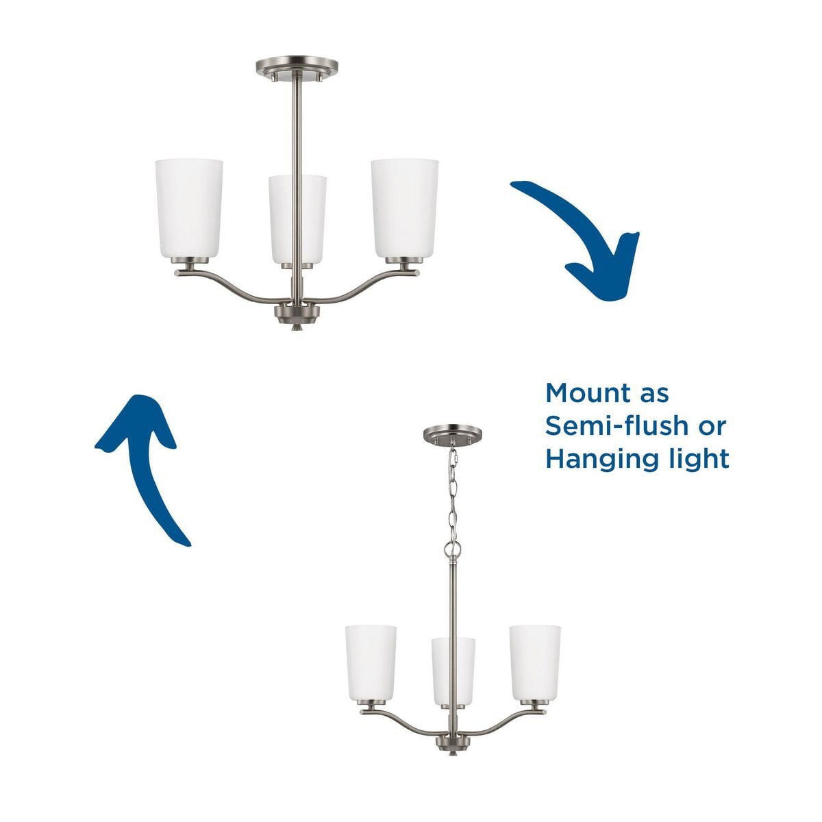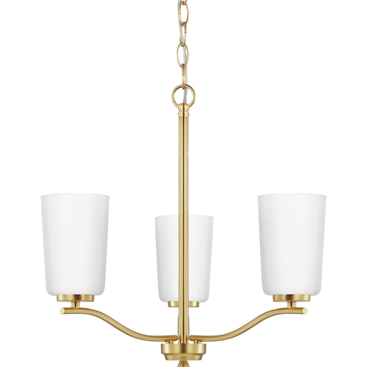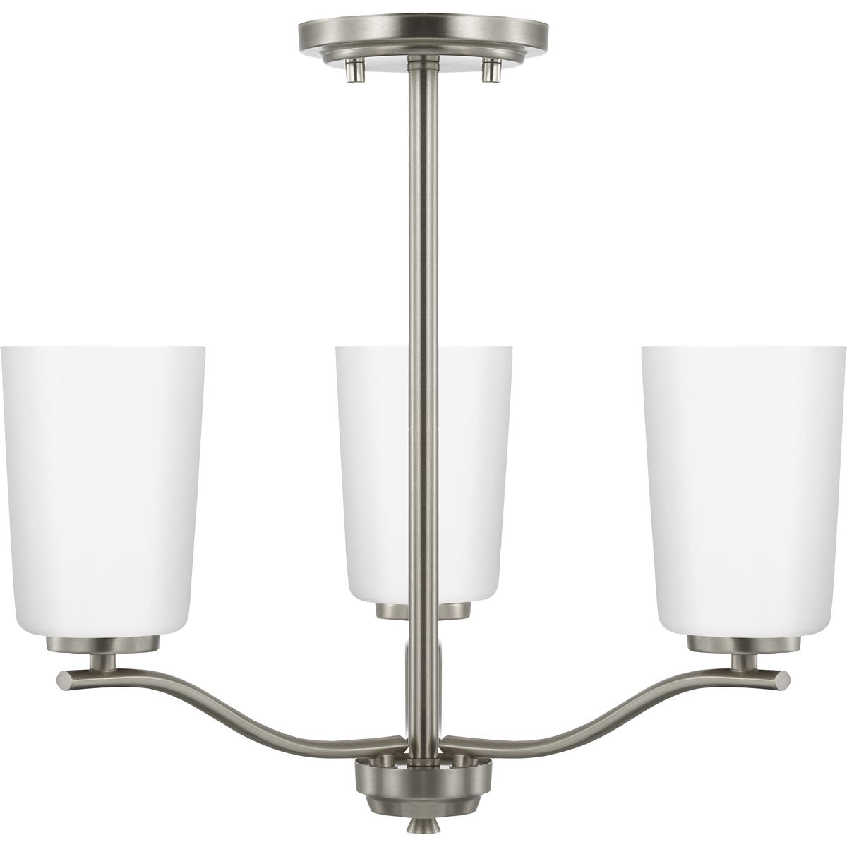 Fundamentally modern but with a traditional twist, the Adley semi-flush convertible chandelier combines etched white glass shades with a curved arms and simple, straight bars finished in satin brass. This light is an elegant choice for illuminating kitchens and breakfast nooks in transitional settings and contemporary settings. The fixture has 48 in. of chain to customize it for a variety of ceiling heights and can be used on a sloped ceiling.
