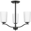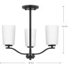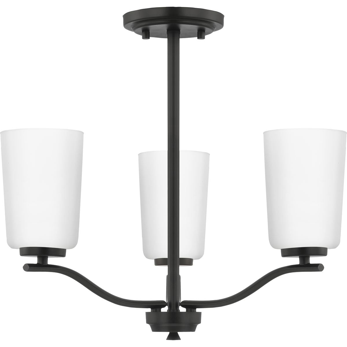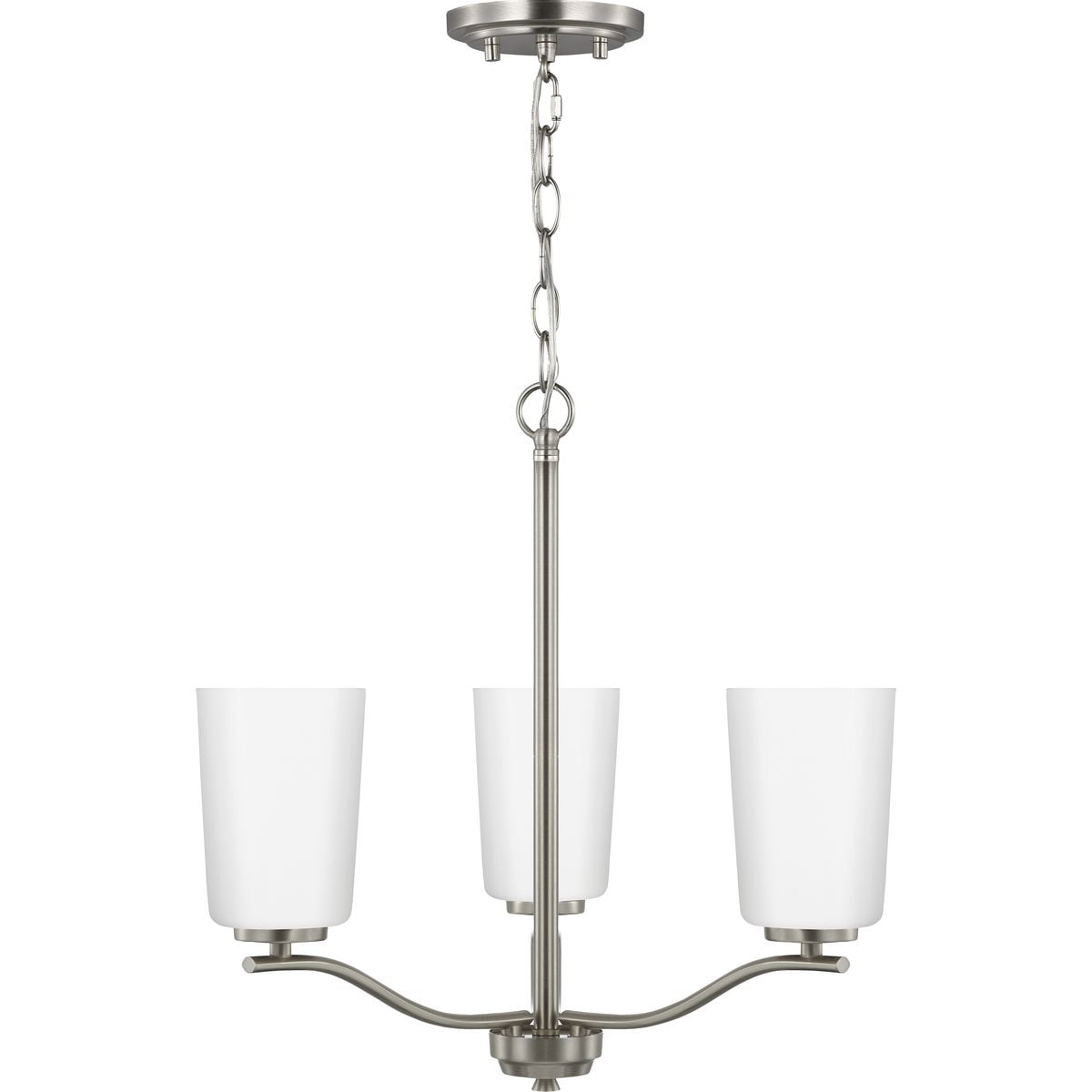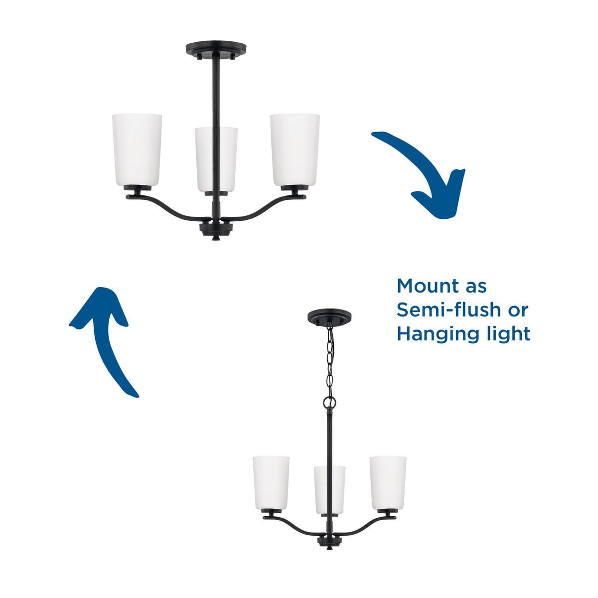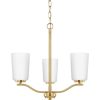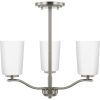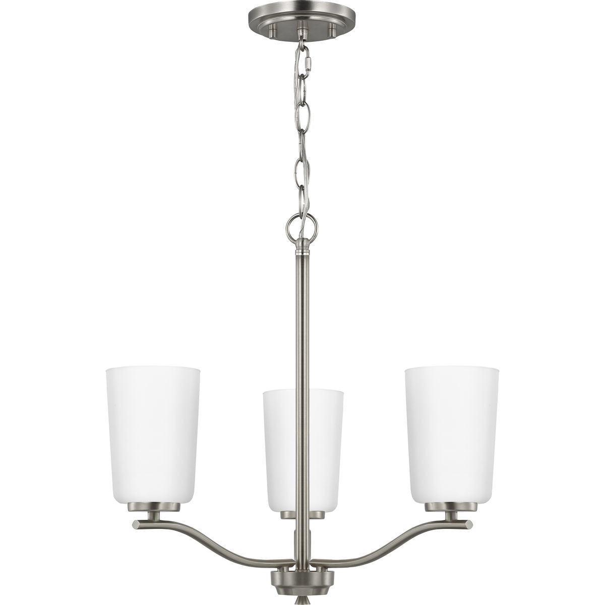 Fundamentally modern but with a traditional twist, the Adley semi-flush convertible chandelier combines etched white glass shades with a curved arms and simple, straight bars finished in satin brass. This light is an elegant choice for illuminating kitchens and breakfast nooks in transitional settings and contemporary settings. The fixture has 48 in. of chain to customize it for a variety of ceiling heights and can be used on a sloped ceiling.