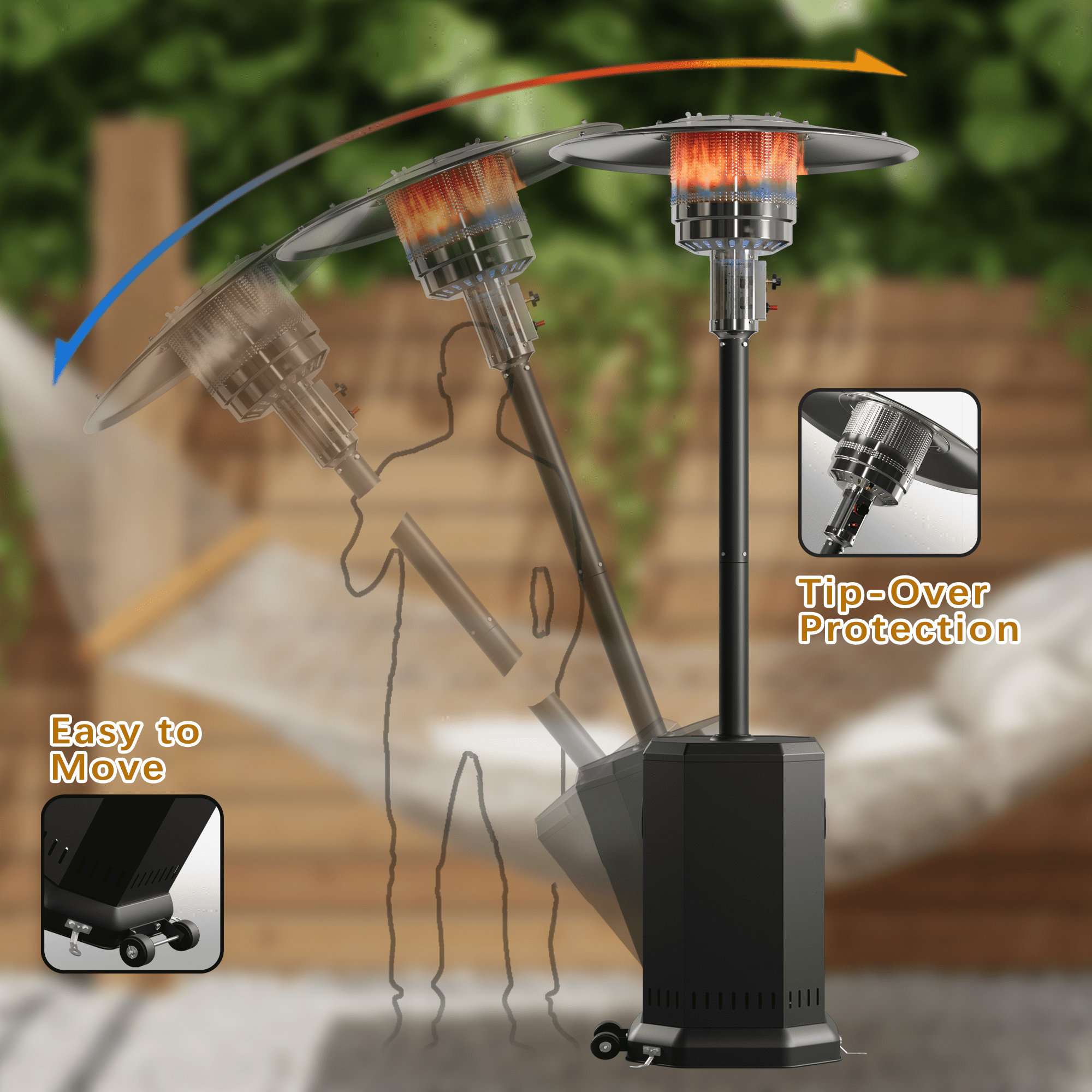 🛡️【Easy Mobility】 – Equipped with two smooth-rolling wheels, simply tilt and push to move the heater wherever warmth is needed.