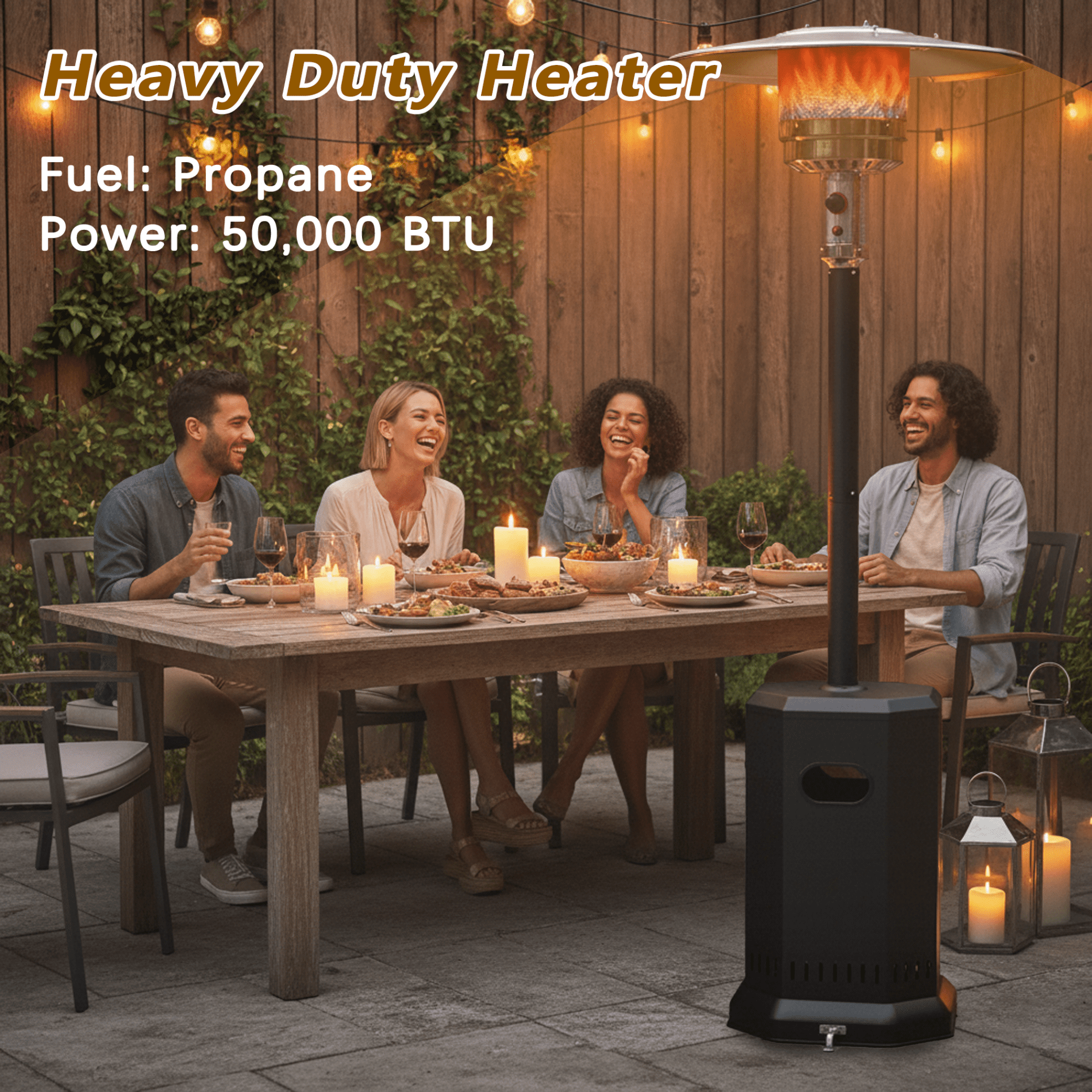 Enjoy instant comfort with this heavy-duty patio propane heater for outdoor use, delivering an impressive 50,000 BTU of heat output to warm up your space within minutes. Built with premium stainless steel for all-weather durability, this heater is safe, portable, and designed for long-lasting performance. Perfect for patios, backyards, gardens, parties, and outdoor gatherings.