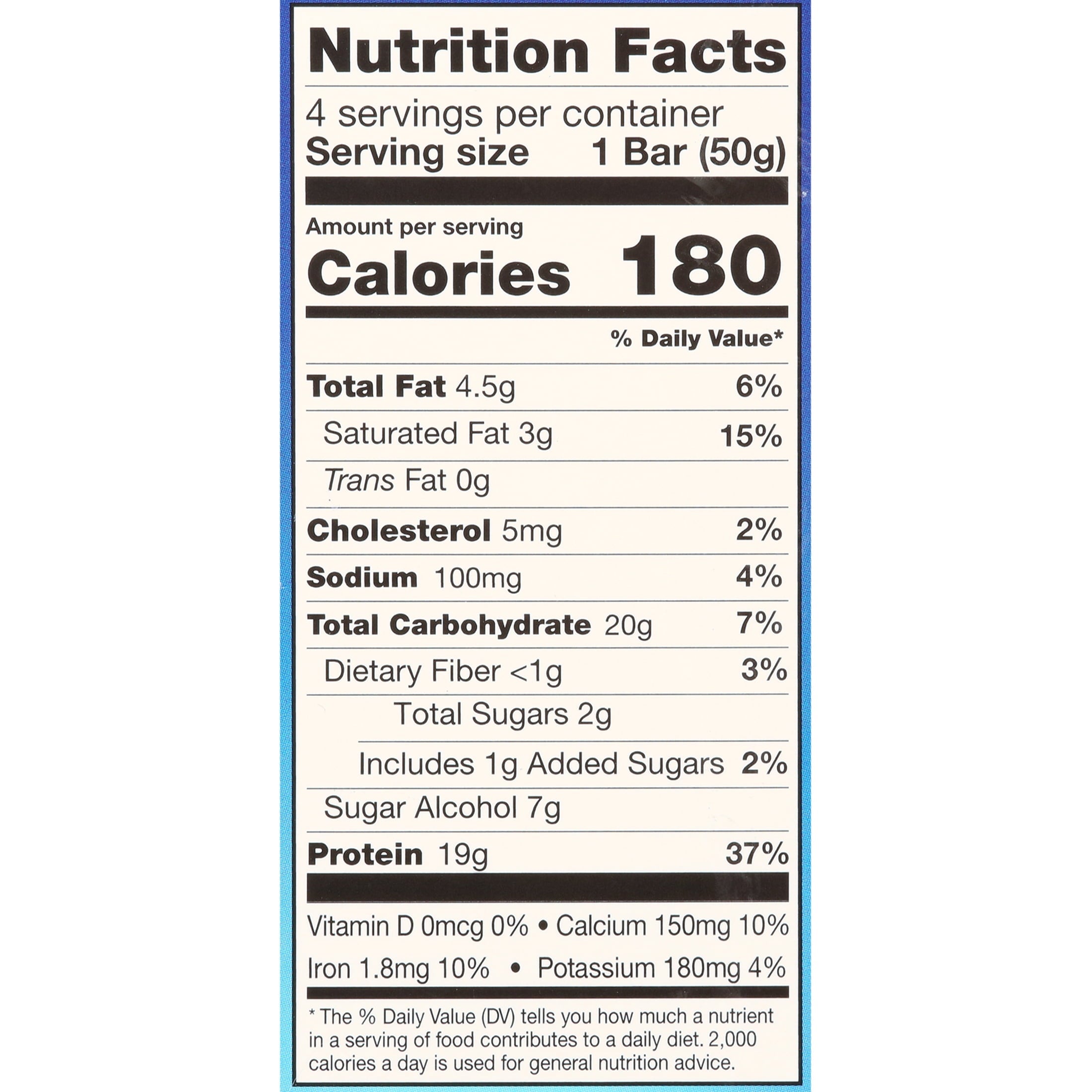 - Low sugar protein bars each contain 19 grams of protein, 2 grams of sugar, and 180 calories