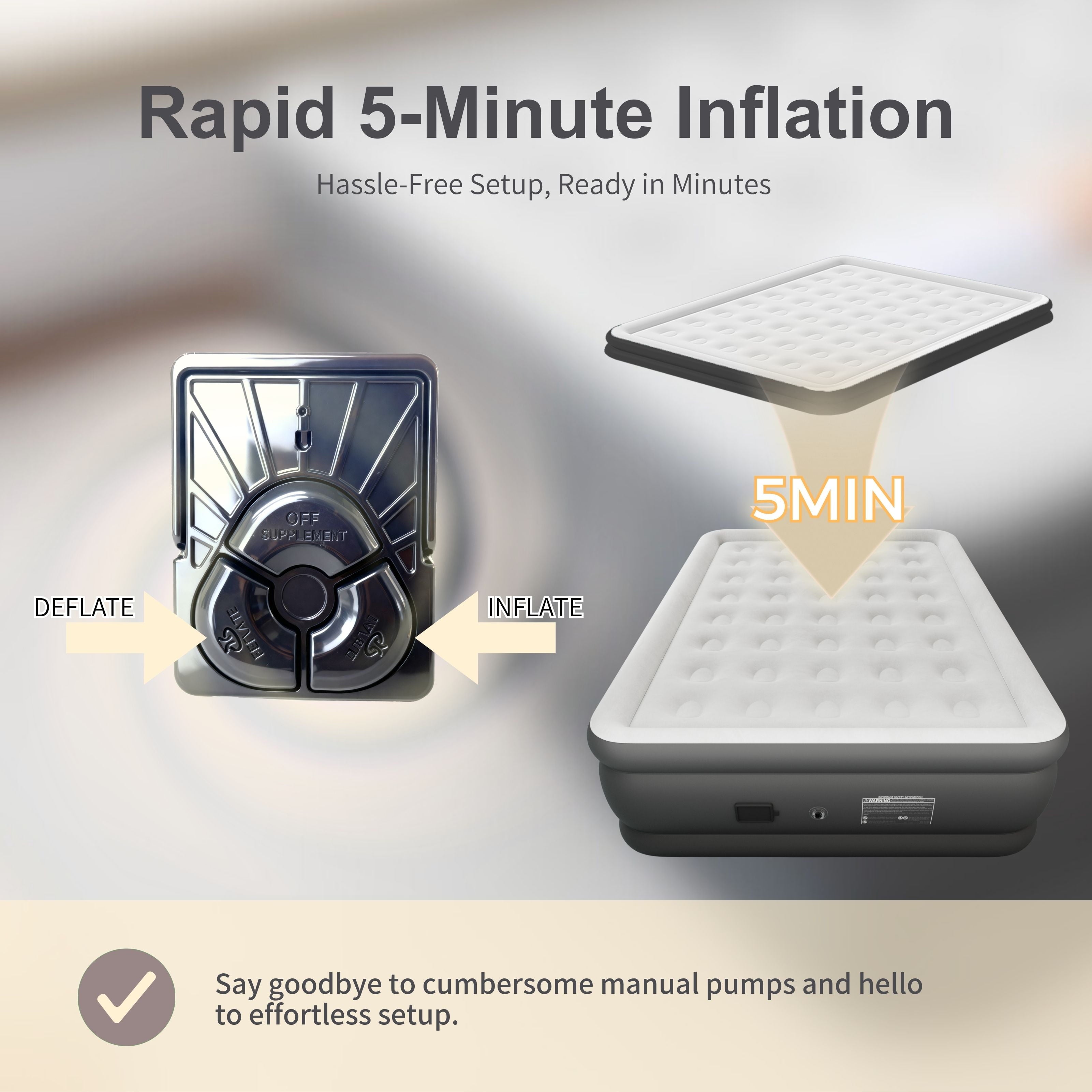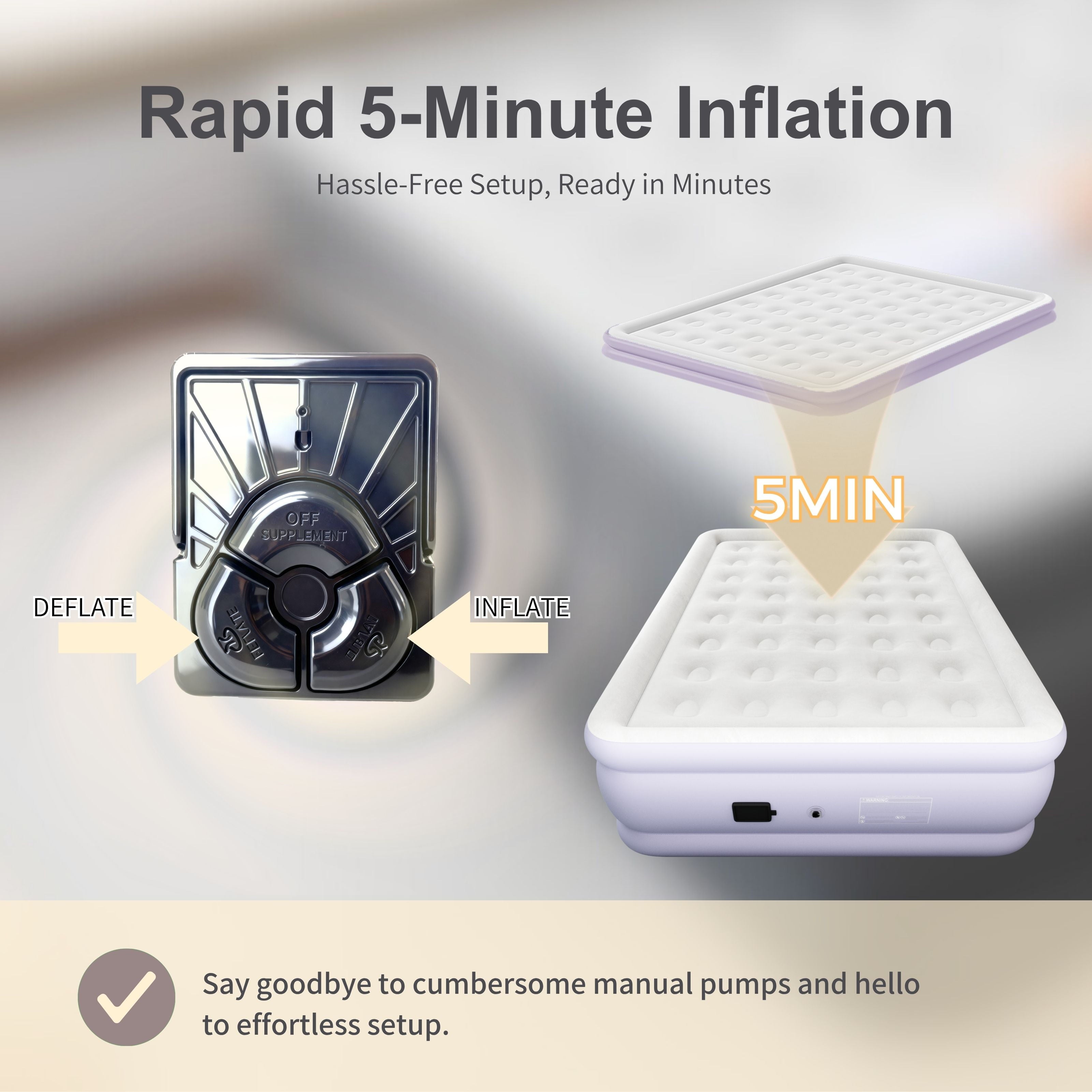 - 【 Three minute self inflation/deflation 】: While keeping the inflation pump fully charged, gently press the knob and quietly inflate/deflate the air cushion within 3 minutes. You can effortlessly adjust the softness and tightness to fit the curves of your body, enhancing your sleep experience.
