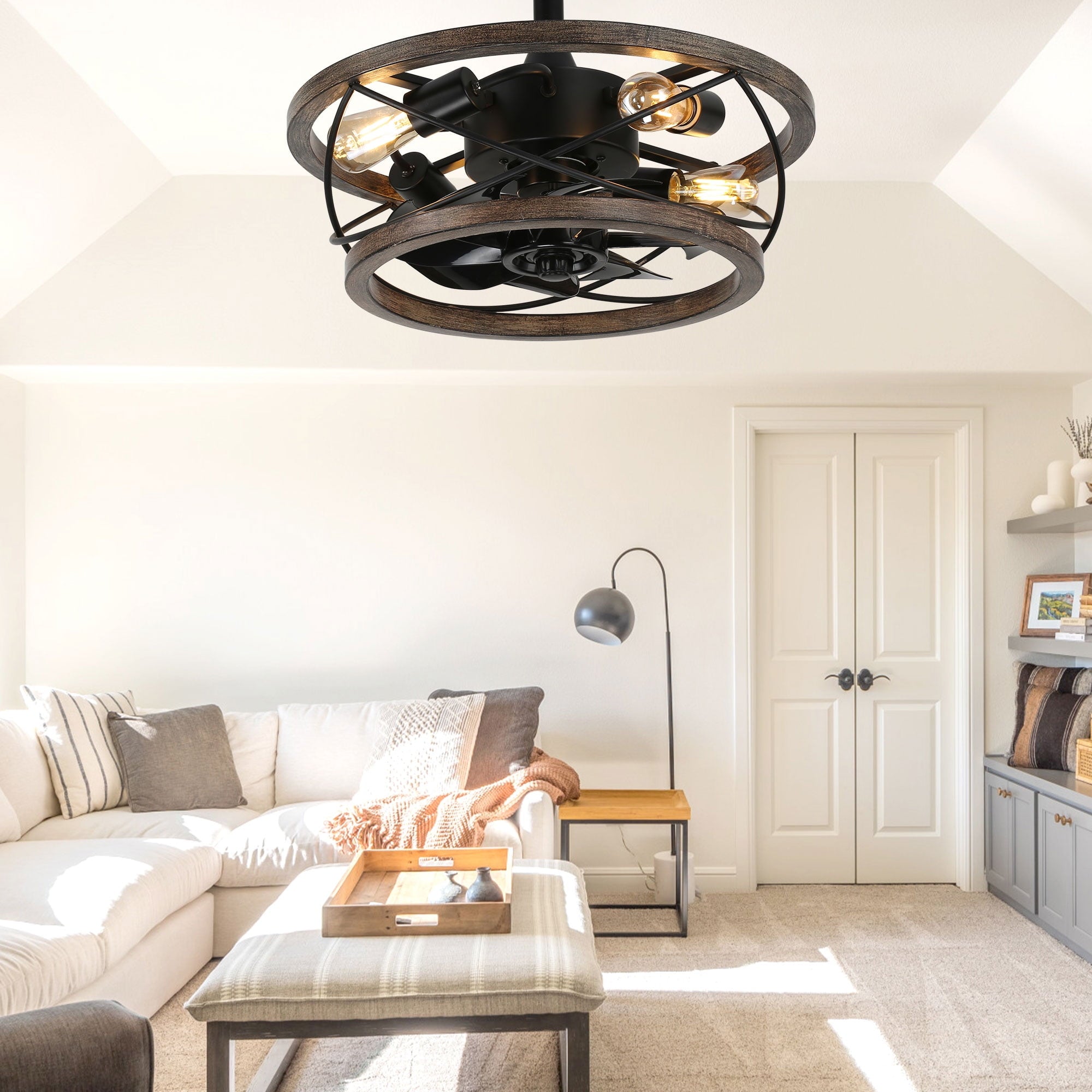 Brighten up your lovely room with this wood-caged ceiling fan from Bella Depot. Its gorgeous appearance is considered high quality. It has seven black blades to bring strong wind to chase the heat in summer and can also reverse the air in winter. Add this simple and charming ceiling fan to your farmhouse room right now