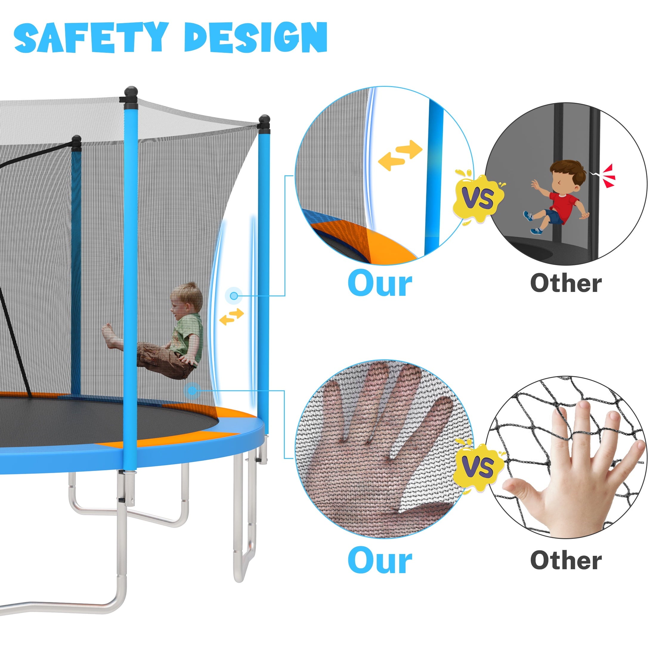 🛝360-degree High-density Safety Net — The first duty of SEGMART is to protect the safety of users. Trampolines with enclosure for full protection. 72 inches of high-density PE safety netting is UV-resistant, water-resistant, and tear-resistant.