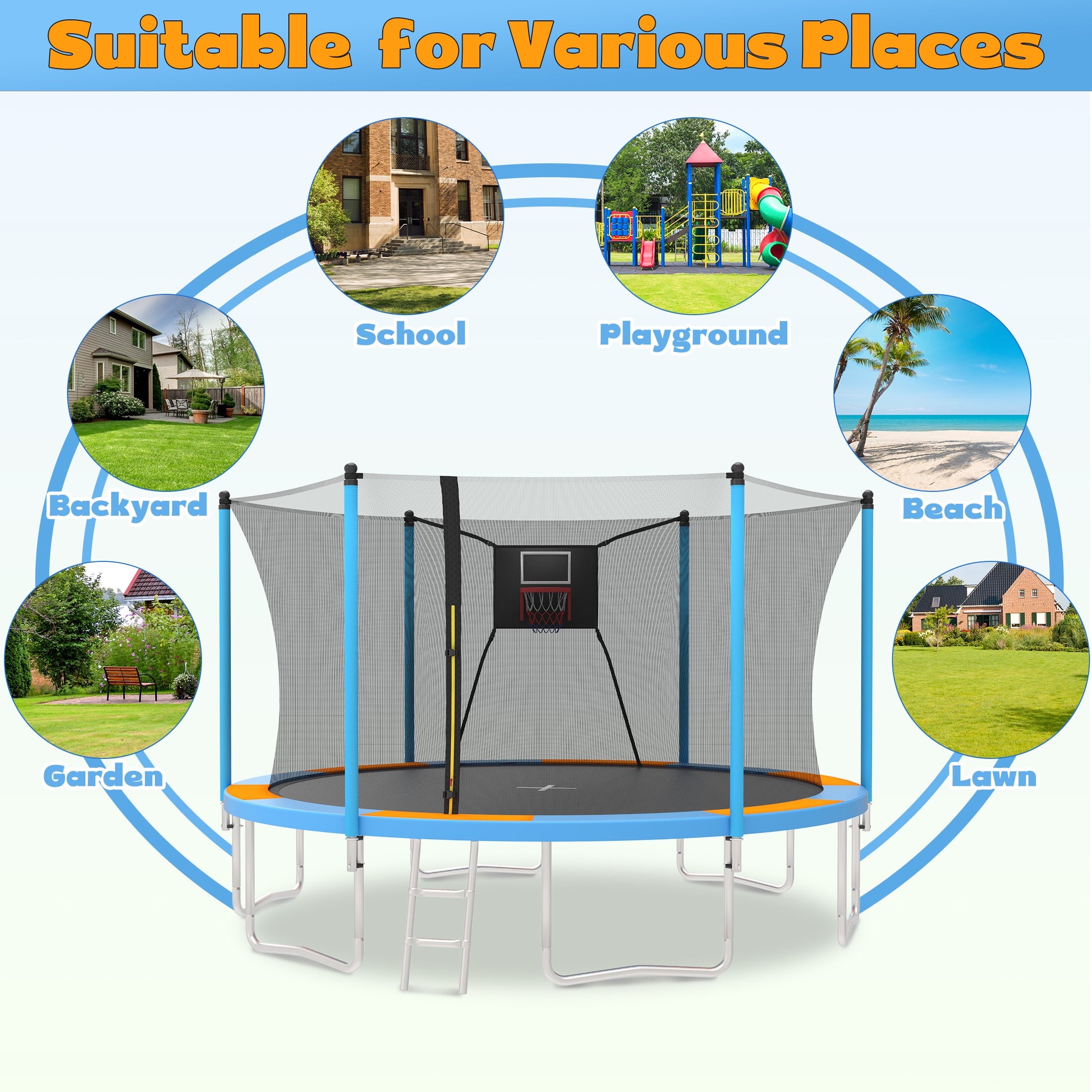 - <🥳1000LBS Weight Capacity > SEGMART 14ft trampoline with basketball hoop, designed with 6 enhanced W-shaped legs provides 12 balanced contact points to increase the stability of the trampoline. Upgraded T-shaped joint tube ensures the tight connection of the trampoline structure. NOTE: To avoid the jumping mat reaching the ground and causing injuries, the weight limit is 1000LBS.