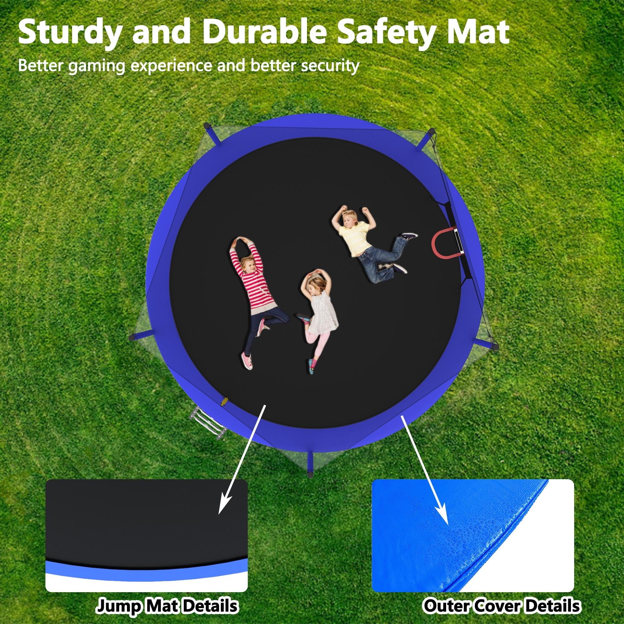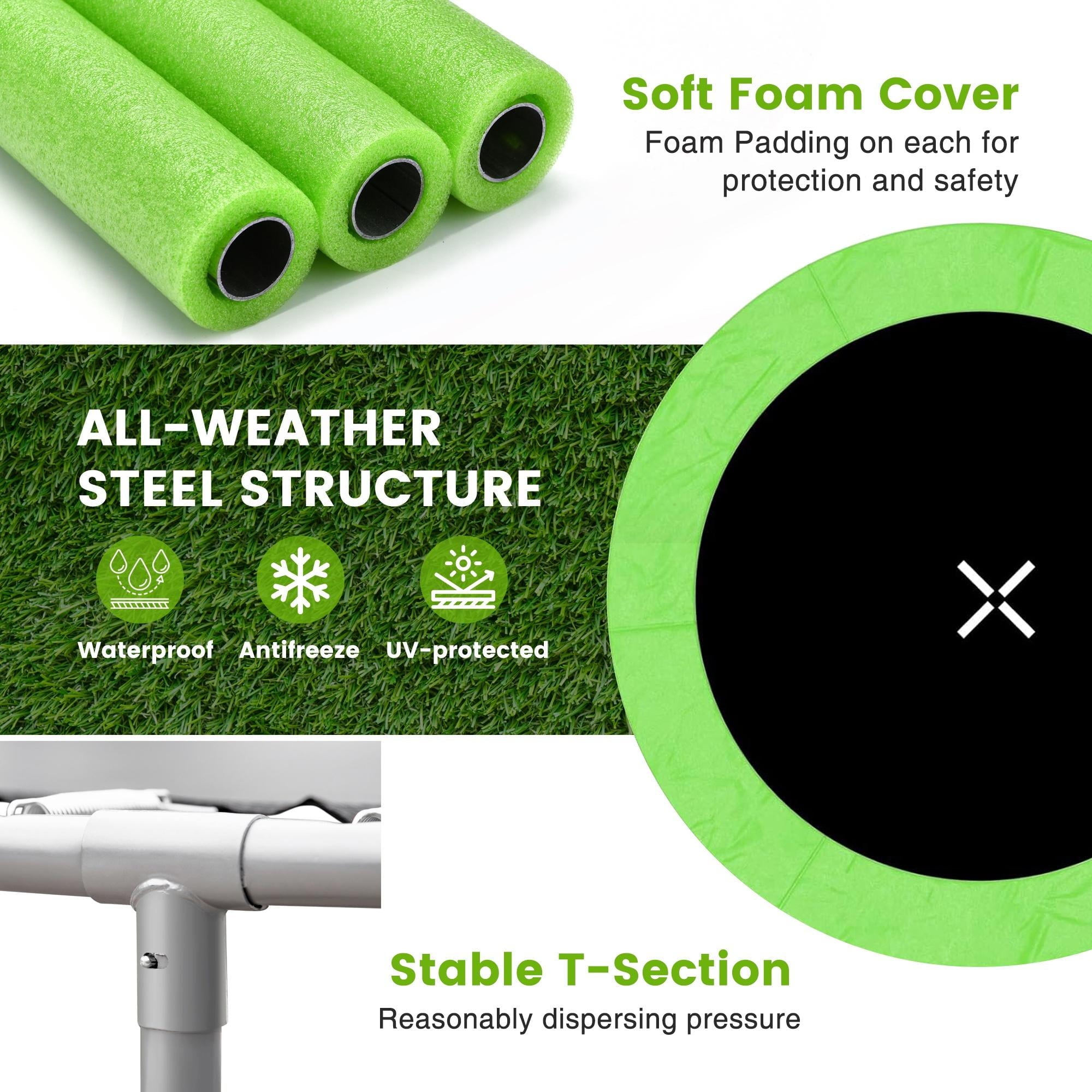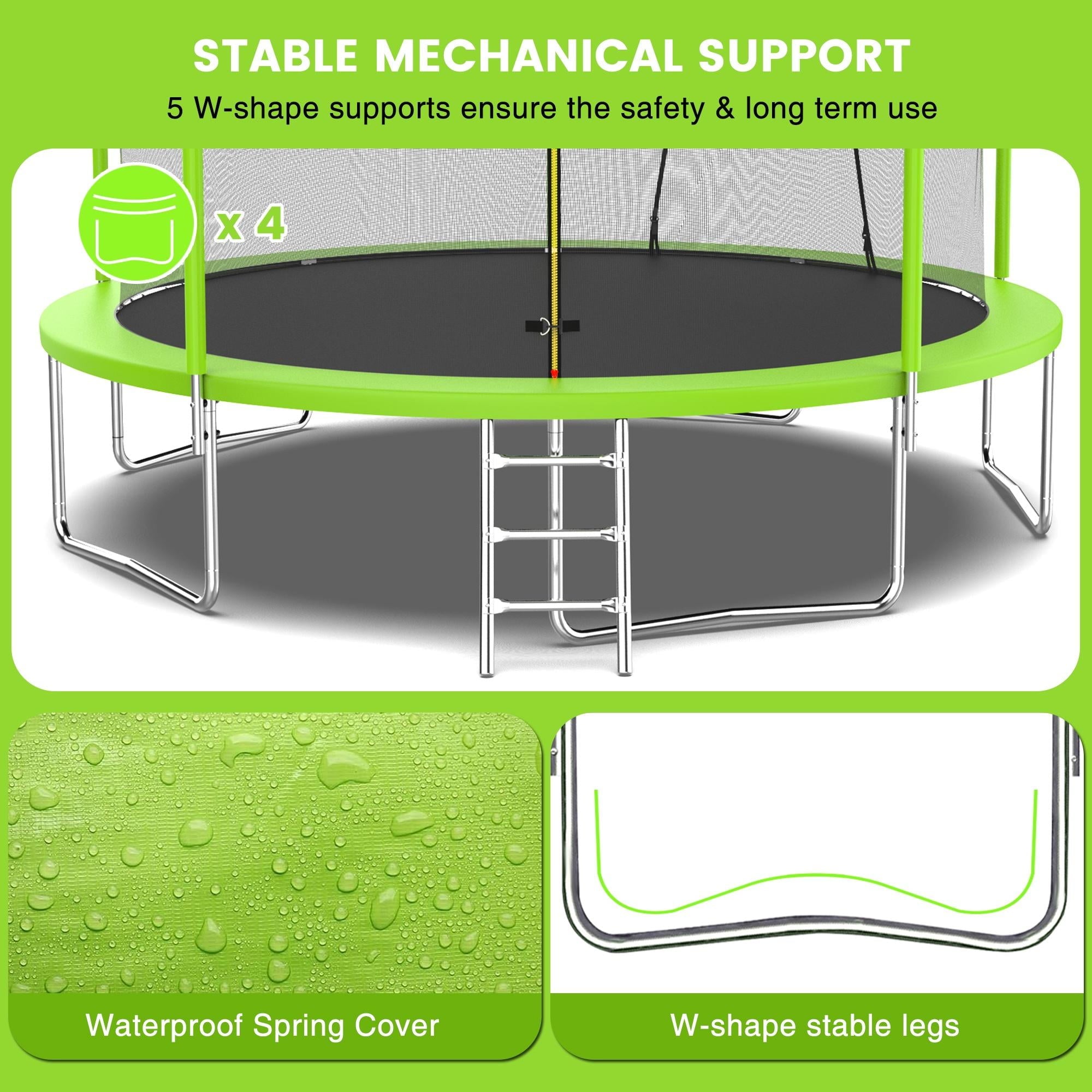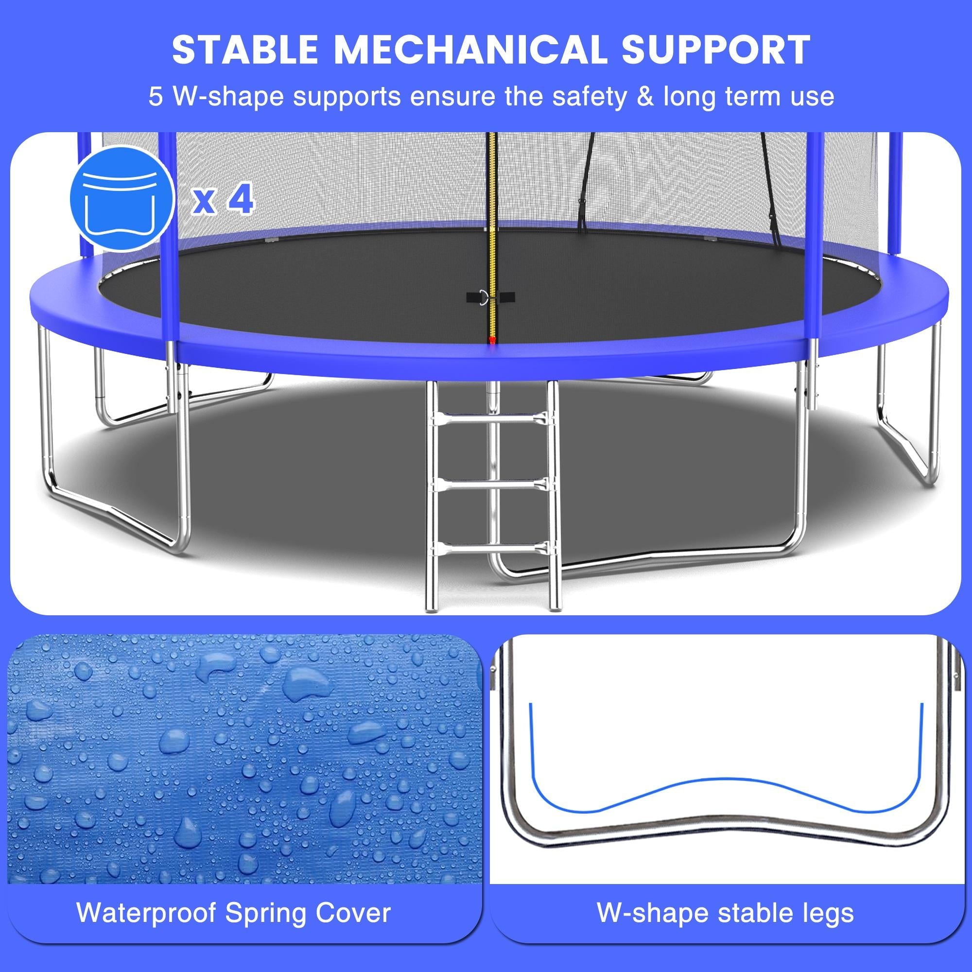 5. Upgraded safety – 360° high-density fence and double safety zippers, provide double protection for this outdoor trampoline.