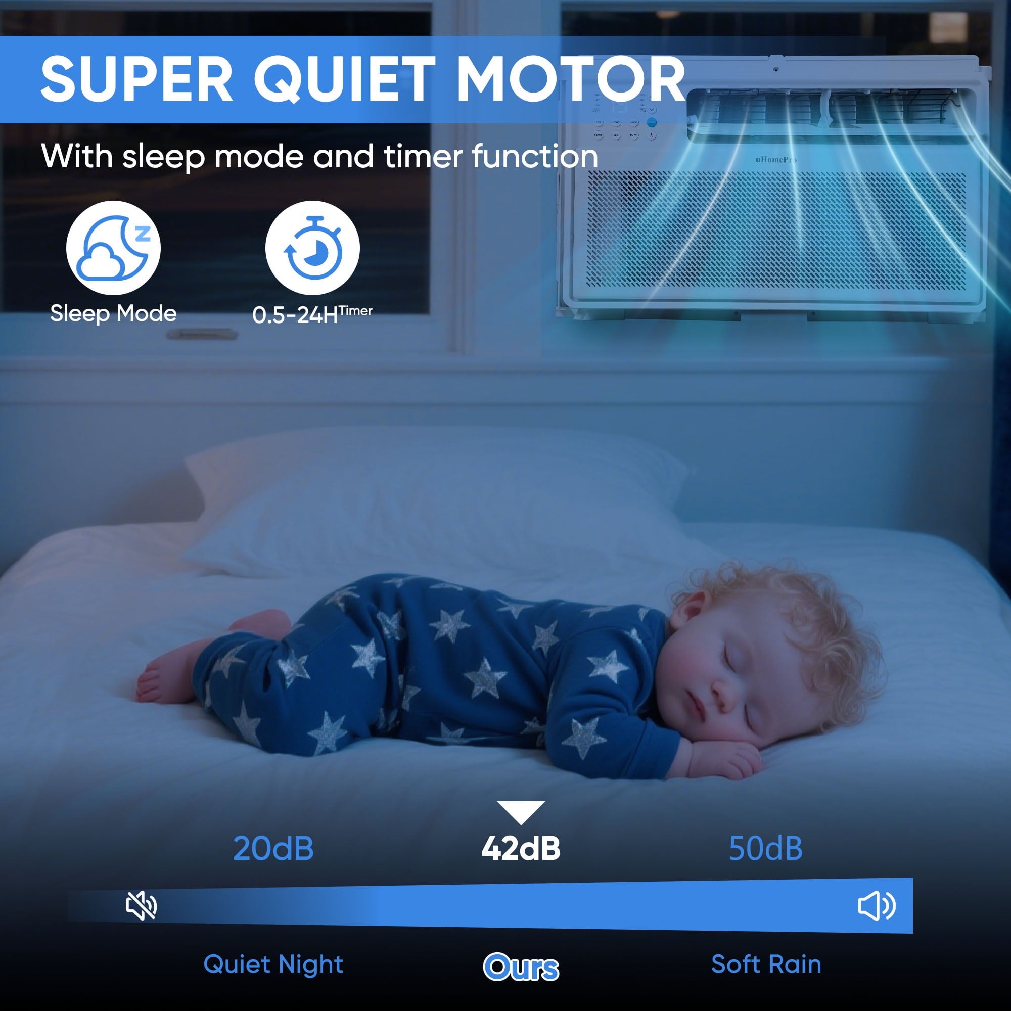 – [Super Quiet Operation]: With an indoor noise level as low as 42dB, our unit is quieter than a typical library (40dB) and significantly quieter than conventional air conditioners, providing a peaceful environment for relaxation, work, or sleep.