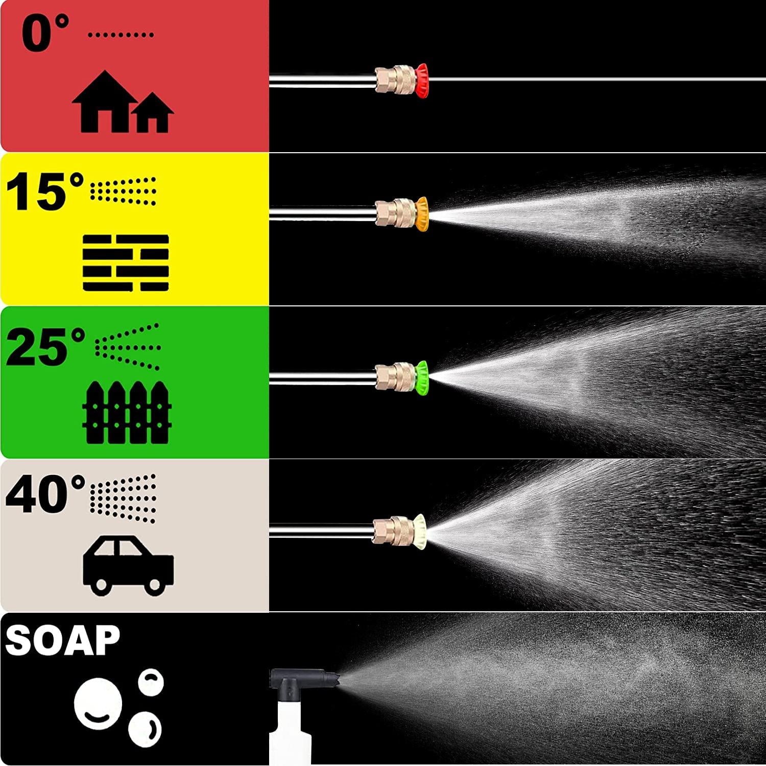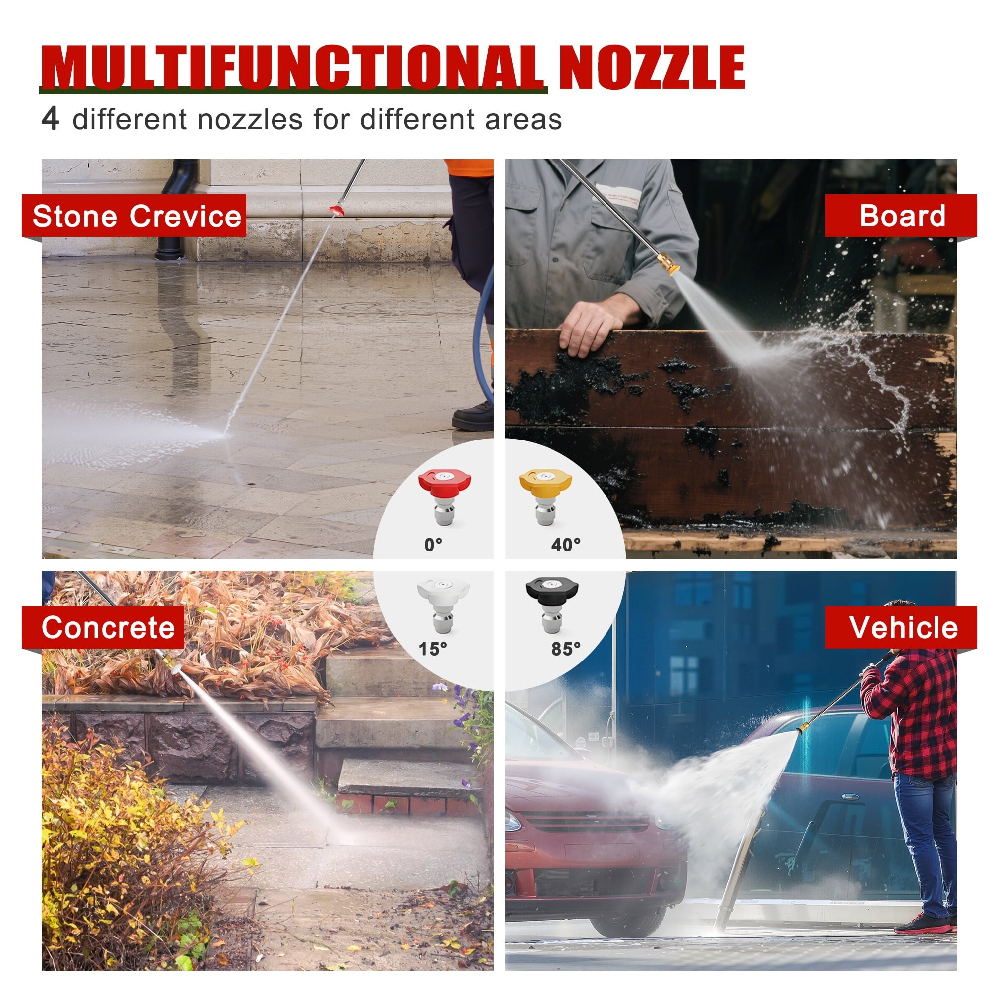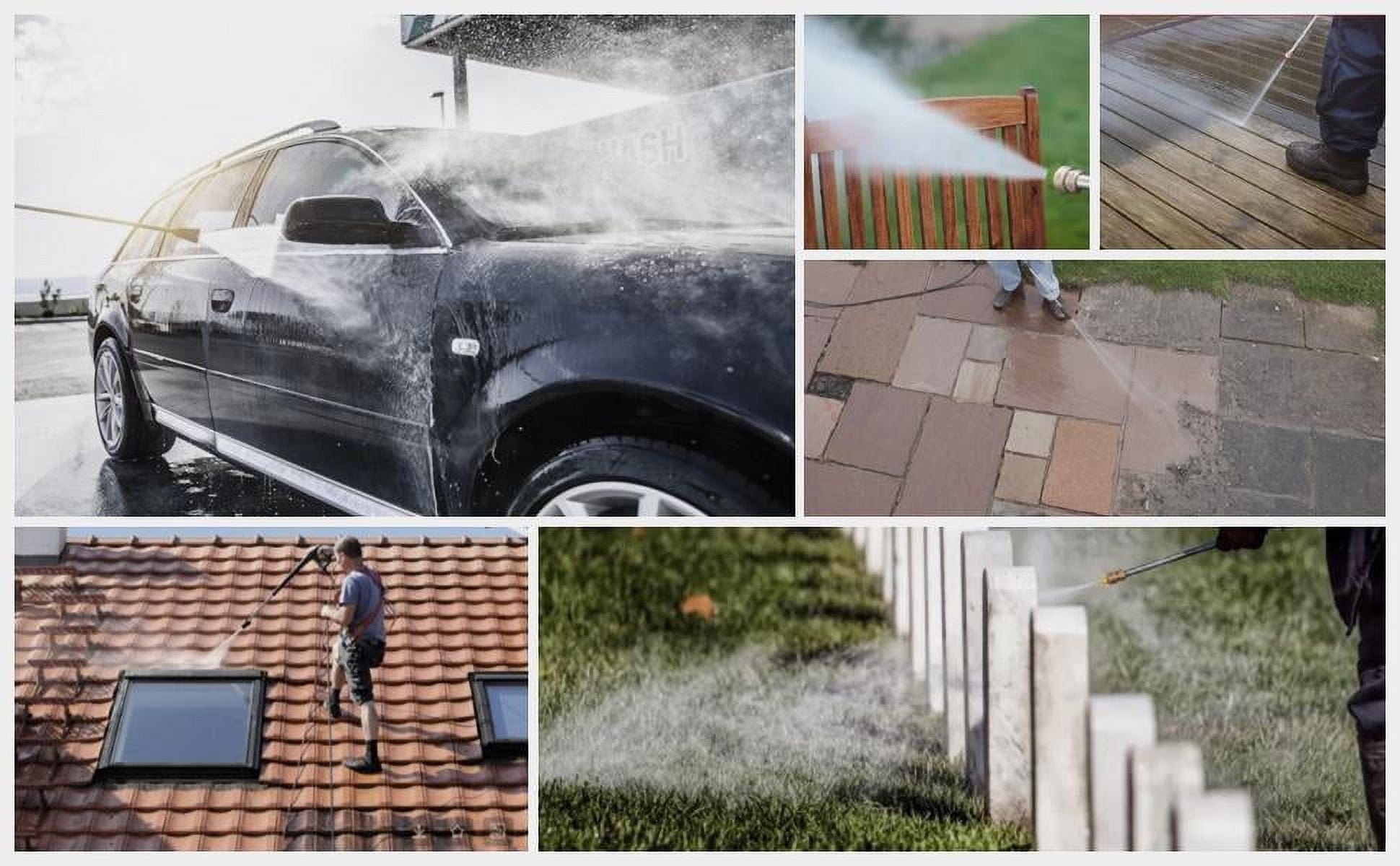 • ✔️[Multi-Surface Cleaning] -Includes 4 quick-connect nozzles (0°, 25°, 40°, 85°) for precision cleaning—from high-pressure blasting to gentle rinsing. Ideal for decks, vehicles, outdoor furniture, and pre-paint surface prep.